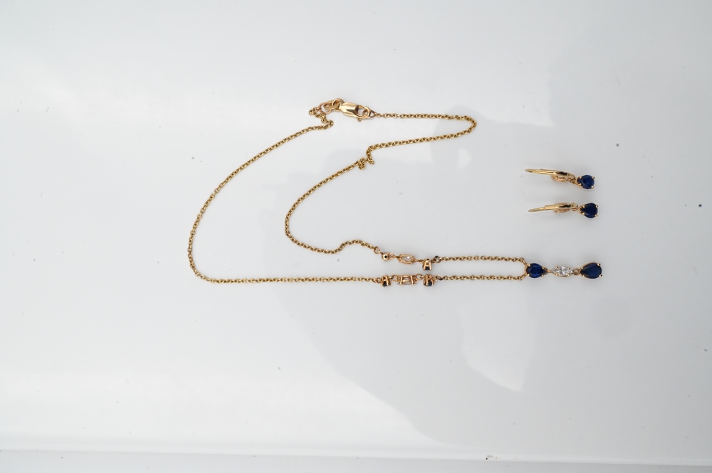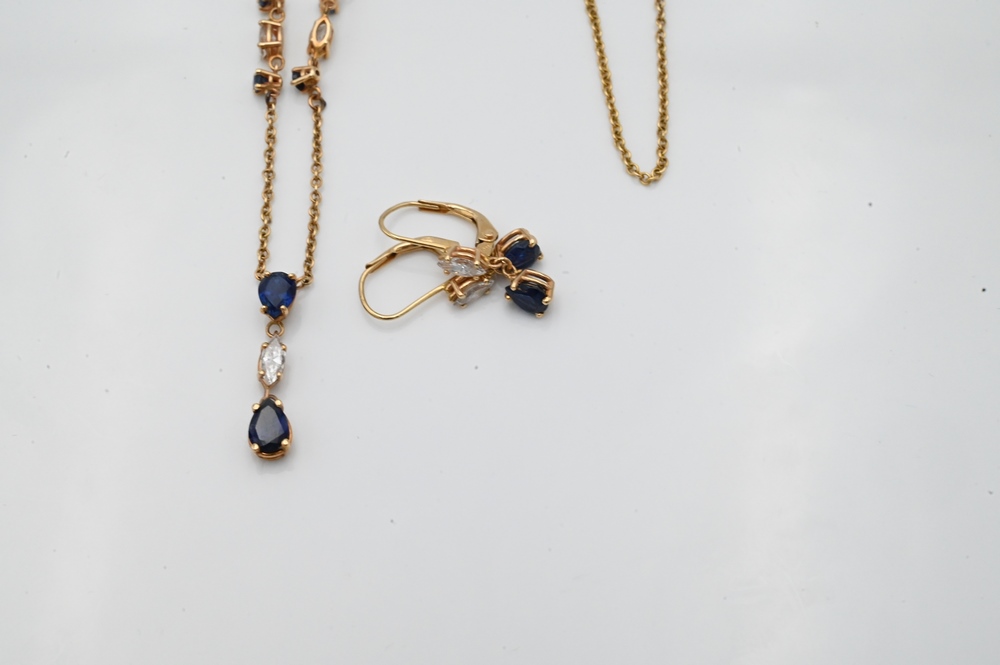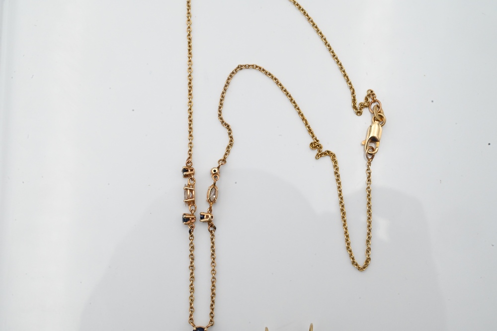 Three Piece Lot, to include 14 karat gold necklace along with pierced earrings, each set with diamonds and blue sapphires, length 16 1/2 inches, 6 grams.