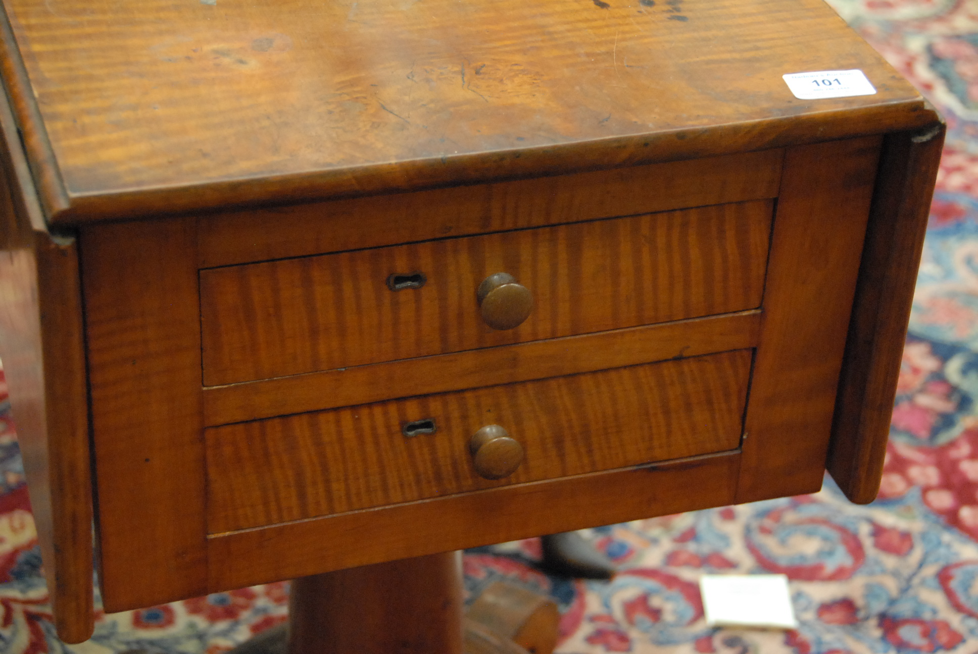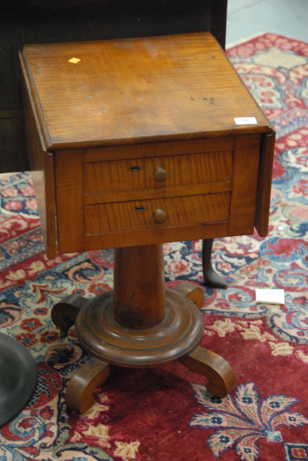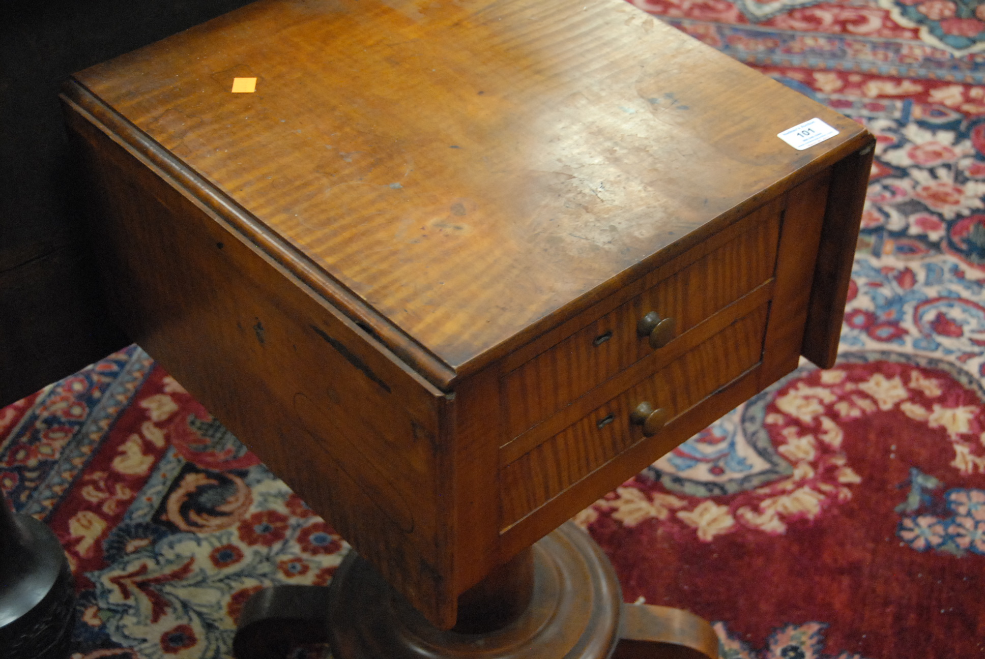 Tiger maple two drawer stand with drop leaves on pedestal base.
