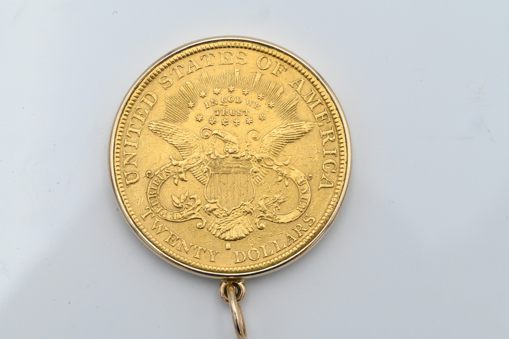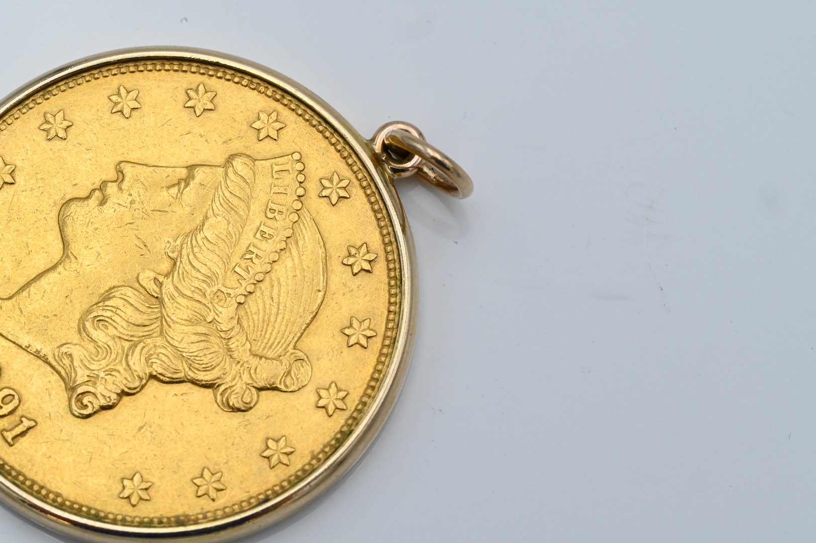 Twenty Dollar Liberty Gold “1891 S” mounted in ring for medallion total weight 36 grams Condition: not graded, as is