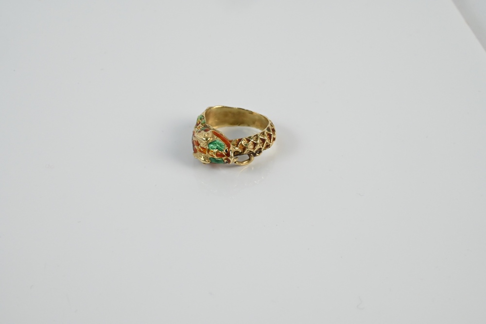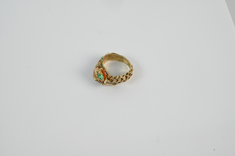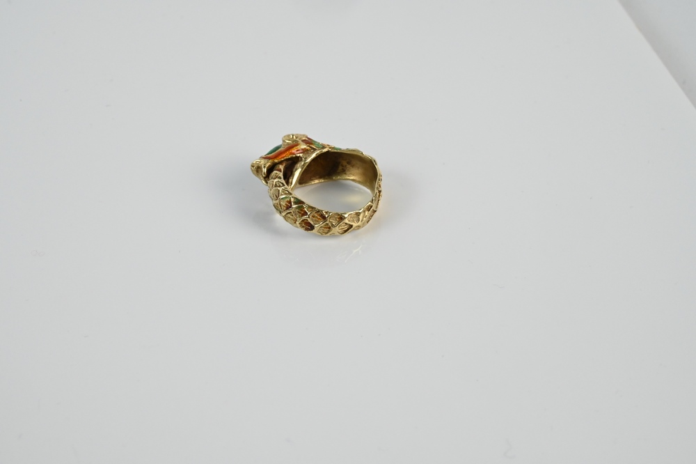 Lot 102: 14 Karat Gold Enameled Snake Ring, some enameling missing, size 3 1/2, 7.1 grams.