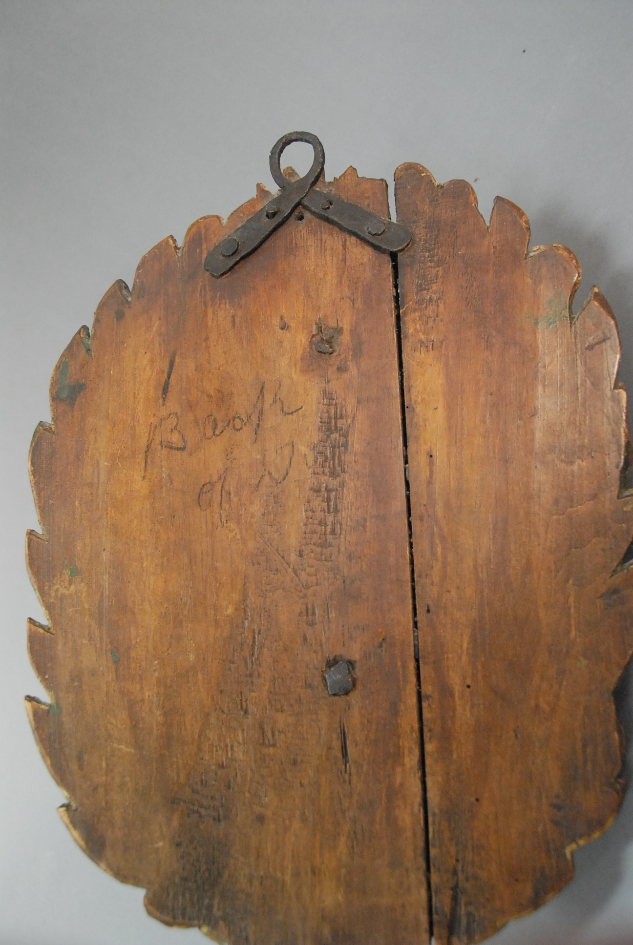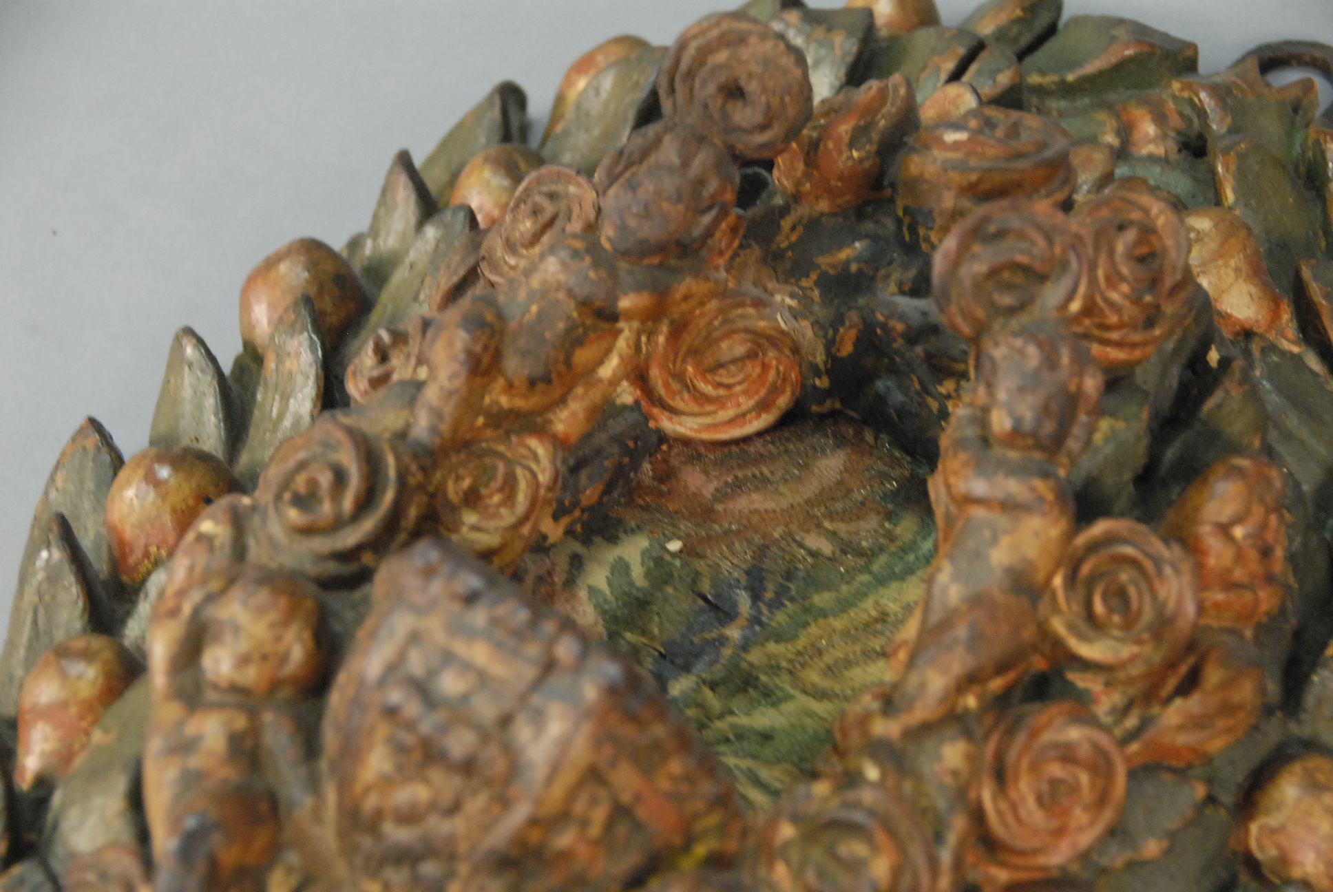 Lot 102: Continental Baroque carved and polychromed wood wall sconce in deep relief, centering a basin with needlework back flanked by putti with fruiting foliate decoration overall, possibly in original paint, 18th century. ht. 15in. wd. 11in.