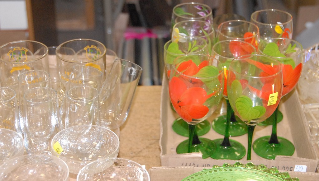 Five box lots of stemware painted stemware, set of five Waterford glasses, two Waterford salt and pepper, Tiffany & Co glasses, etc. Provenance: Estate of Judy Gengras McDonough of West Hartford, CT.