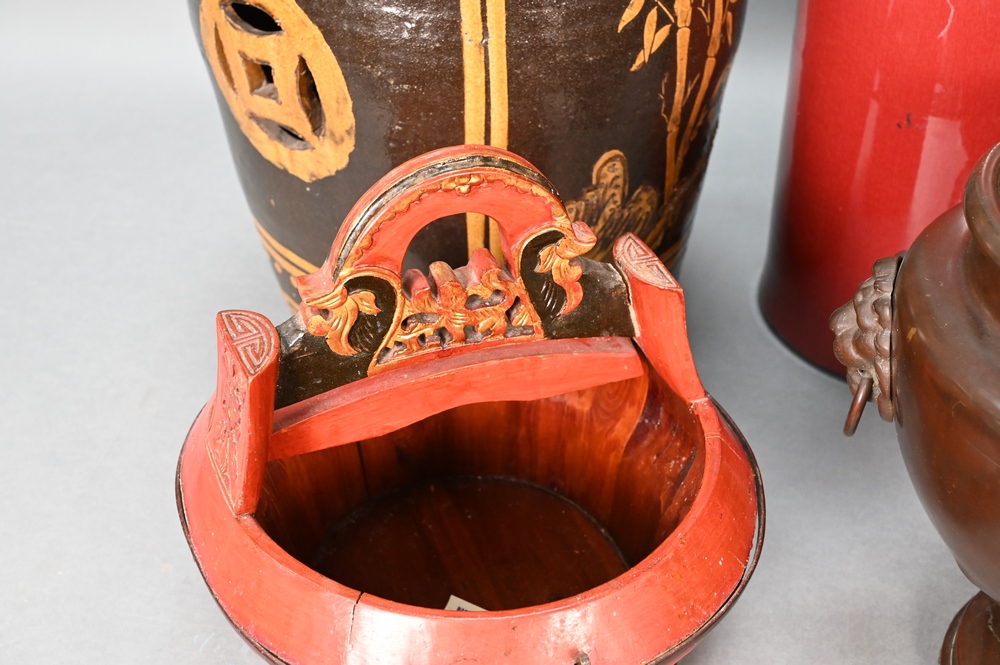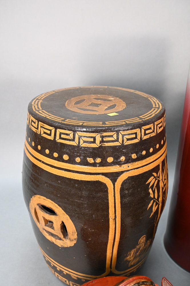 Five Piece Group of Assorted Asian Items, to include sang de boeuf umbrella stand, green glazed vase with applied mask, brown and yellow glazed garden seat, bronze pot and red lacquered box, tallest 24 1/2 inches.