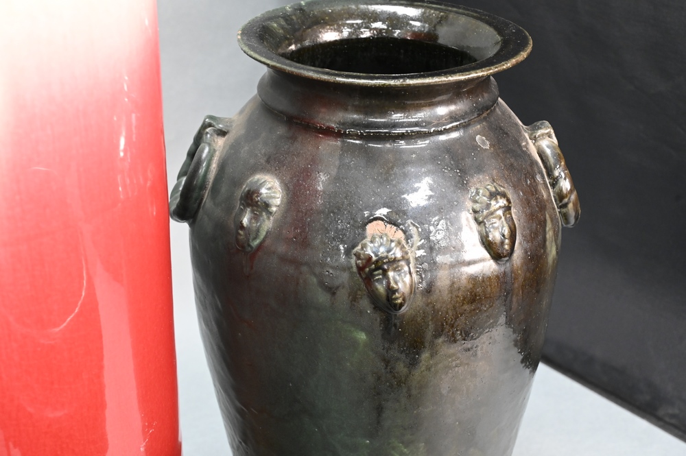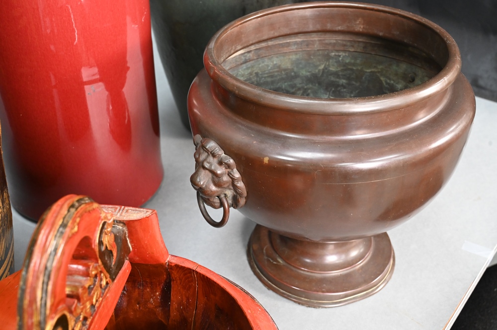 Lot 102: Five Piece Group of Assorted Asian Items, to include sang de boeuf umbrella stand, green glazed vase with applied mask, brown and yellow glazed garden seat, bronze pot and red lacquered box, tallest 24 1/2 inches.
