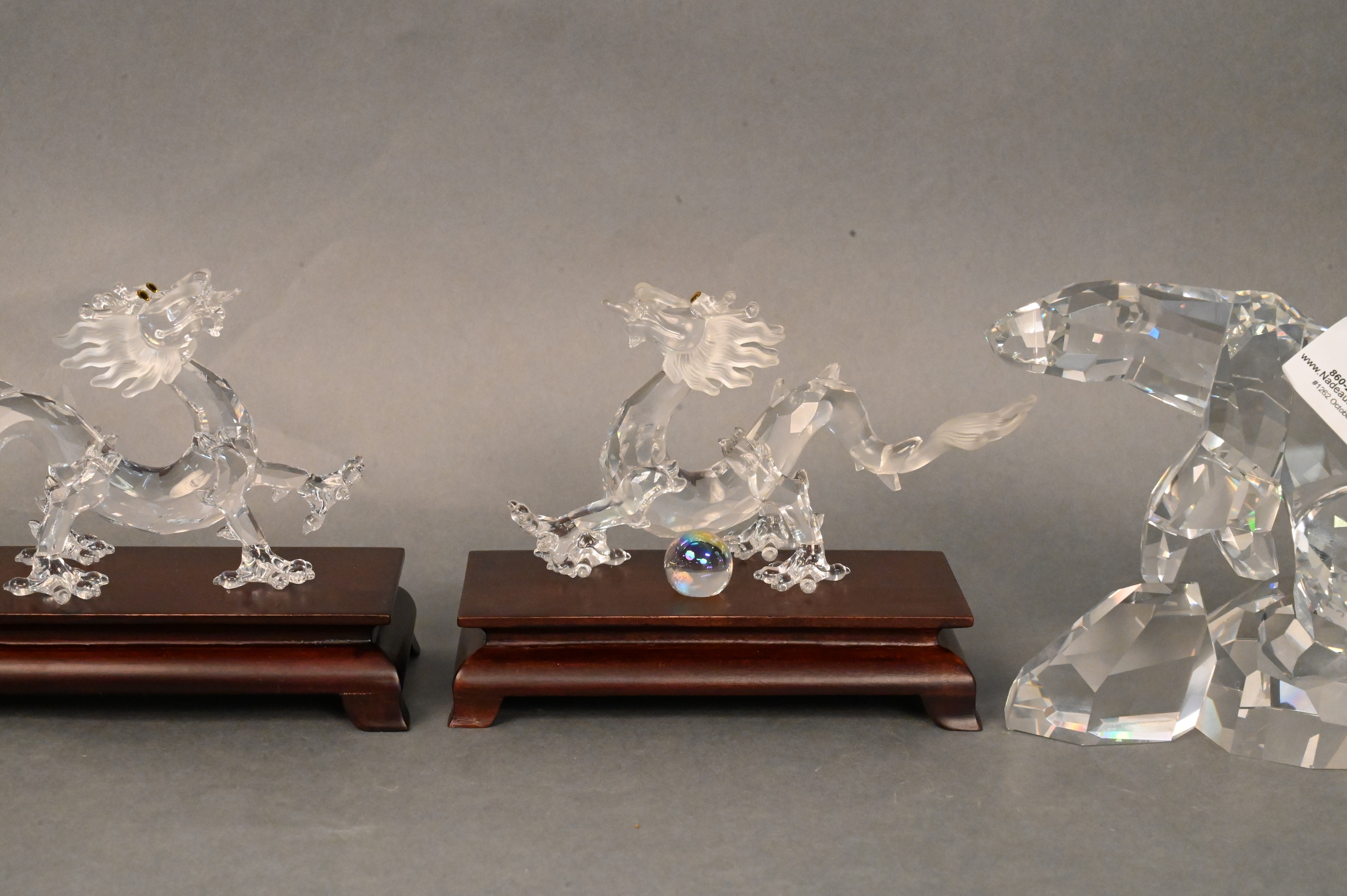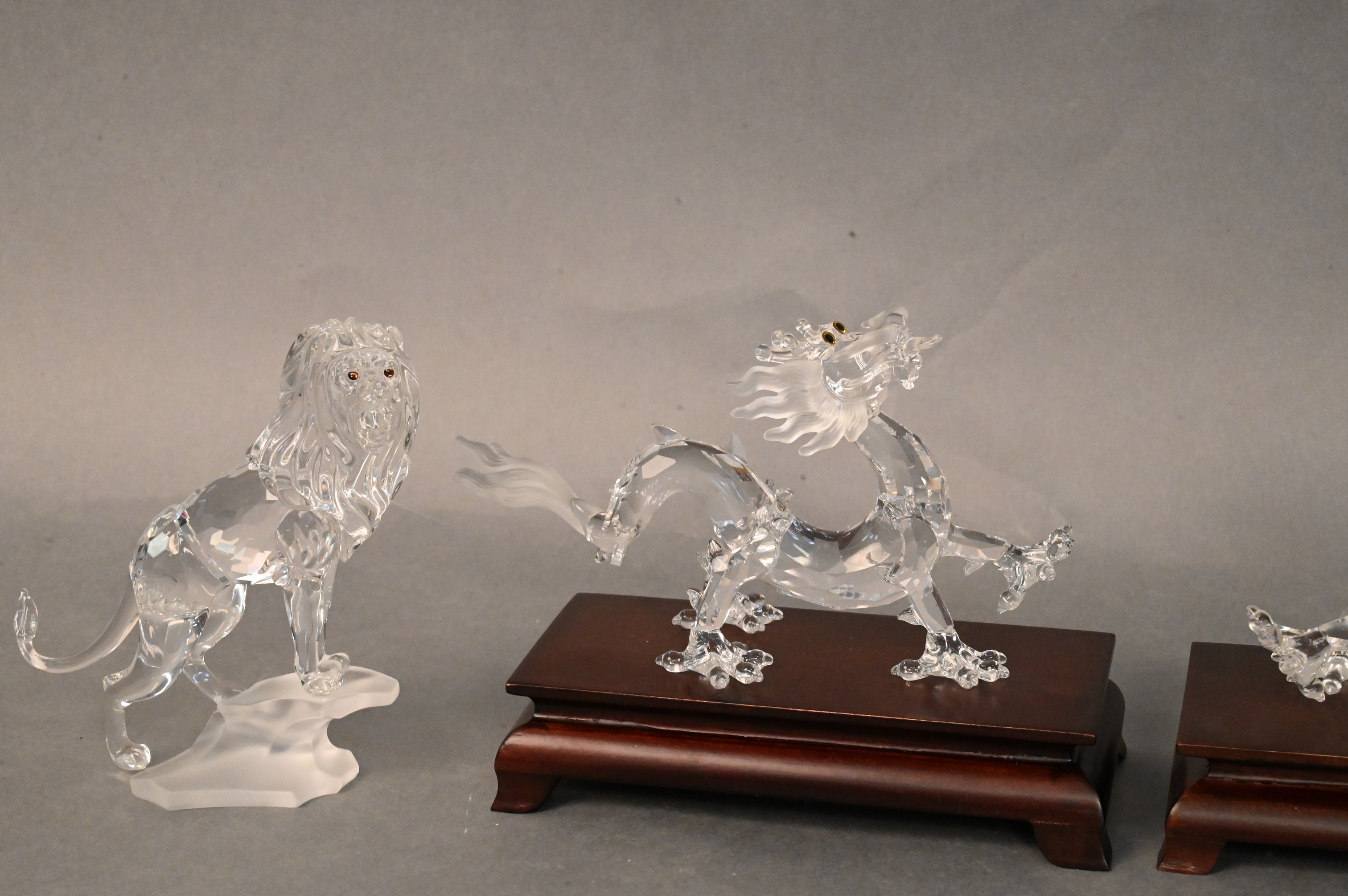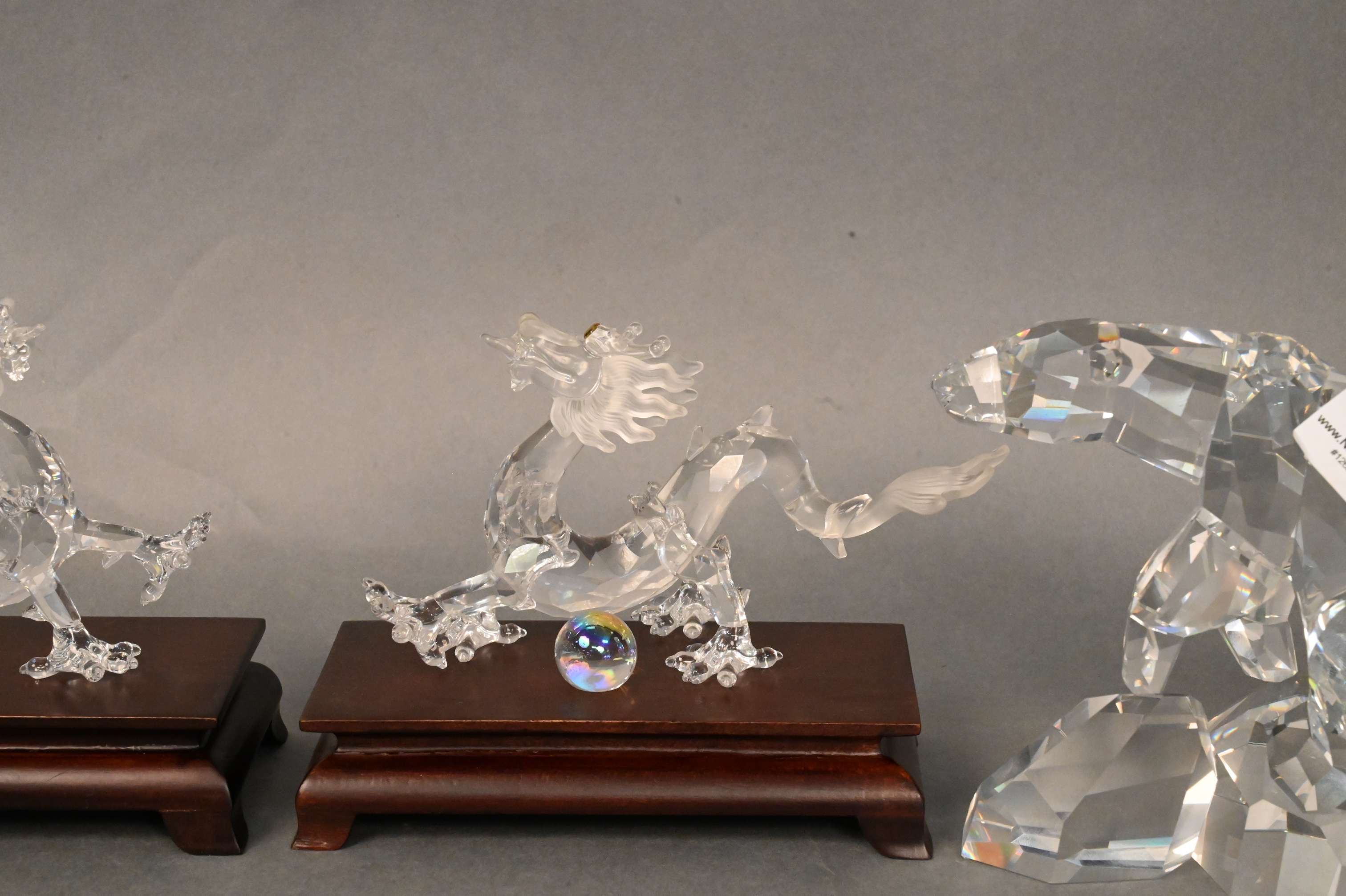roaring lion on rock, polar bear Nanuc, two zodiac dragons one having broken ear and the other missing marble ball, each in original presentation box with certificate of authenticity