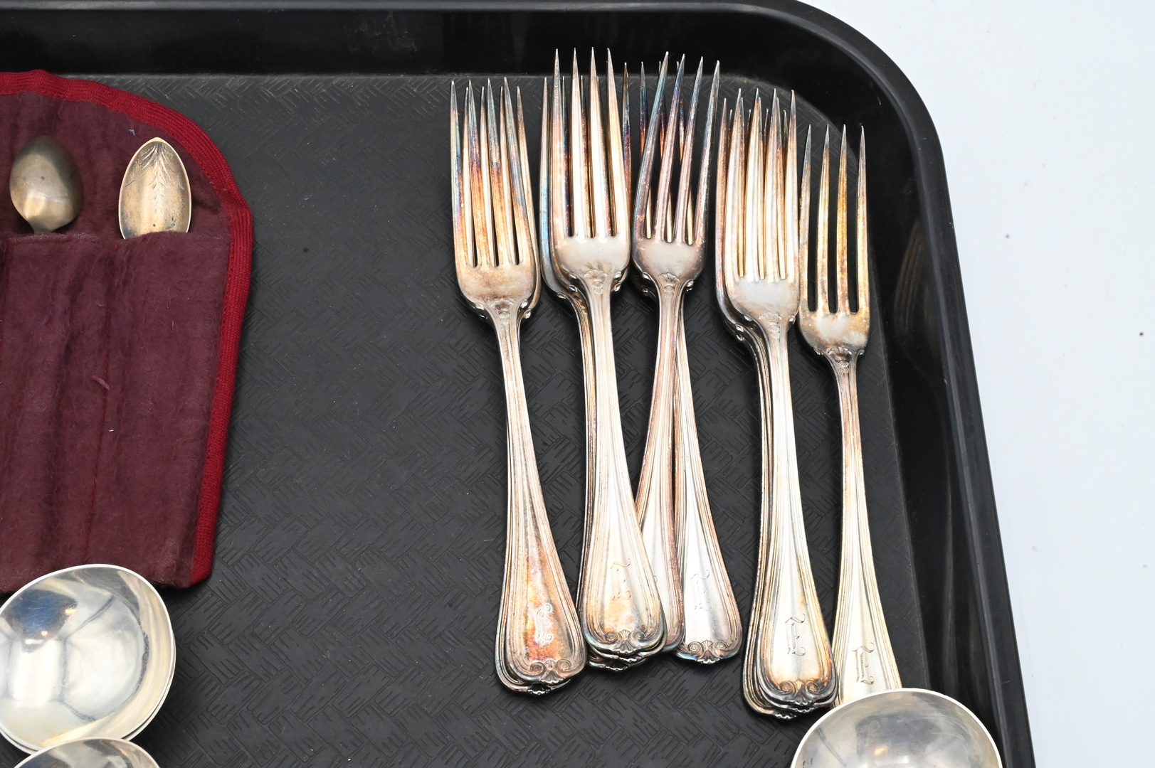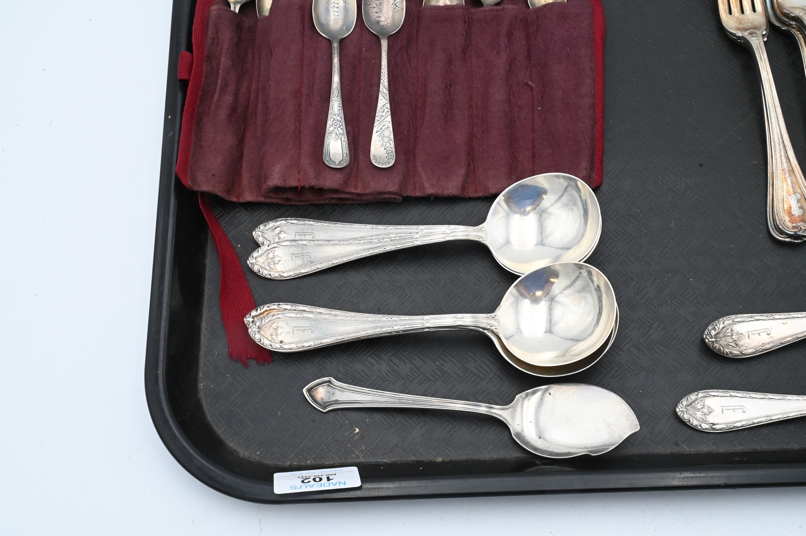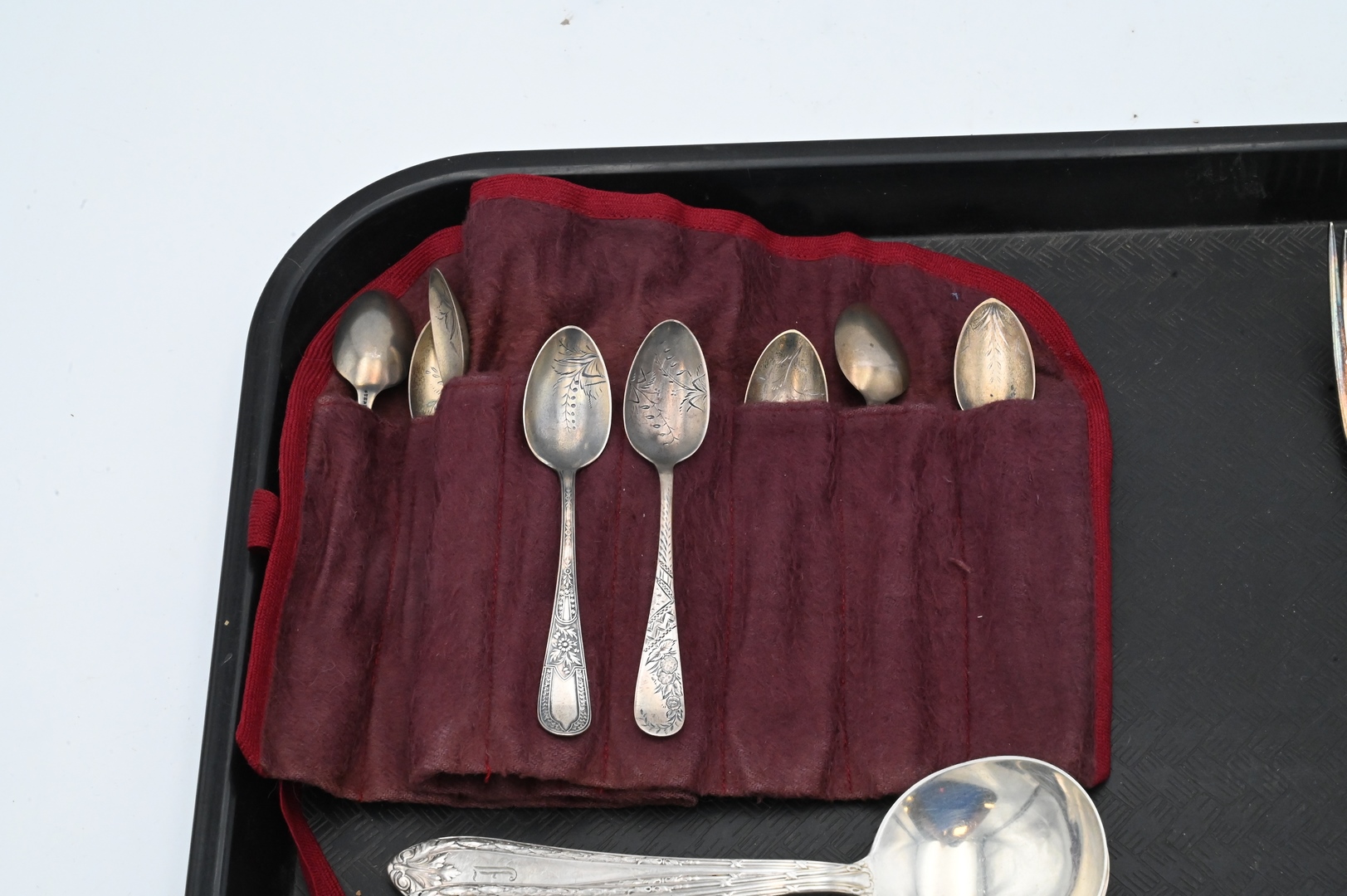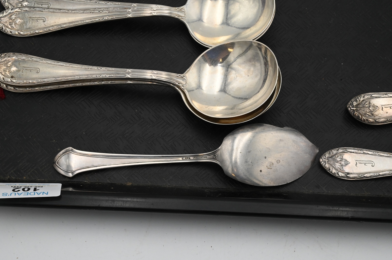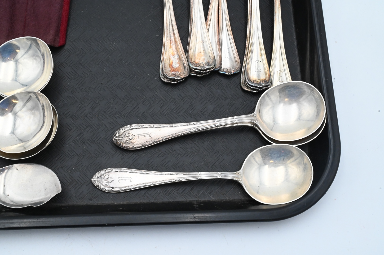 Group of Sterling and Silver Plate, to include a set of eight sterling soup spoons, a set of sterling demitasse spoons, along with a plate fork, 19.440 t.oz.