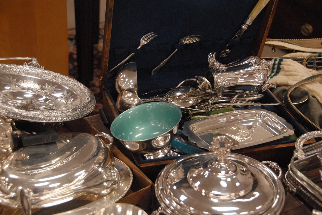 Large group of silverplate serving pieces, flatware, etc. along with a pewter tea set.