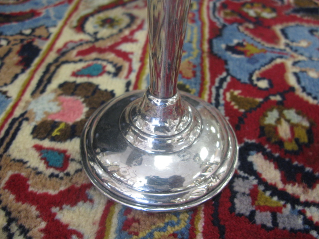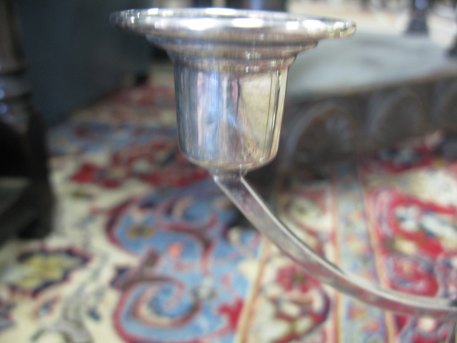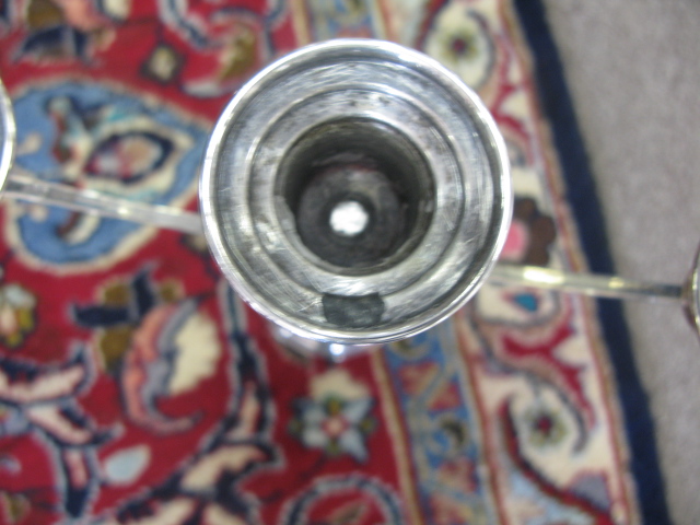 Pair of sterling silver three light candelabra with weighted bases, dents in base