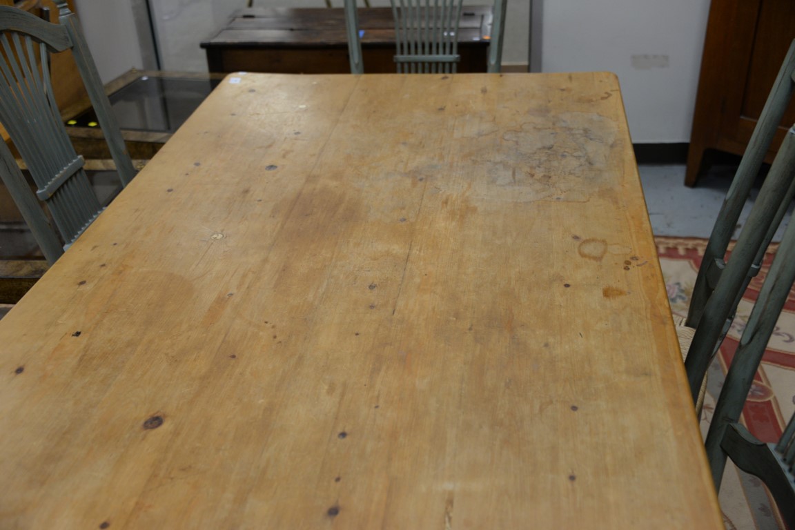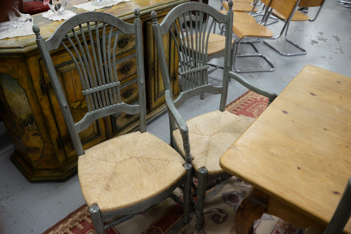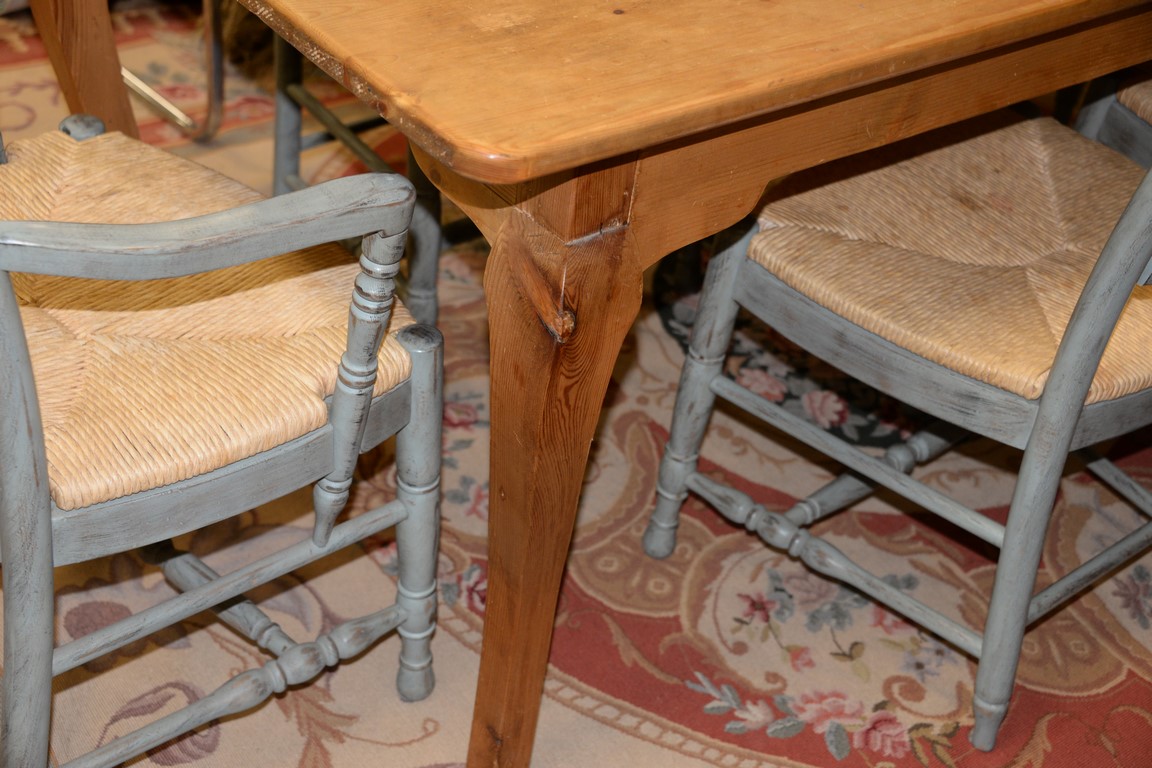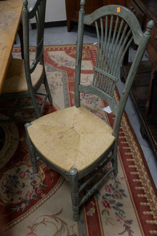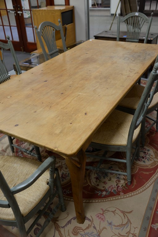 Set of eight rush seat chairs and pine farm table on cabriole legs. ht. 30 in. 39 x 84