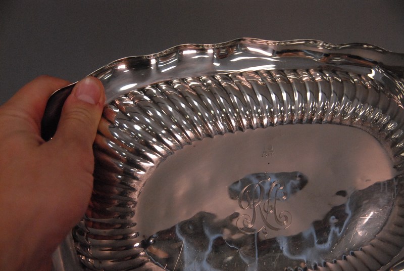 Sterling scalloped rectangular bowl, monogrammed on bottom, 12 t oz.