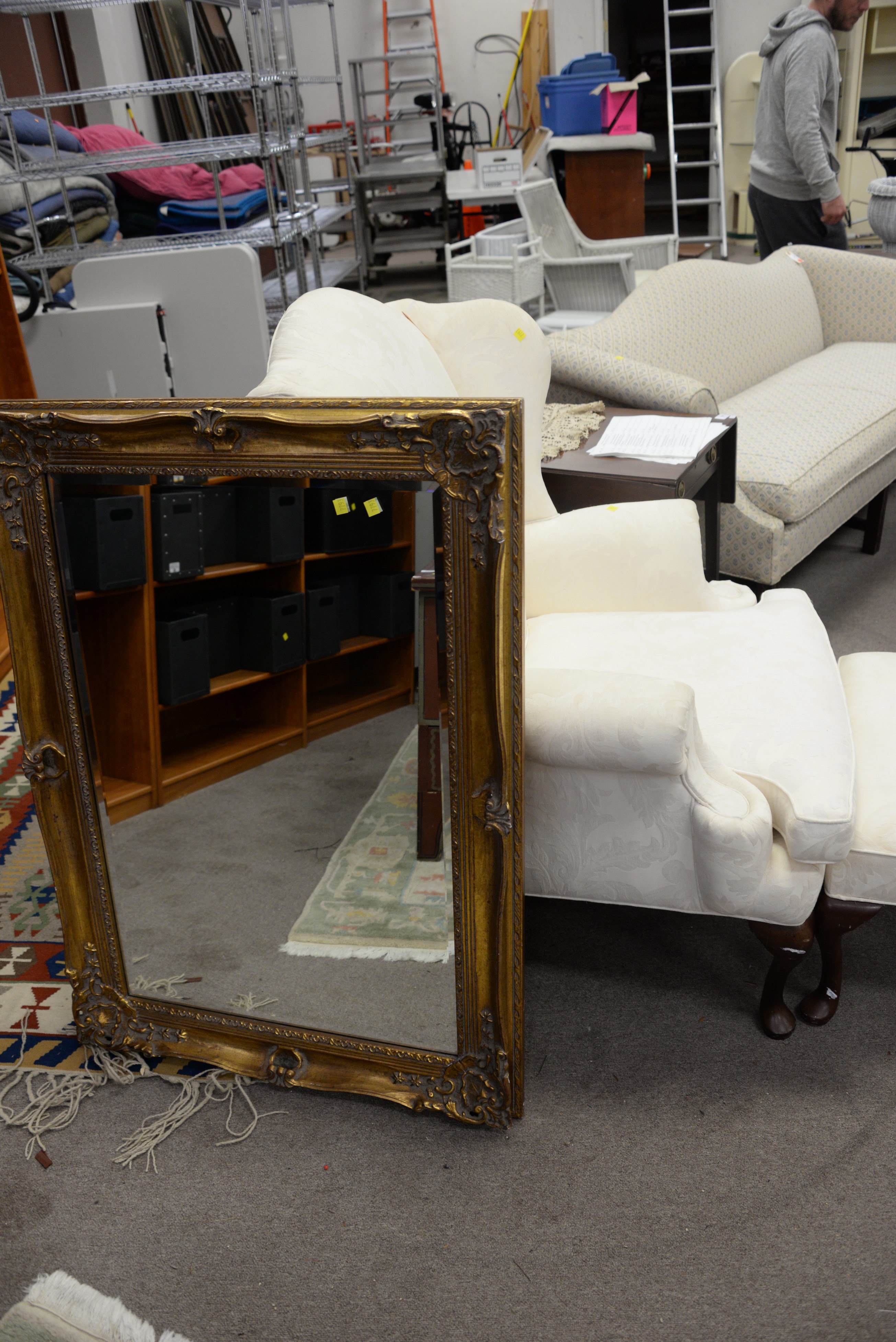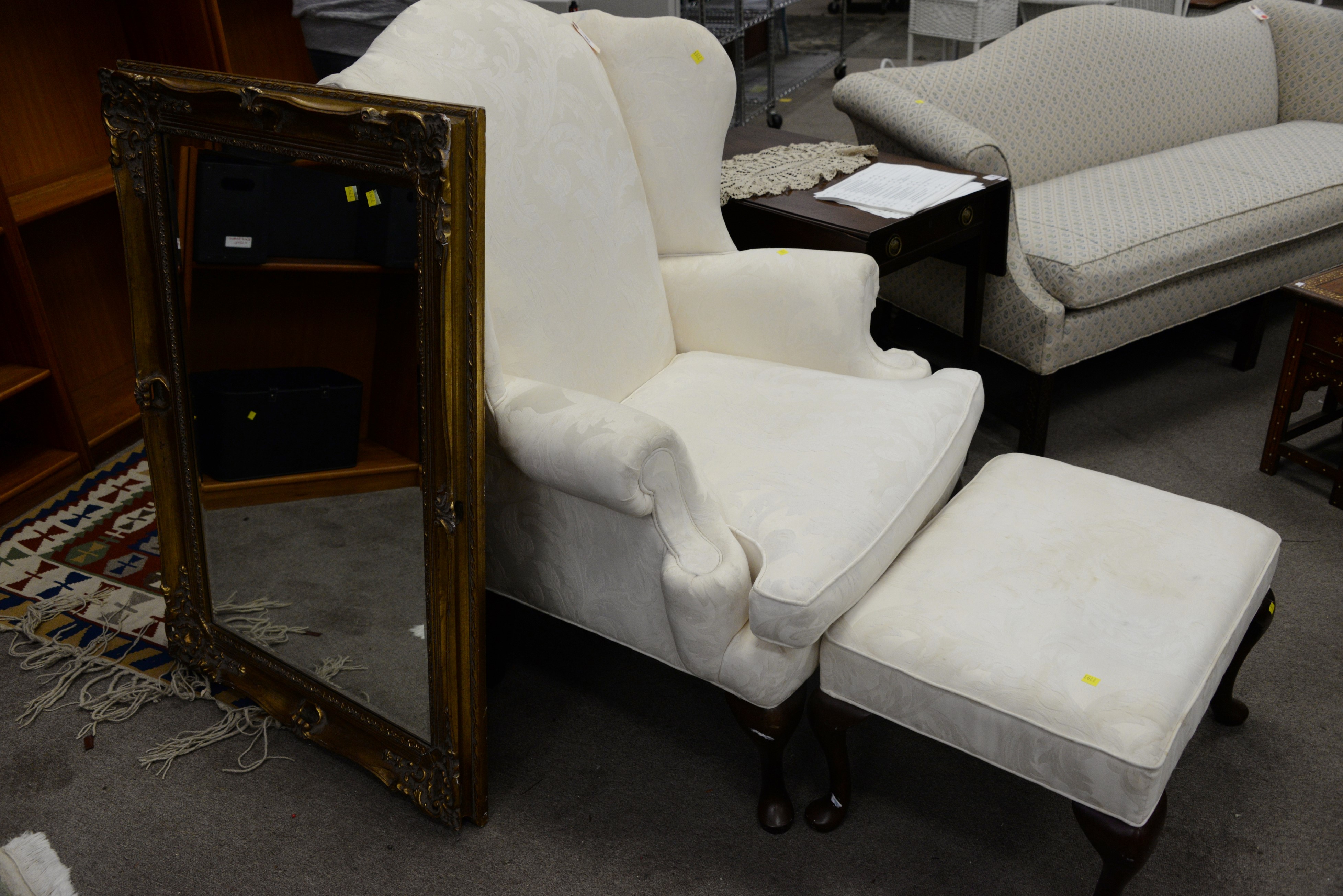 Three piece Queen Anne style upholstered wing chair and ottoman along with gold mirror.