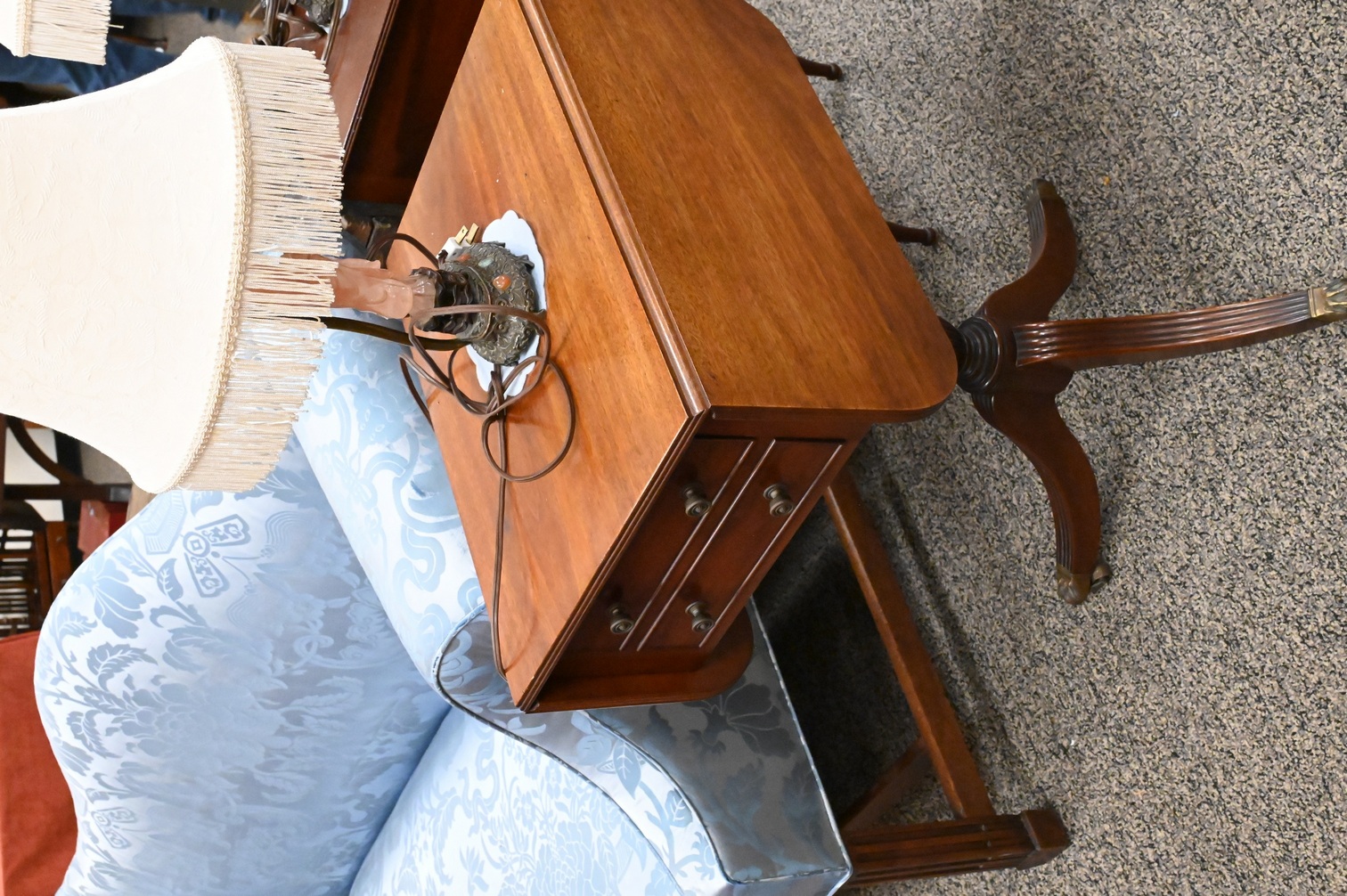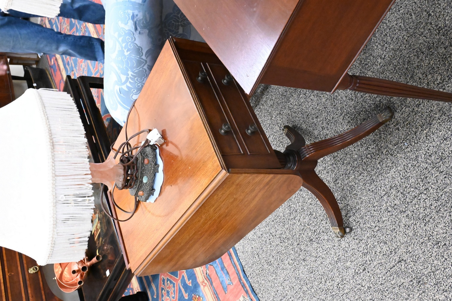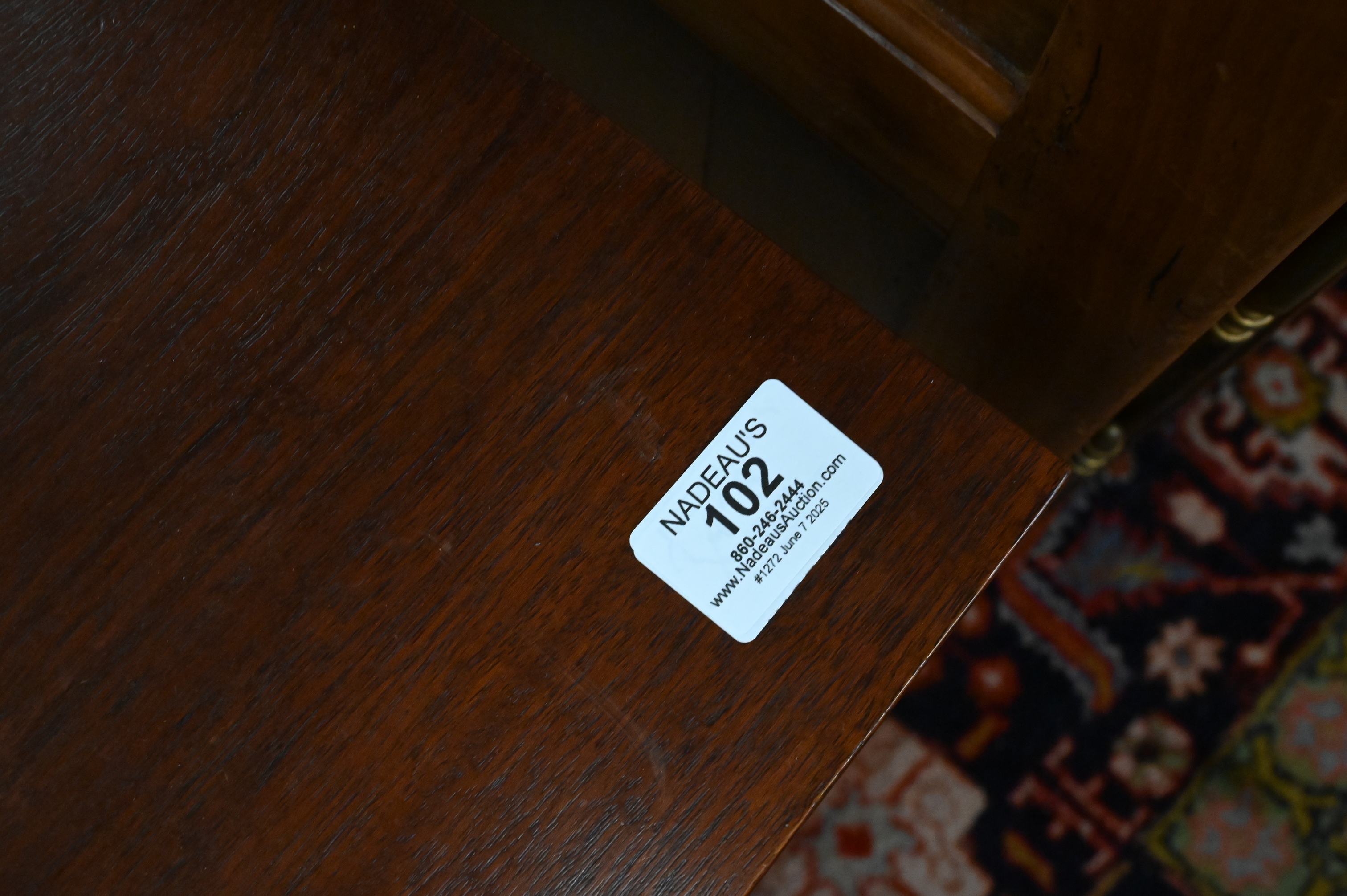 to include custom mahogany drop leaf center table attributed to Margolis shops having two drawers and two false drawers, pedestal base on downswept members ending in brass paw feet