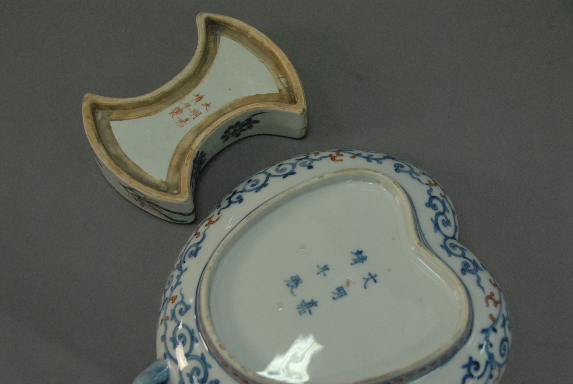 Lot 102: Two piece lot including heart shaped Imari dish and a porcelain ink pot with 6 character mark on bottom.