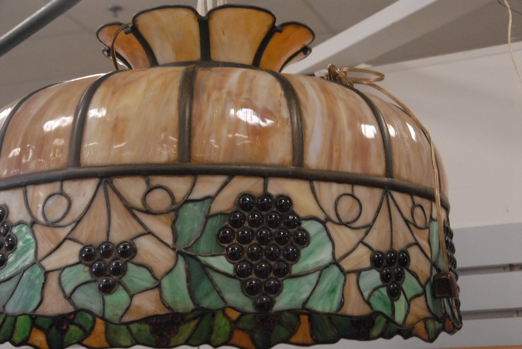 Victorian leaded and panel shade hanging lamp with bunches of grapes, dia. 24in.