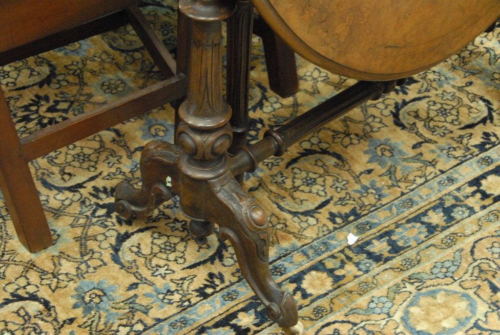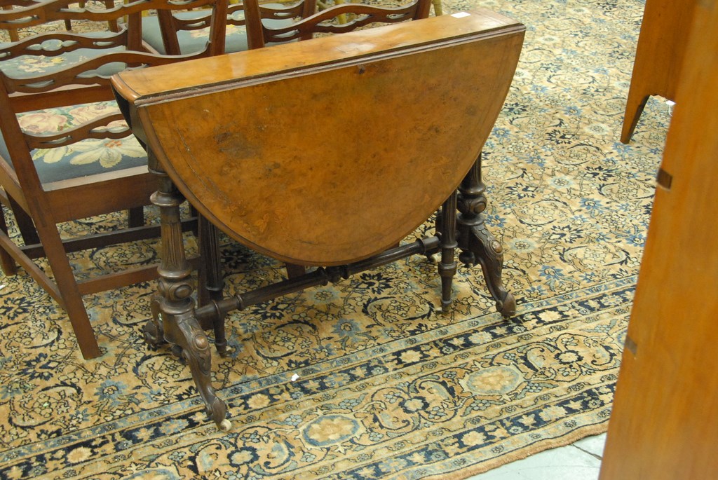 Lot 102: Victorian walnut and burl walnut table with oval drop leaves on carved legs, top inlaid with lines and flowers, circa 1870. ht. 28i…