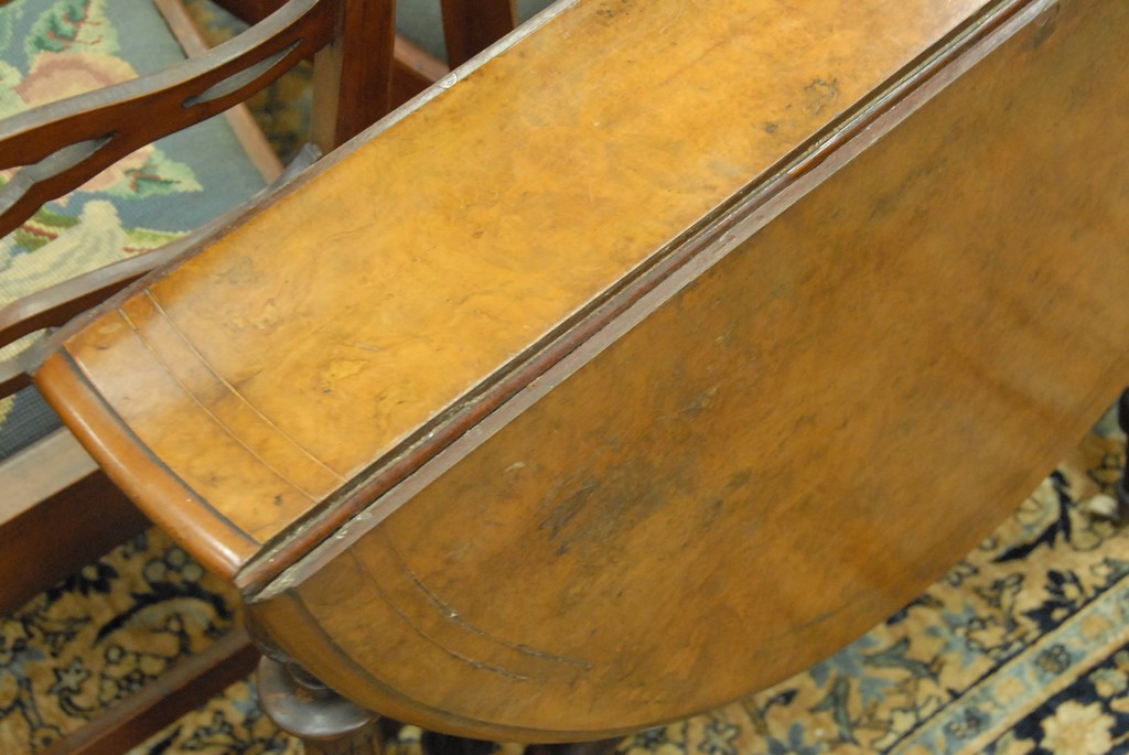 Victorian walnut and burl walnut table with oval drop leaves on carved legs, top inlaid with lines and flowers, circa 1870. ht. 28in. top: 40in.