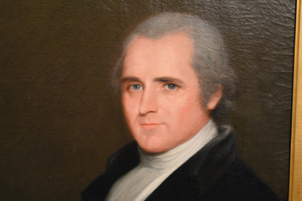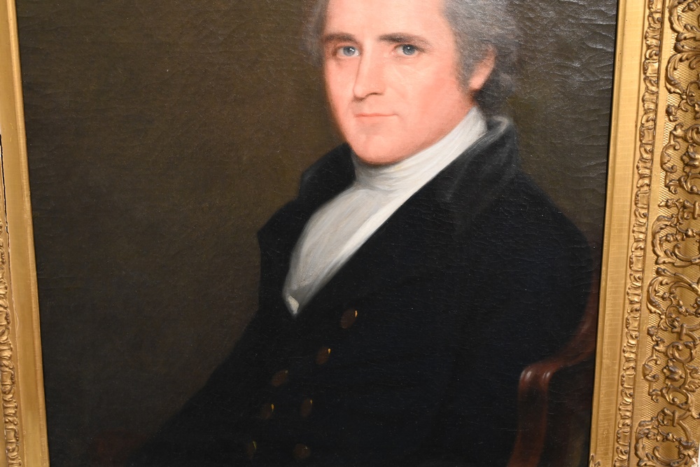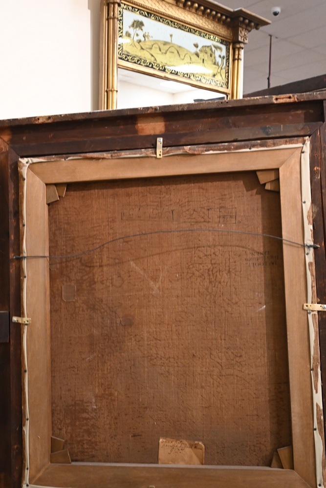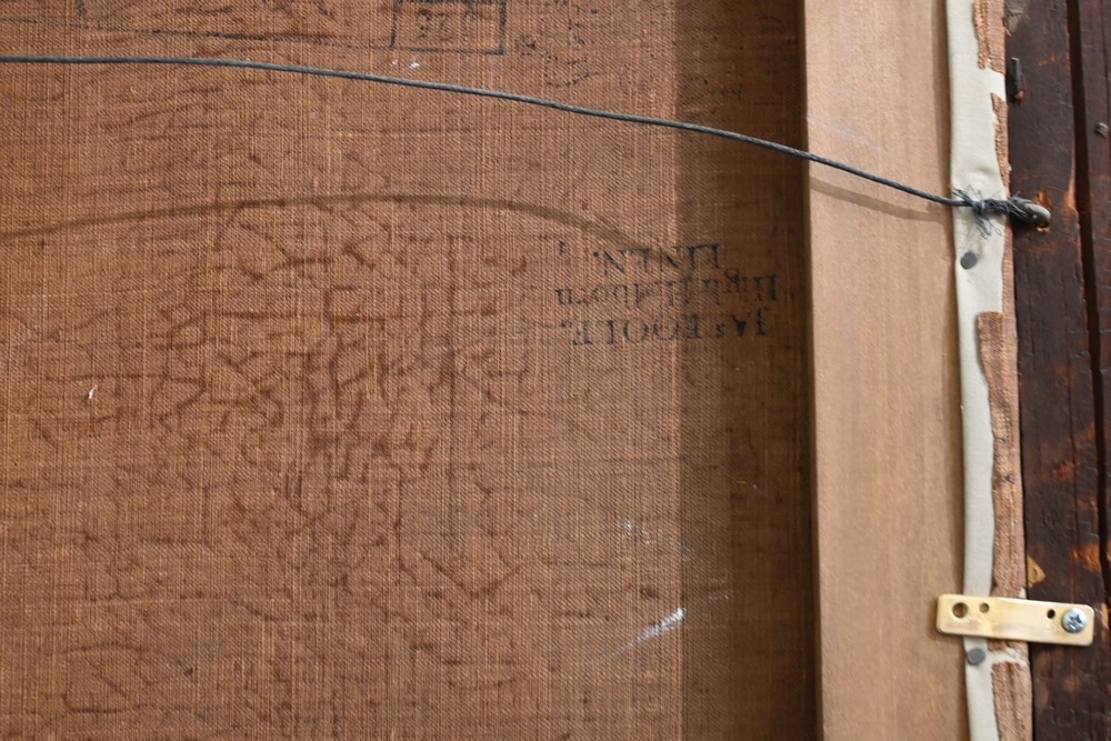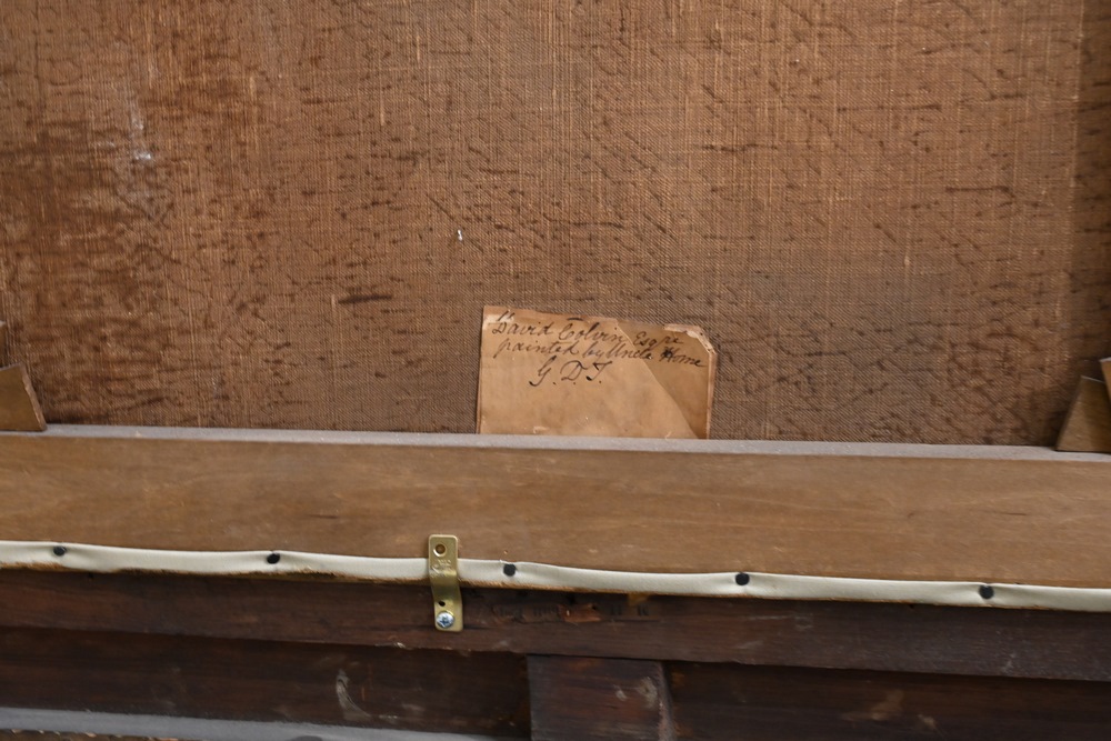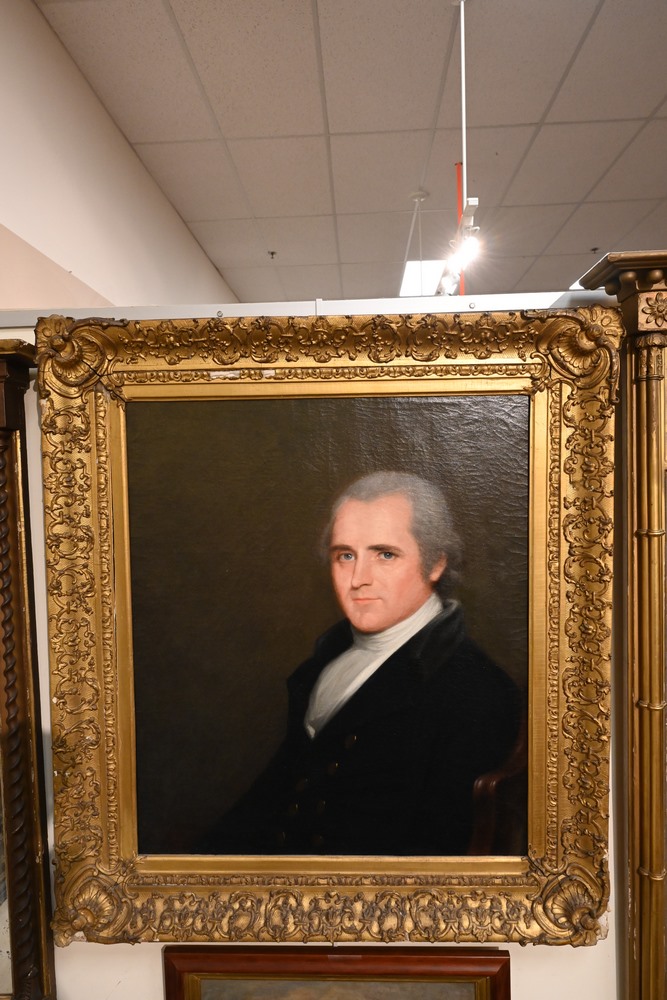 Lot 103: American/British School 19th century portrait of David Cohen, Esq. oil on relined canvas unsigned having a paper label adhered to the reverse denoting sitter 30 x 26 inches