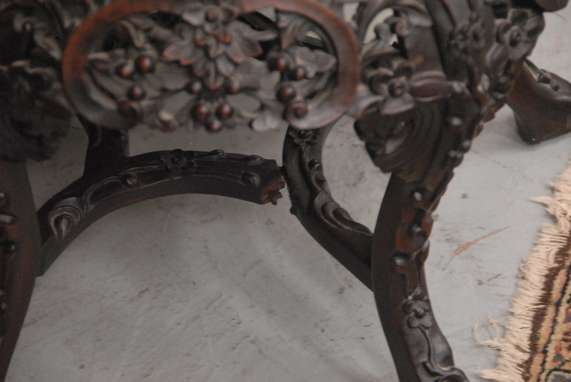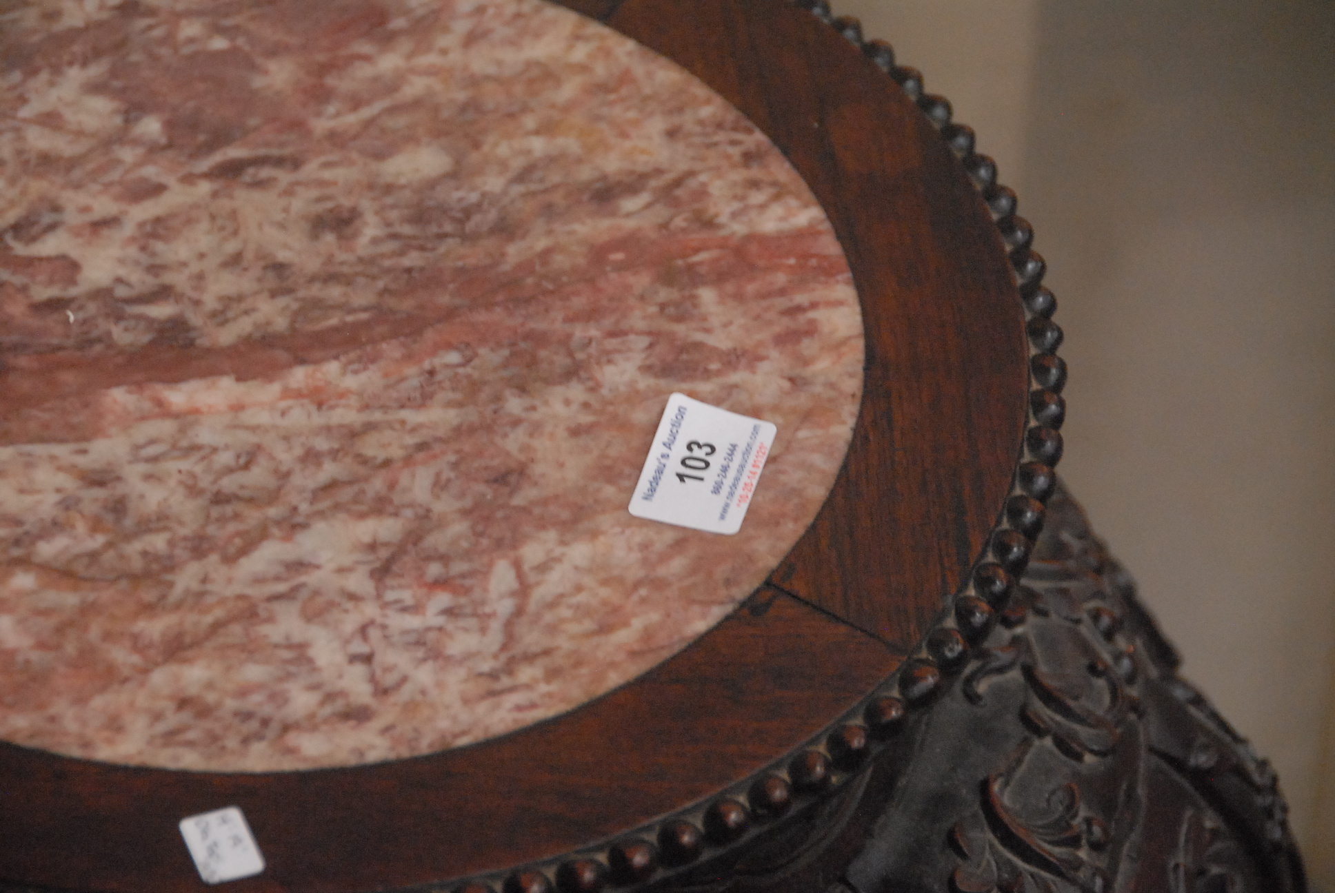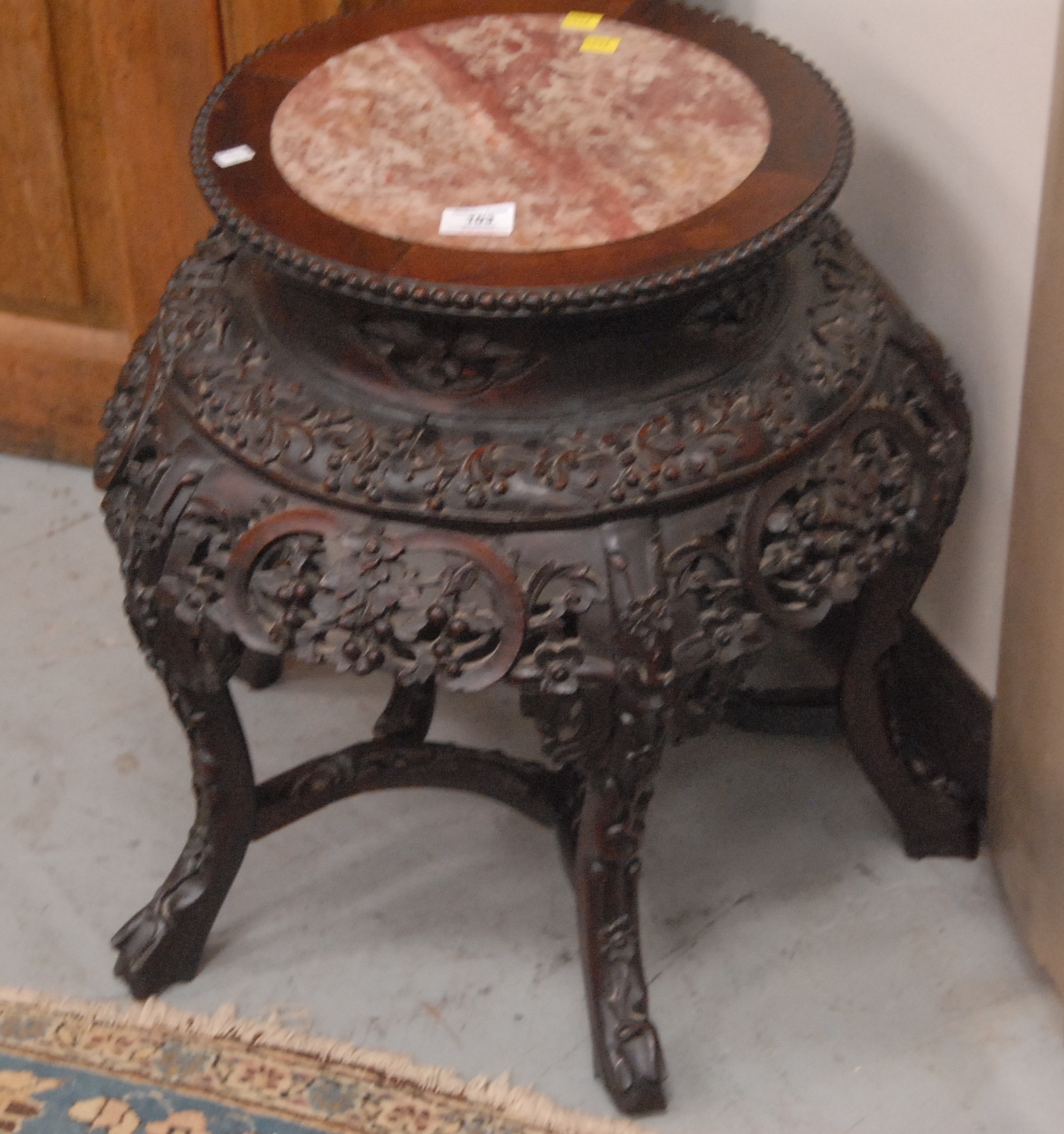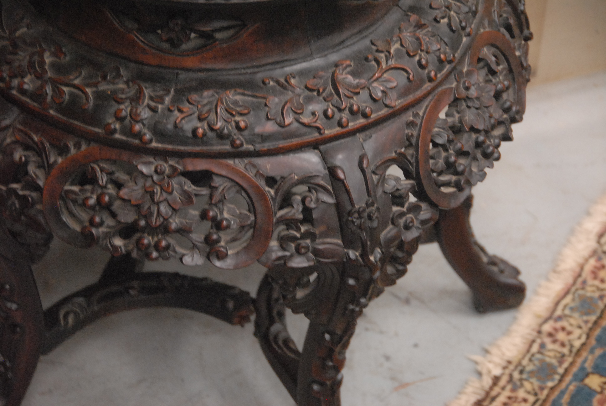 Carved Chinese hardwood stand with marble insert. ht. 19 in. top dia. 14 in.