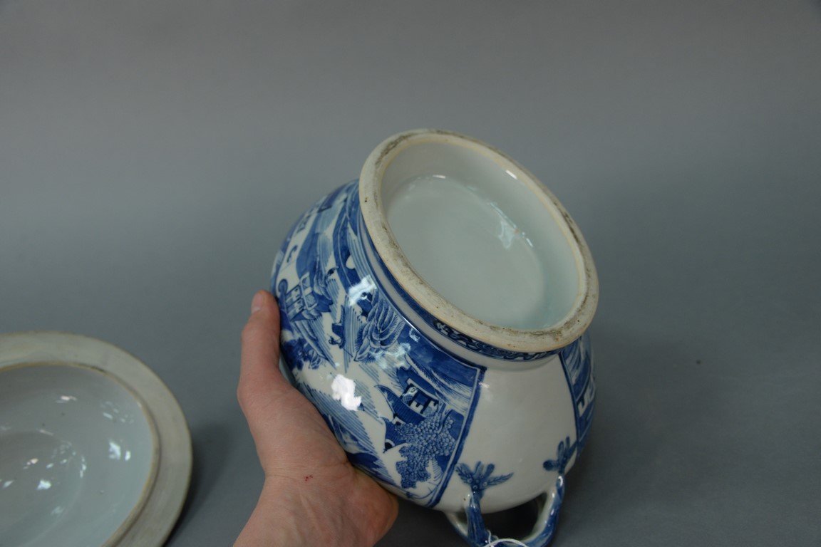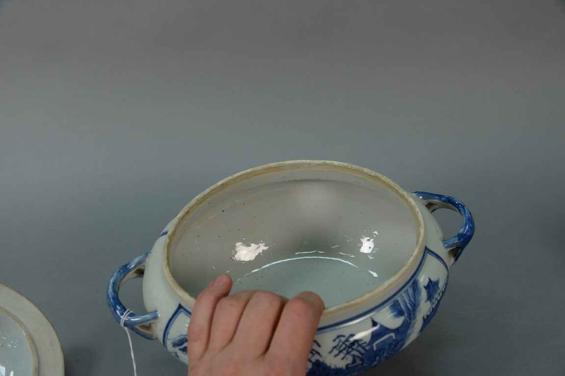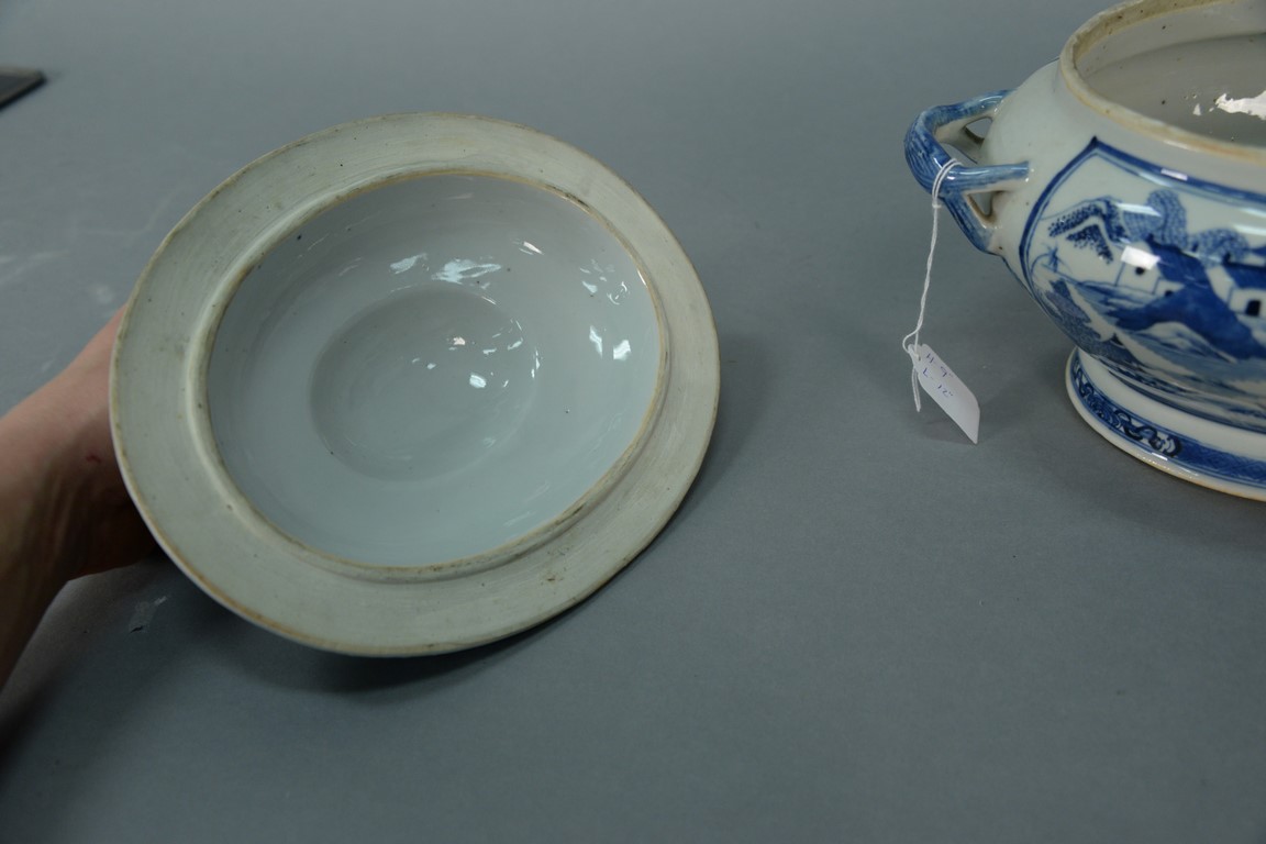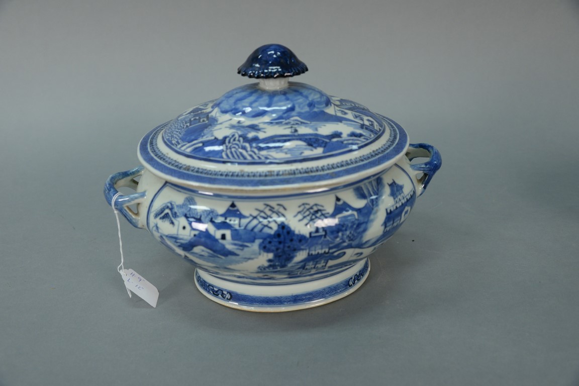 Lot 103: Chinese export porcelain blue and white Canton covered tureen. height 9 inches, length 12 inches