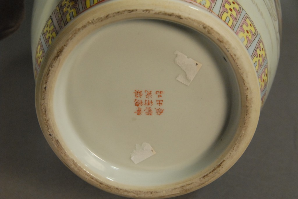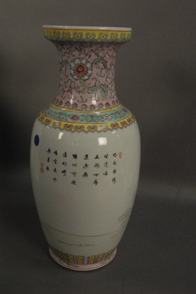 Lot 103: Famille Rose vase having painted scene with figures in landscape on front and character marks on back, marked with nine character ma…