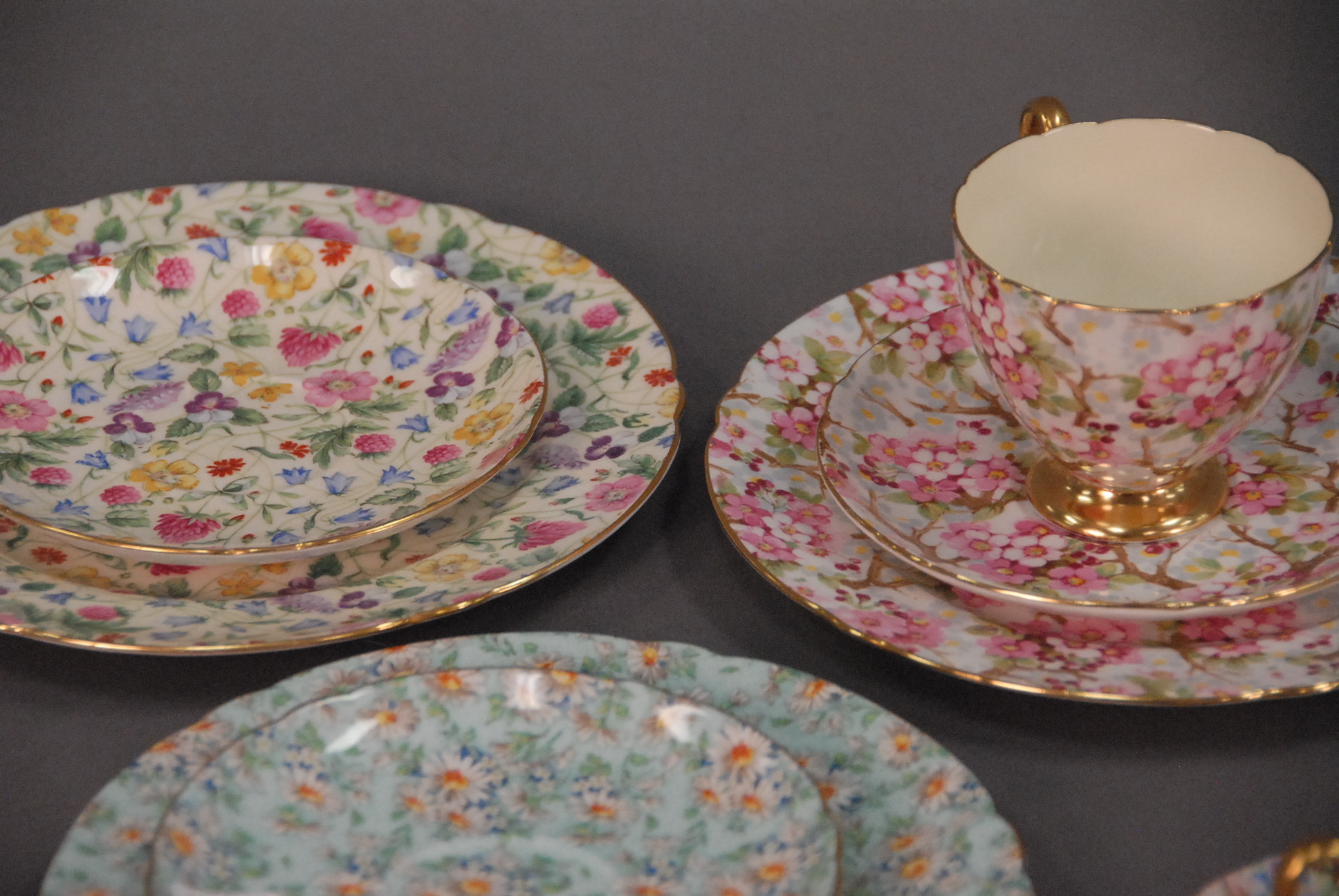 Lot 103: Fifteen Shelley cups, saucers, and dessert plates to include Maytime three piece set, Rock Garden three piece set, Countryside…