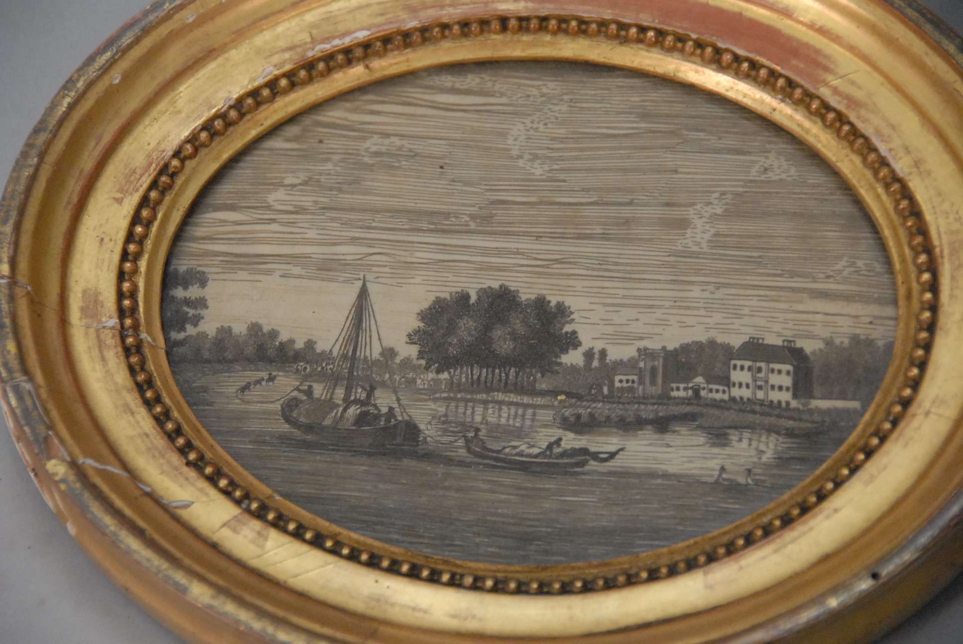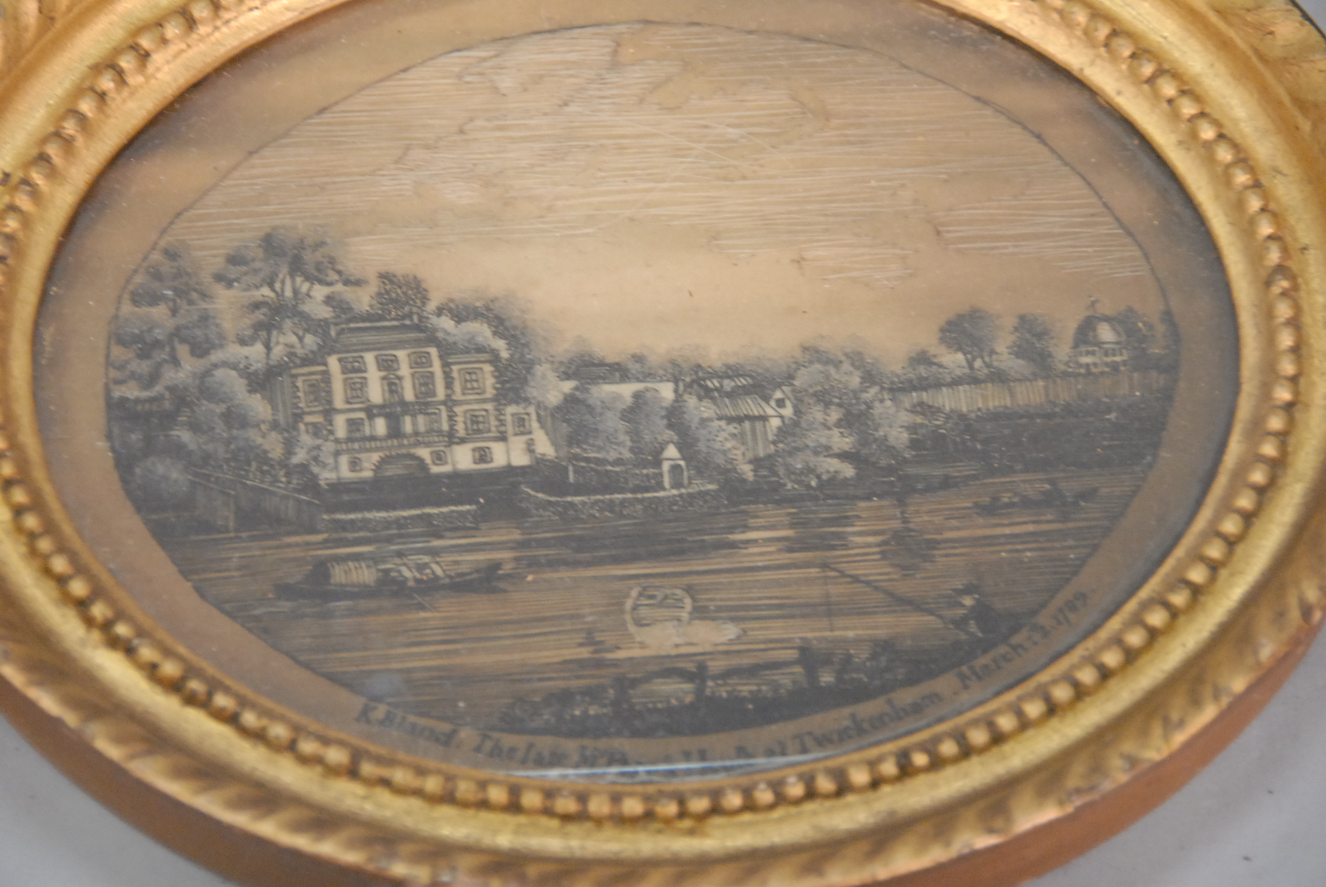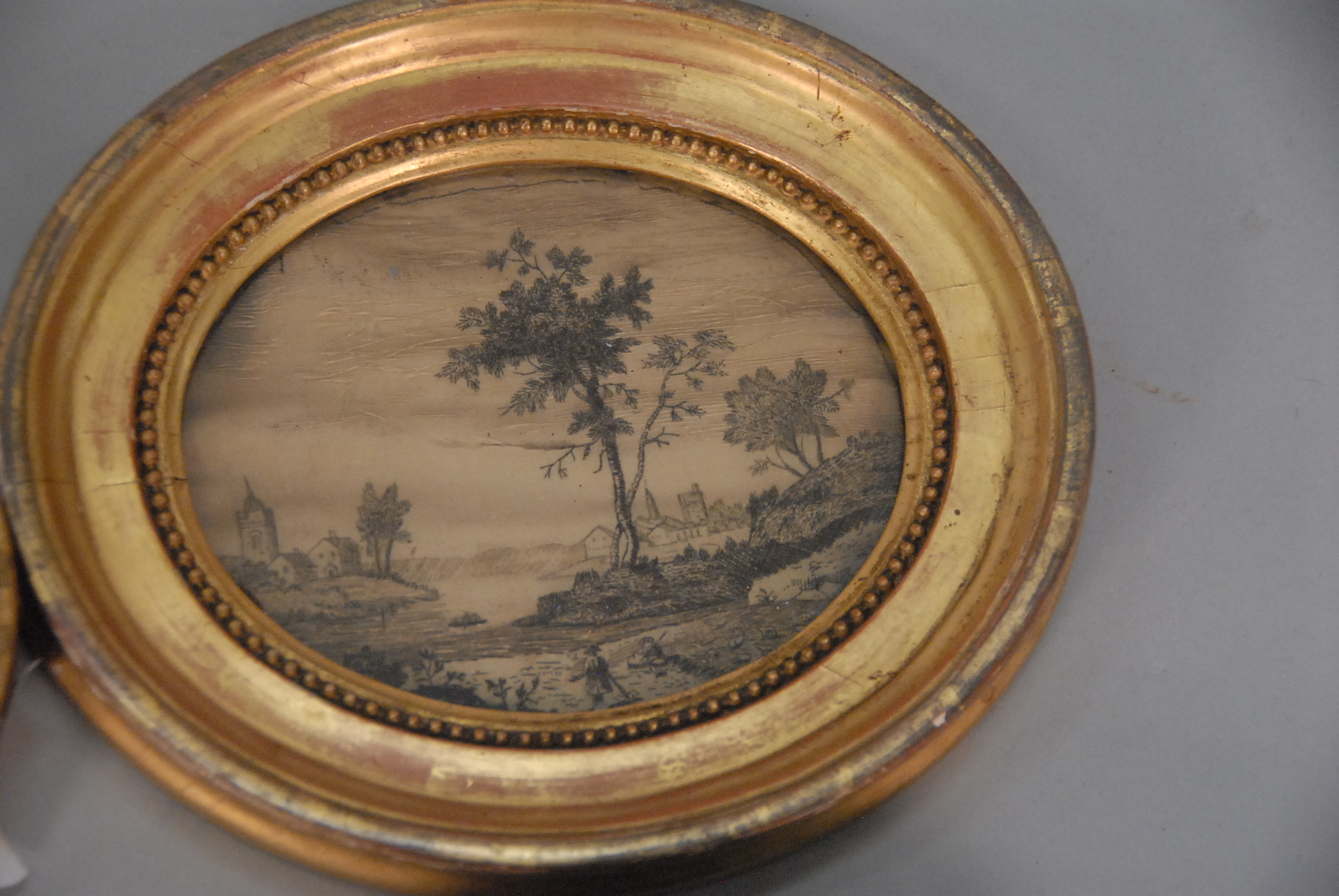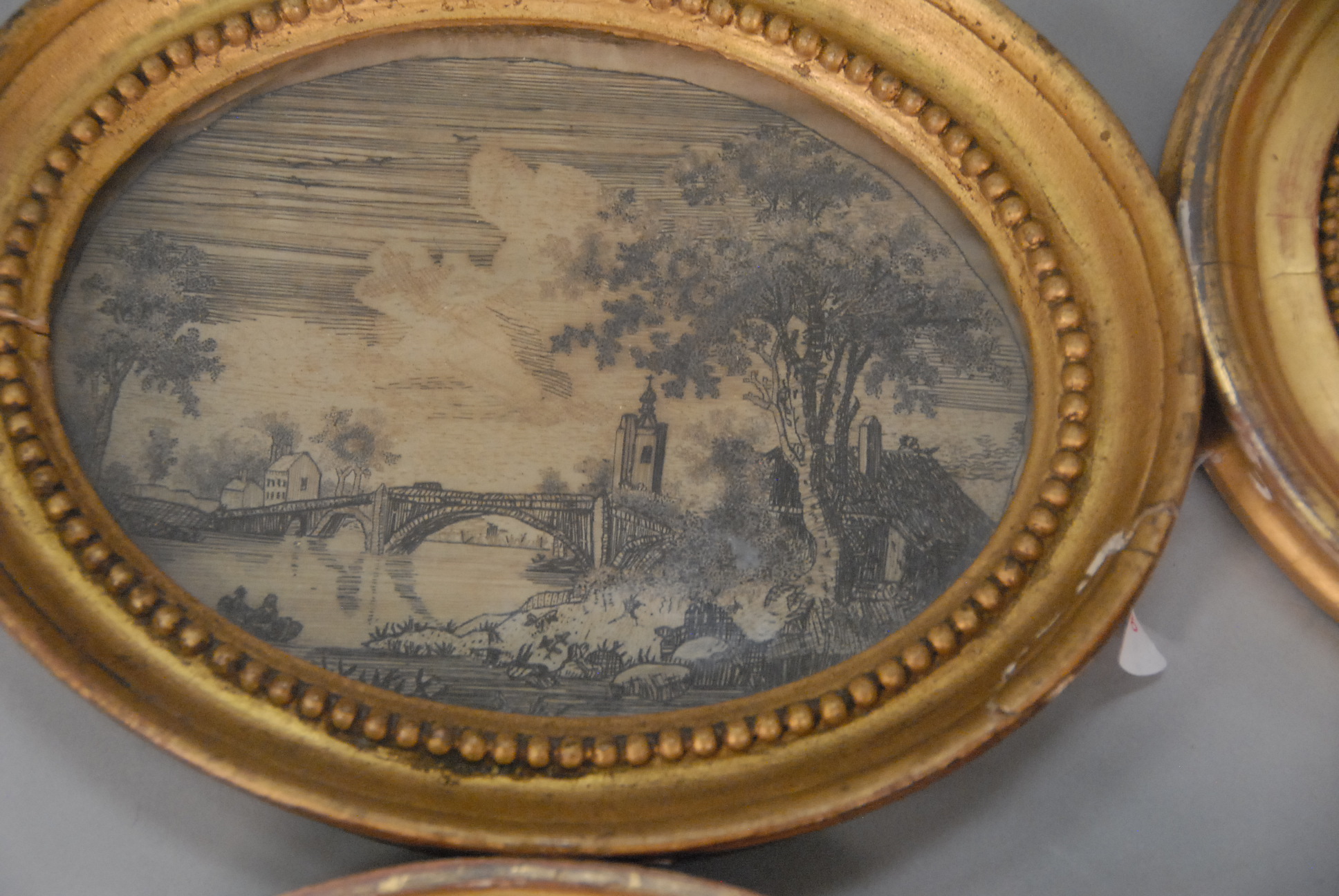 Group of four English School, late 18th century silk embroidered pictures, one marked Sir George Pococks House Twickenham, each with Christies stickers on reverse. 4 1/2 x 6