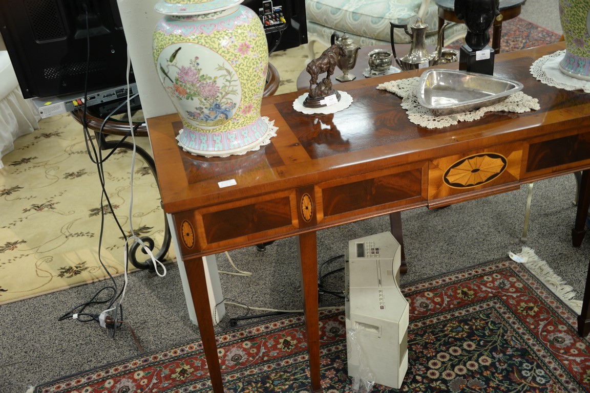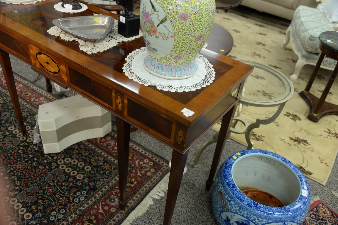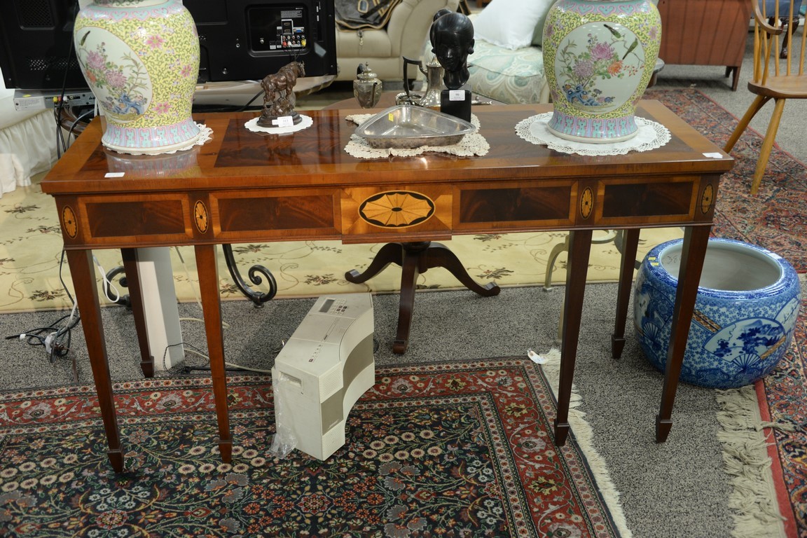 Hekman mahogany inlaid server with inlaid panel top and front. ht. 32in., top: 20 x 60