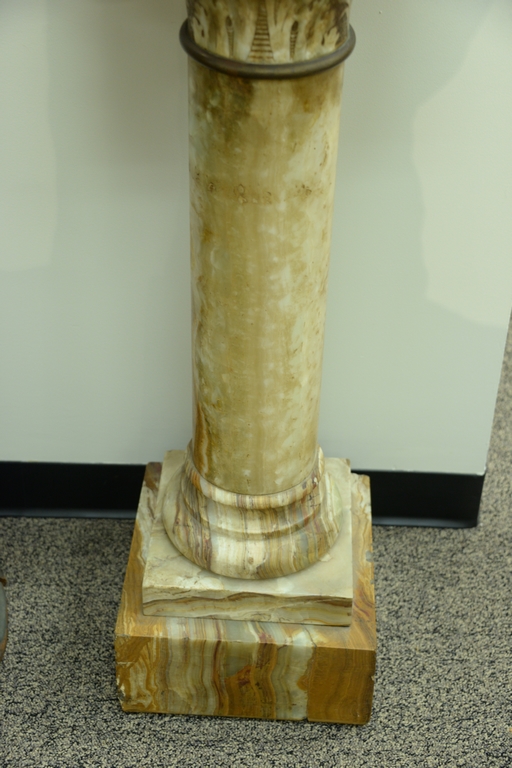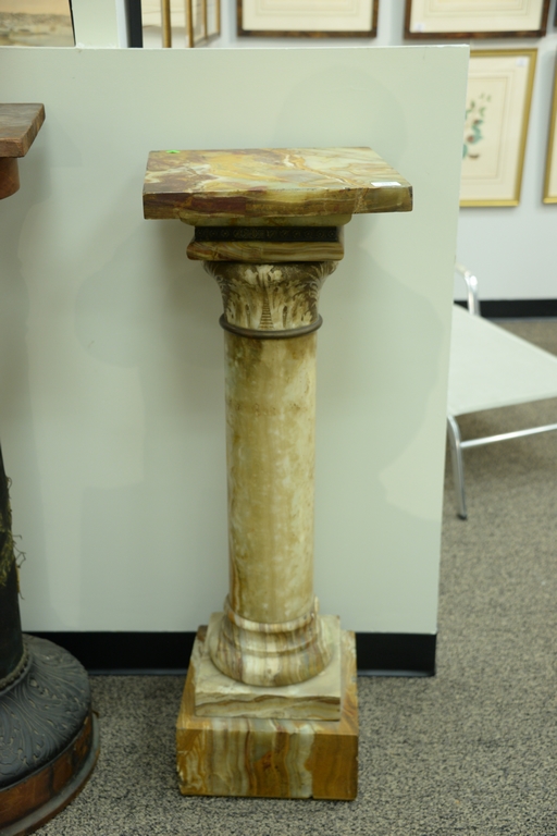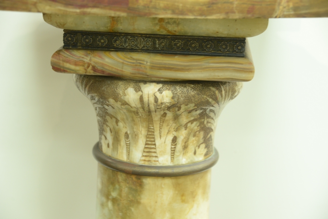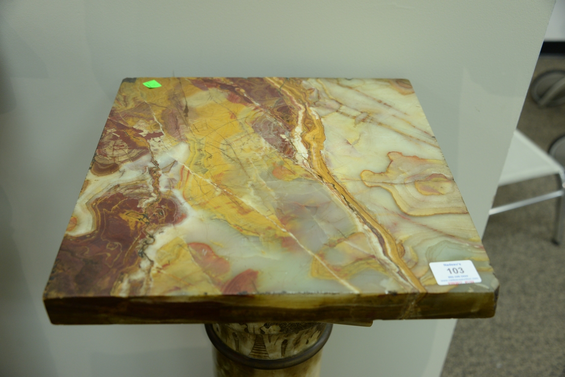 Lot 103: Large Victorian onyx pedestal with swivle top and etched design with brass mounts. ht. 43in., top: 15 x 15