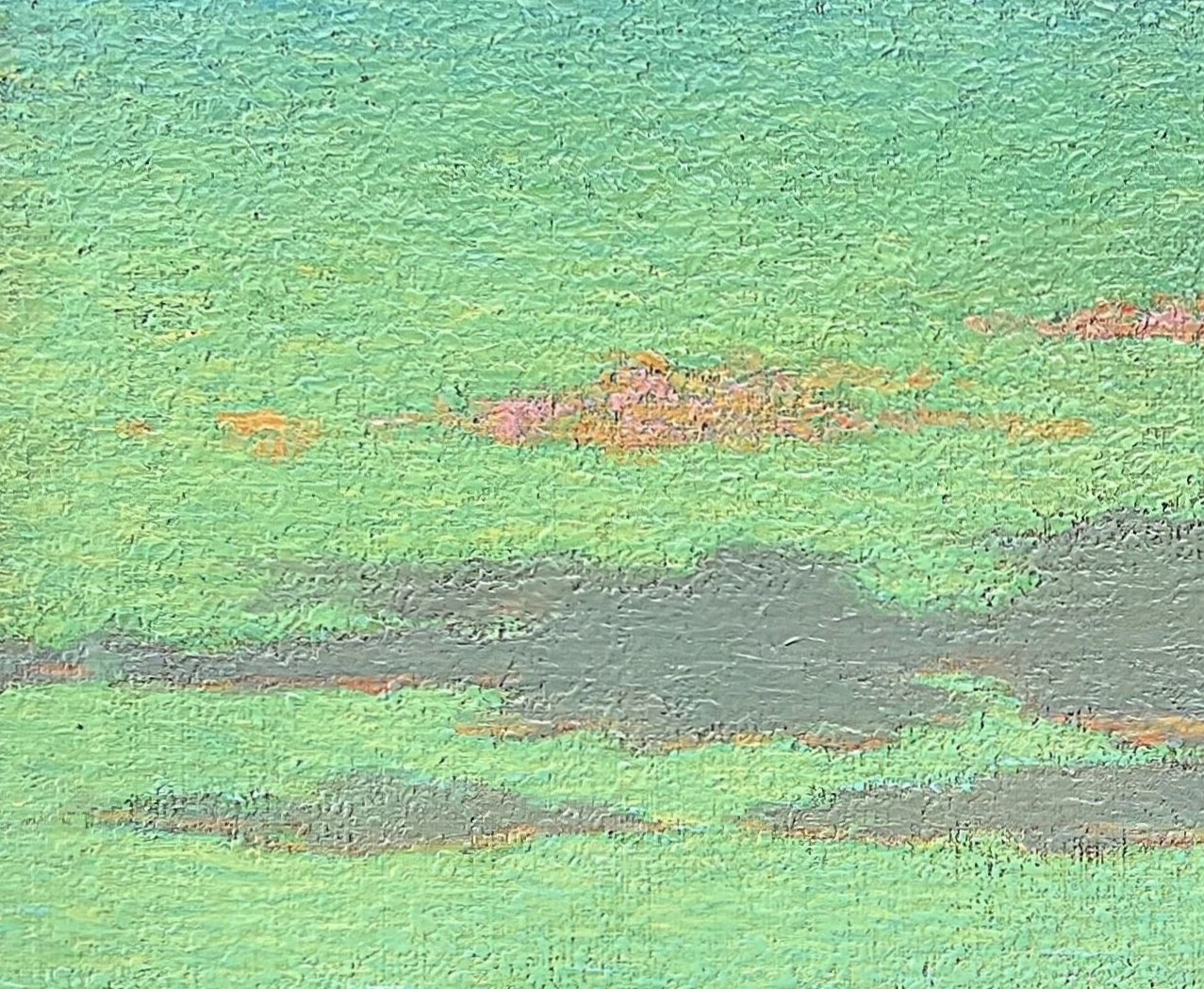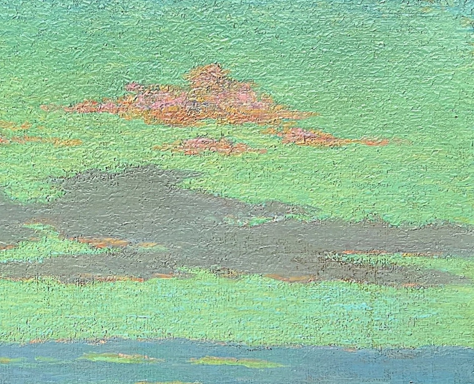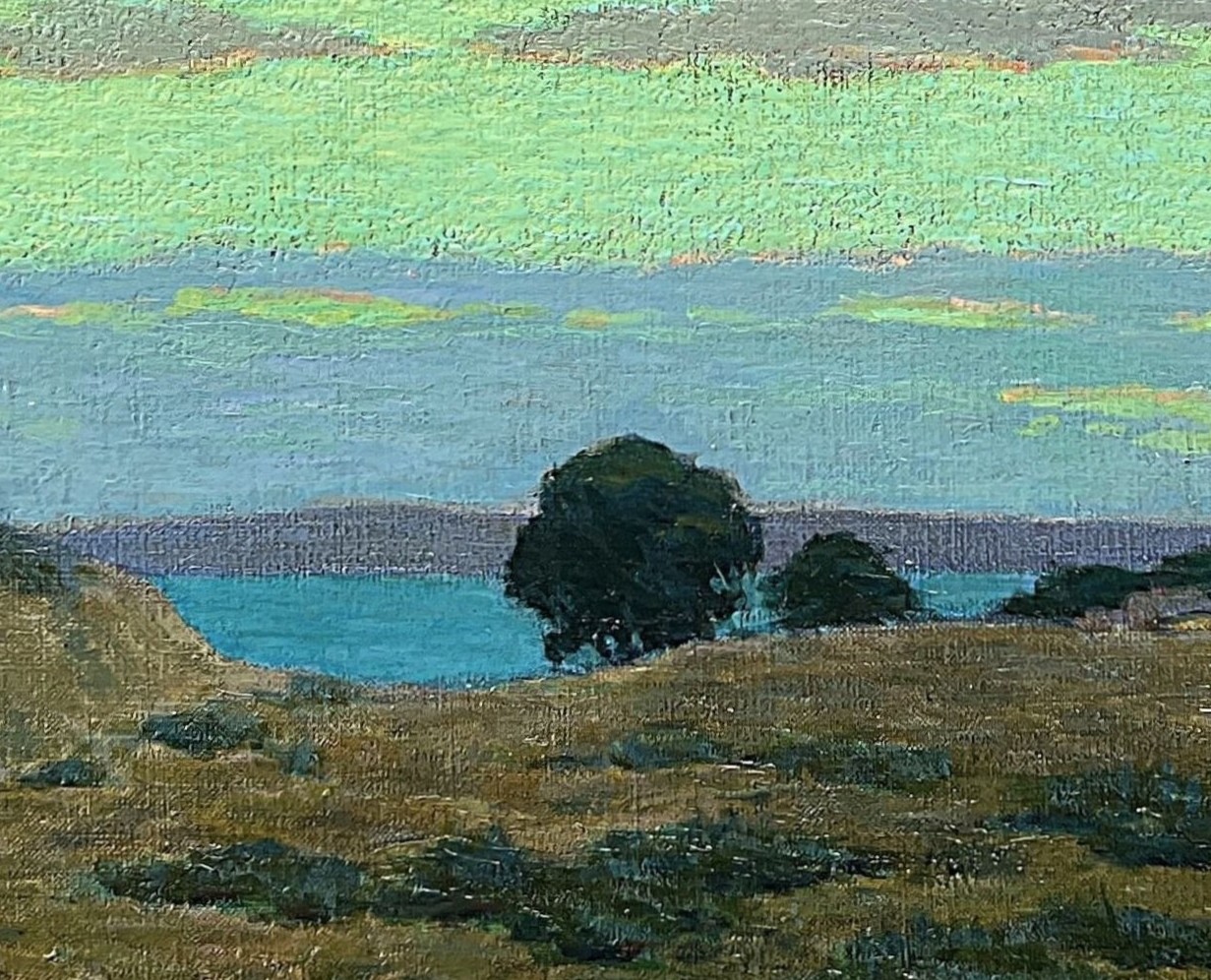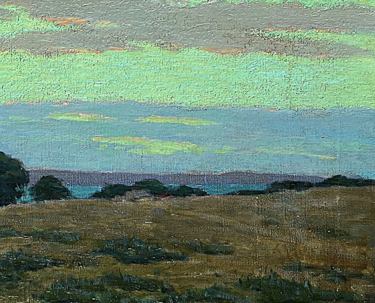 Depicting a tranquil landscape at dusk, with rolling hills and scattered trees leading toward a distant body of water beneath a luminous turquoise sky tinged with soft pink and violet clouds. The artist captures the quiet transition of evening light with subtle tonal gradation and atmospheric depth.