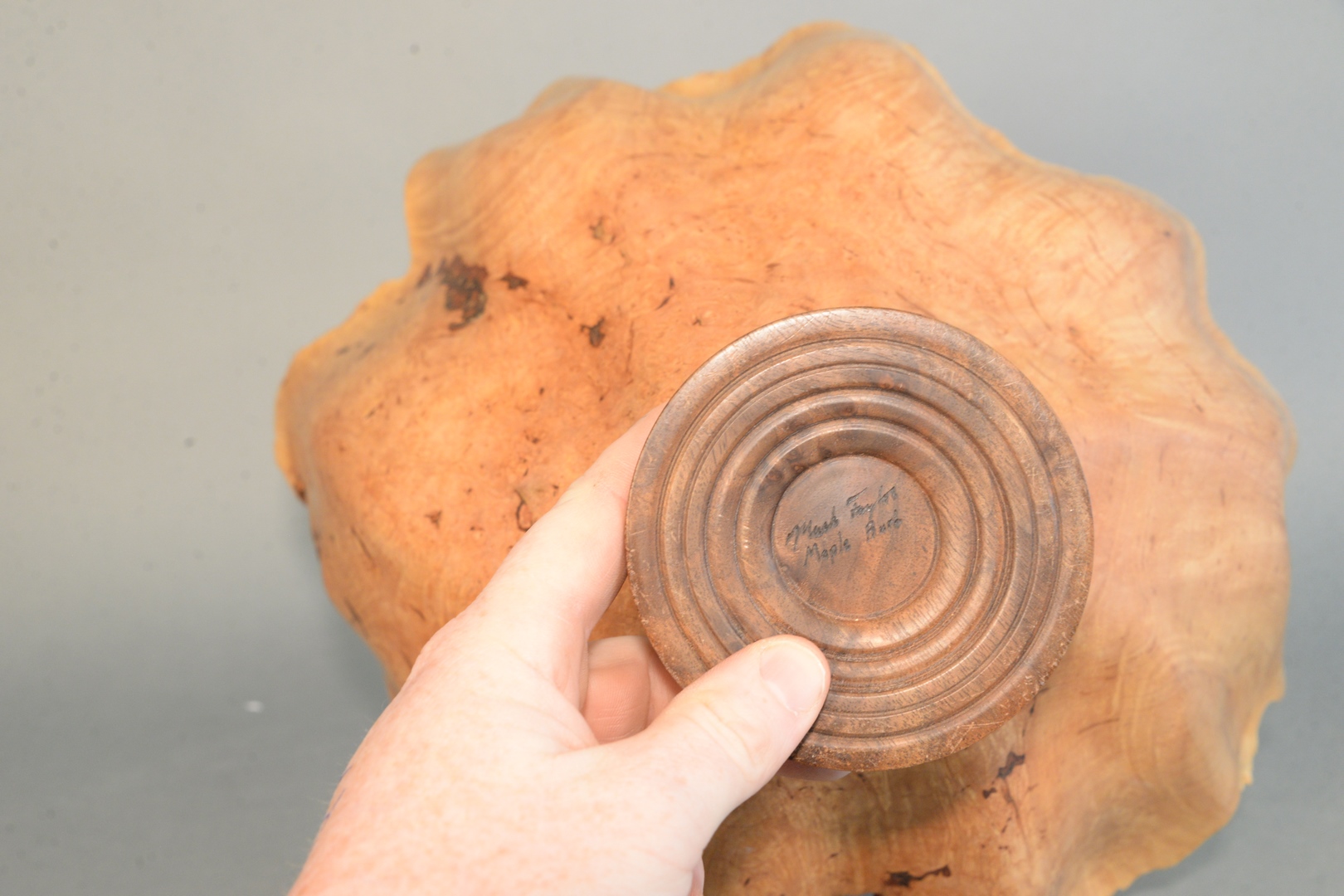 Freeform bowl on pedestal, turned maple burl wood, signed and inscribed on the underside of the base,