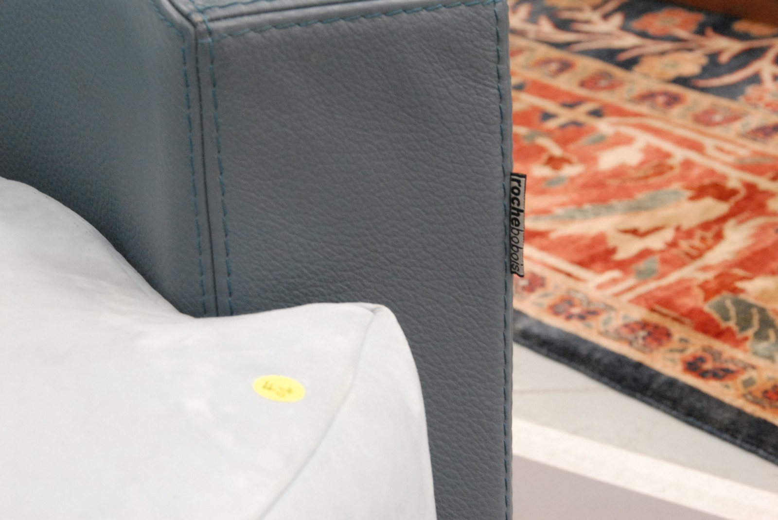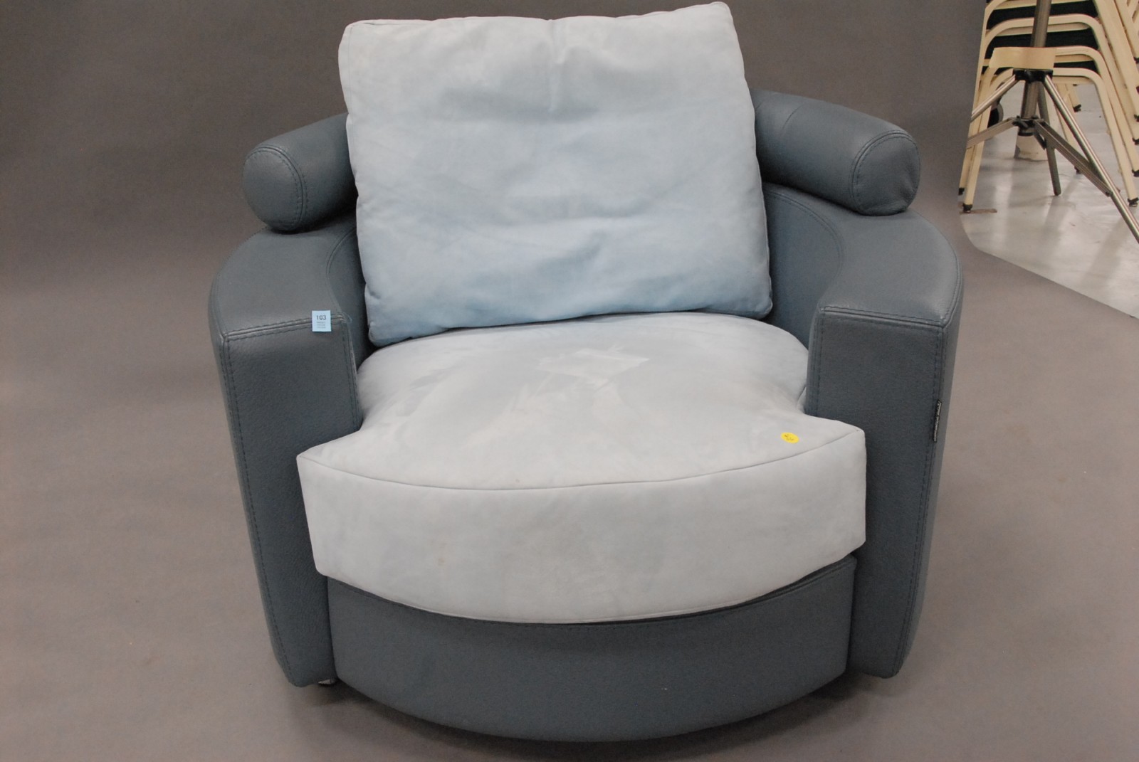 Roche Bobois leather and suede round swivel chair, signed. New cost over 5000.00