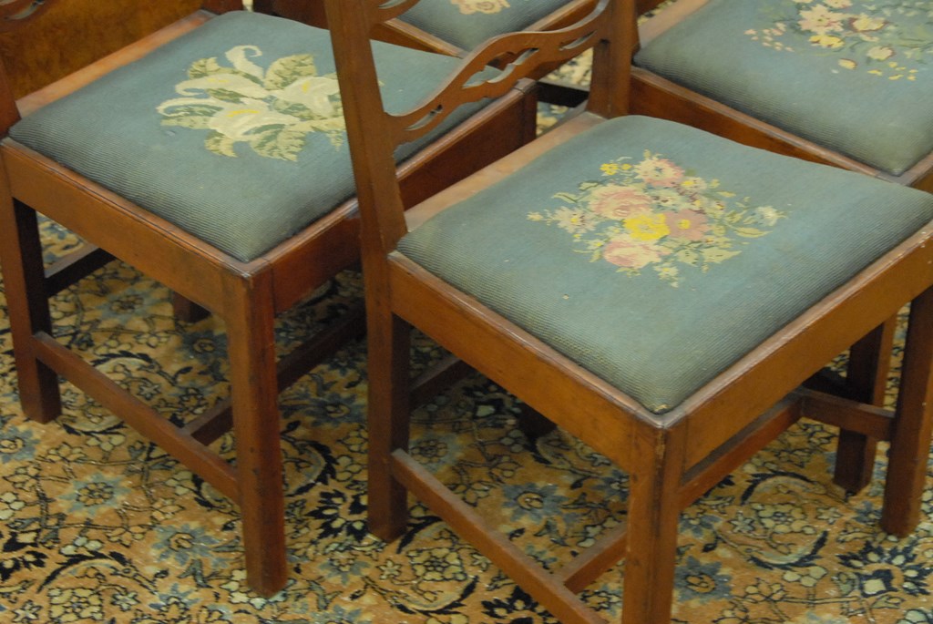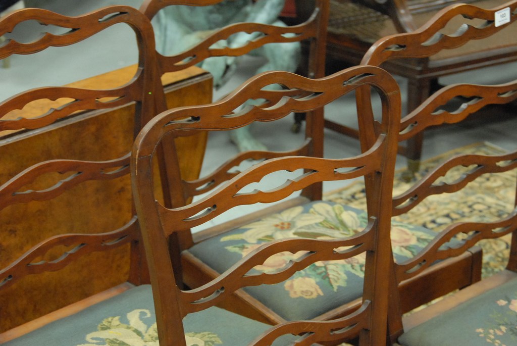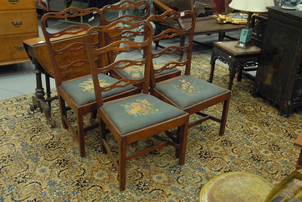 Lot 103: Set of four Chippendale chairs with pierced ladderbacks and slip seats on square legs with stretchers, circa 1780. ht. 38in. seat h…