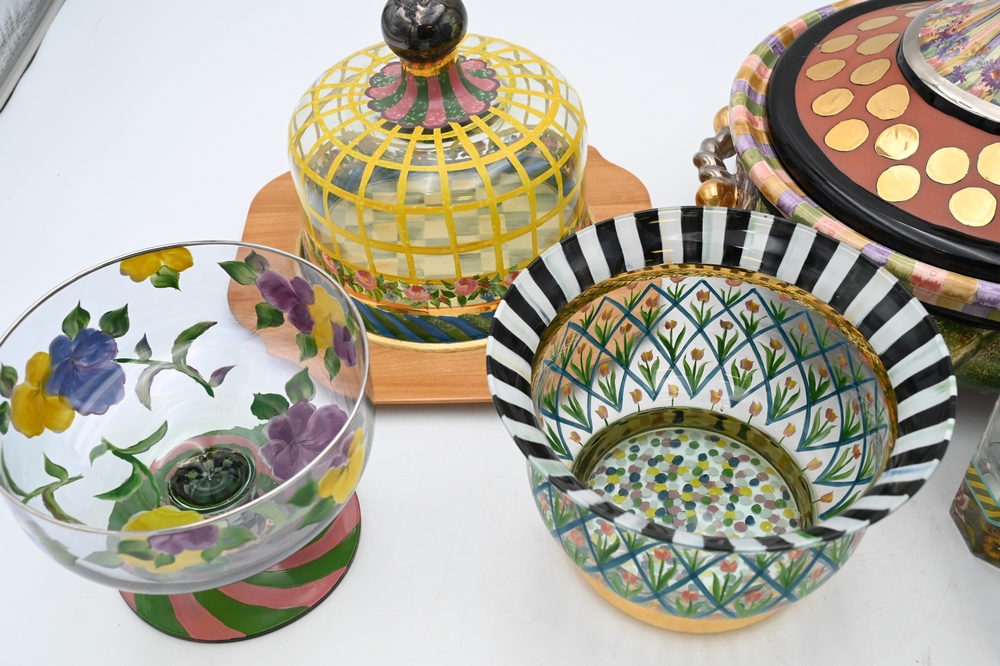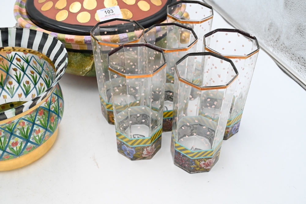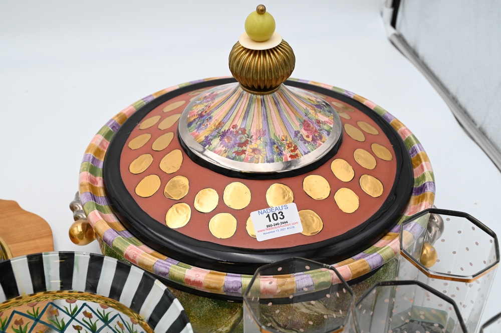 Lot 103: Ten Piece Mackenzie-Childs Group, to include large covered center serving tureen, six eater glasses, along with three glass pieces, serving tureen height 10 inches.
