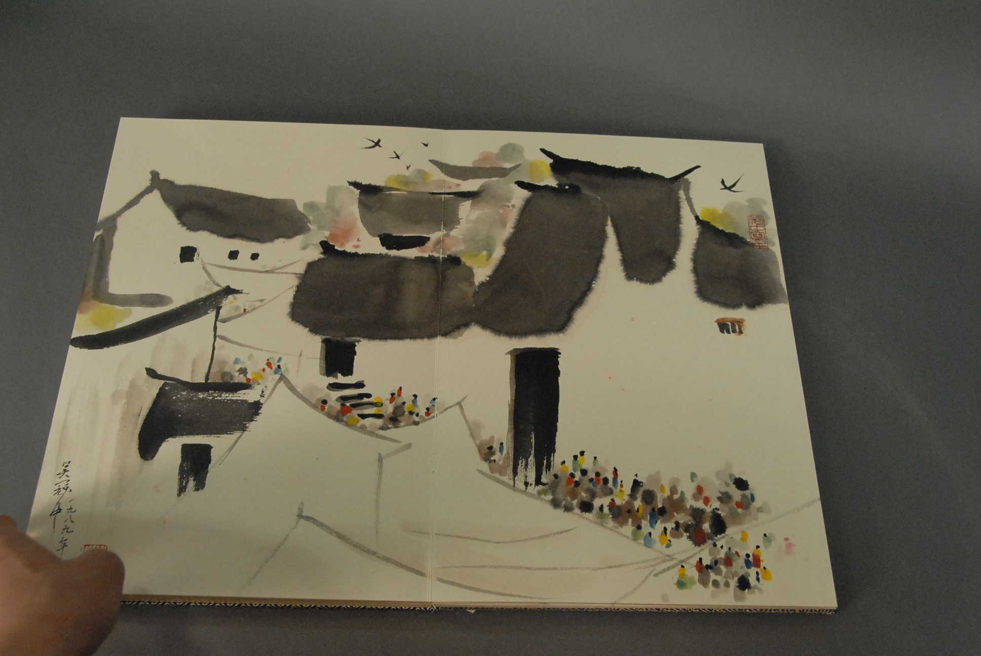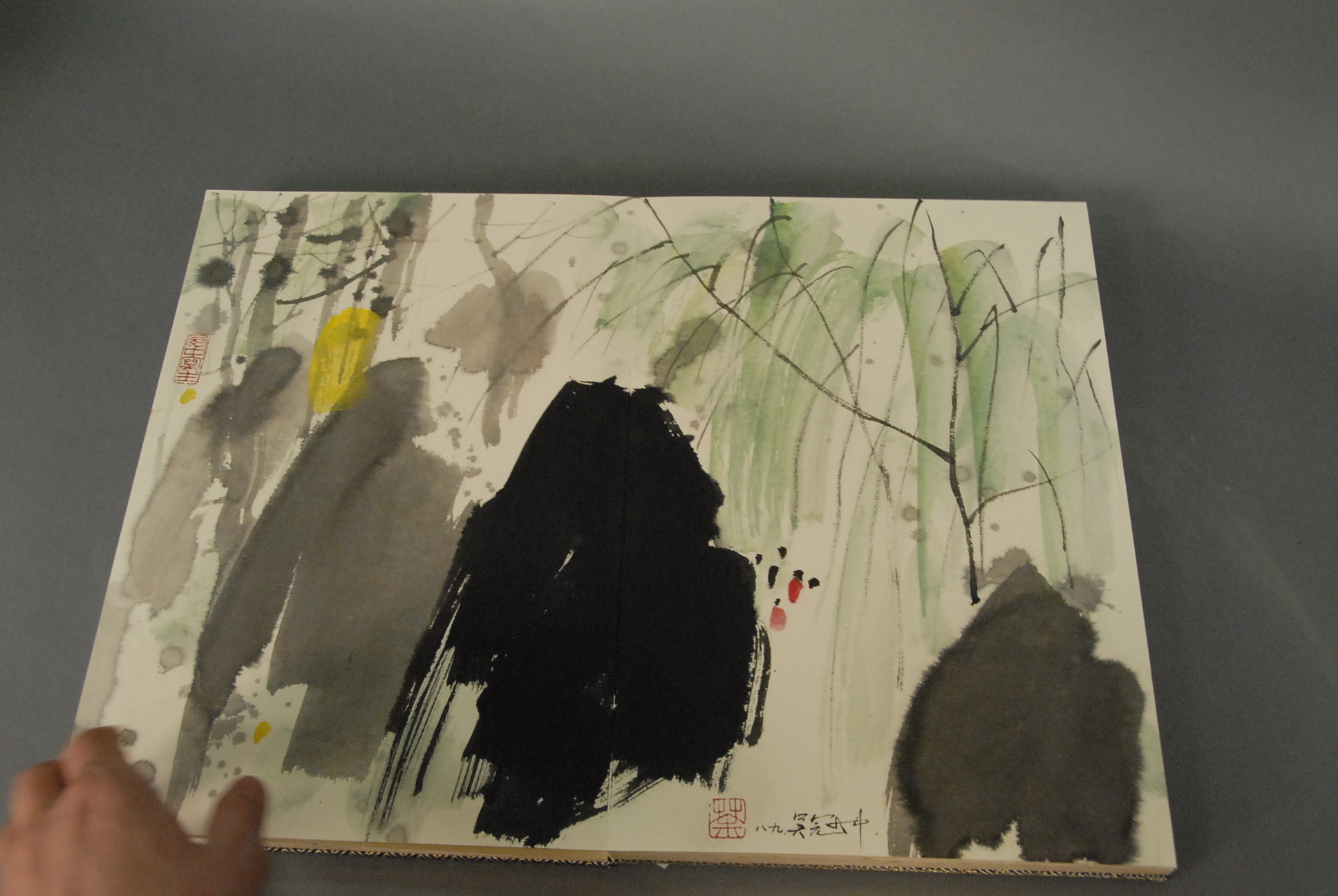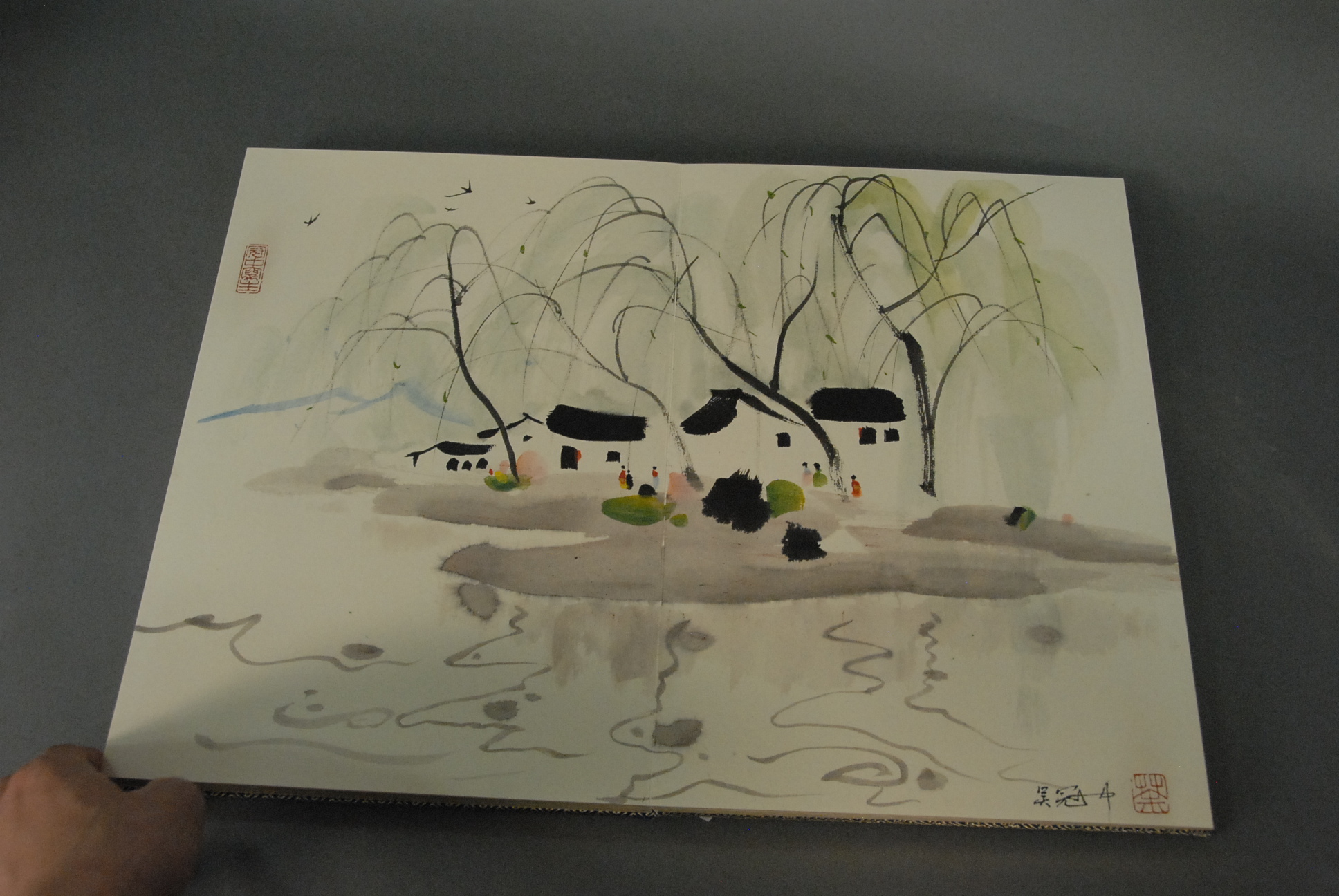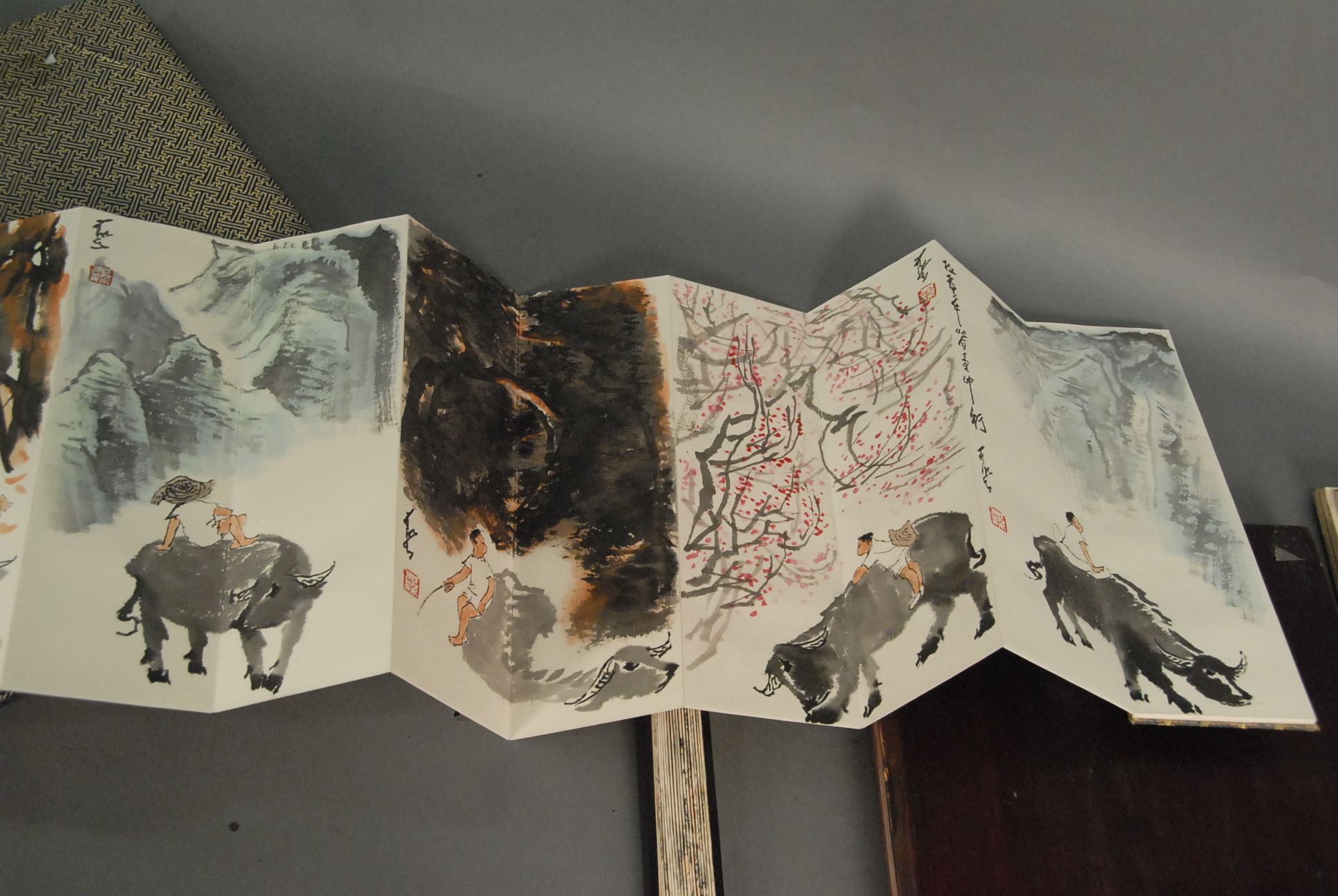 Lot 103: Three Oriental items two Oriental books 11 x 3 1/2 with ten paintings and 15 x 10 1/2 with twelve paintings, and a fan.