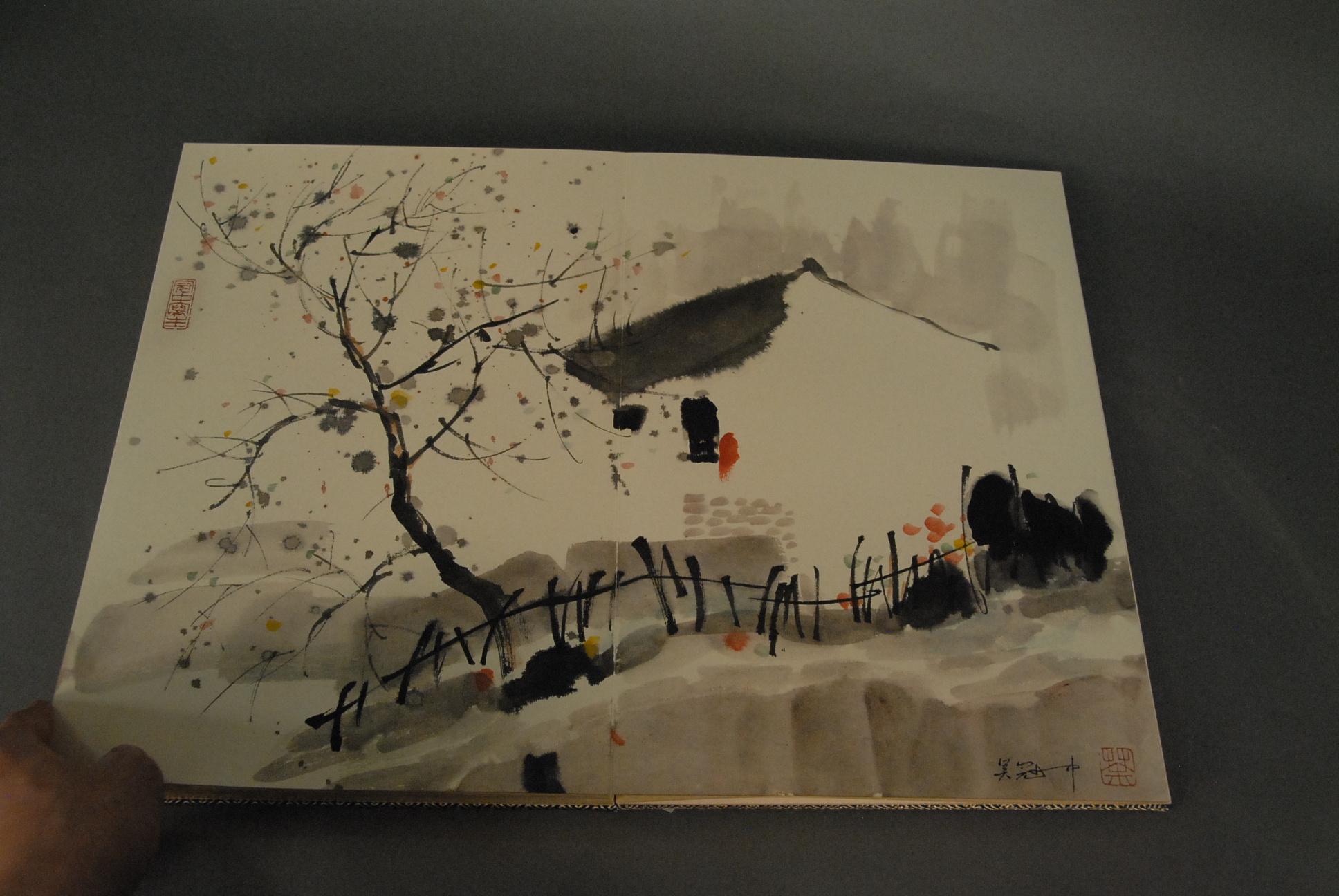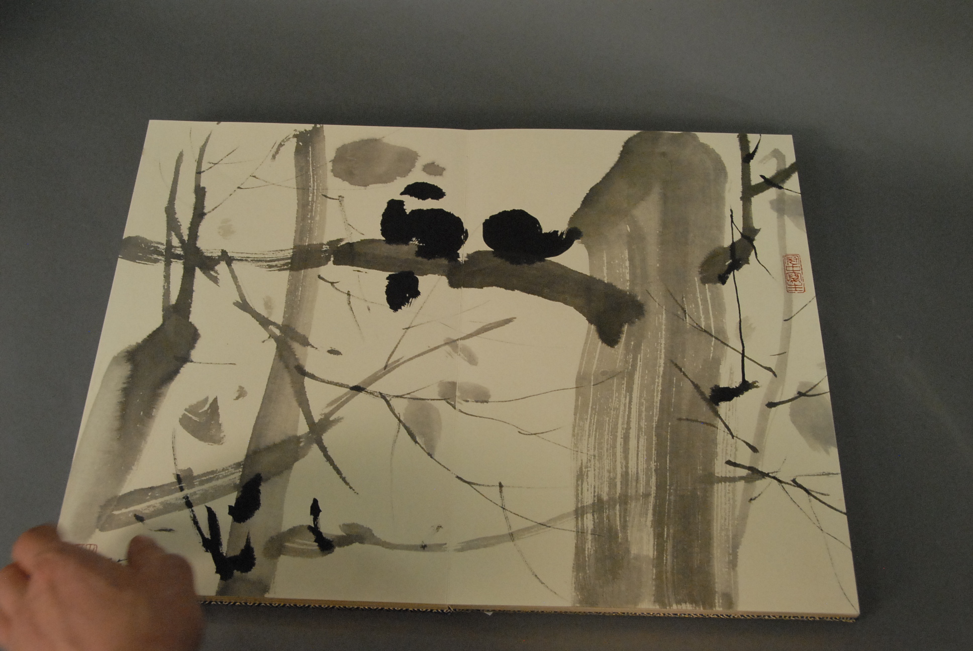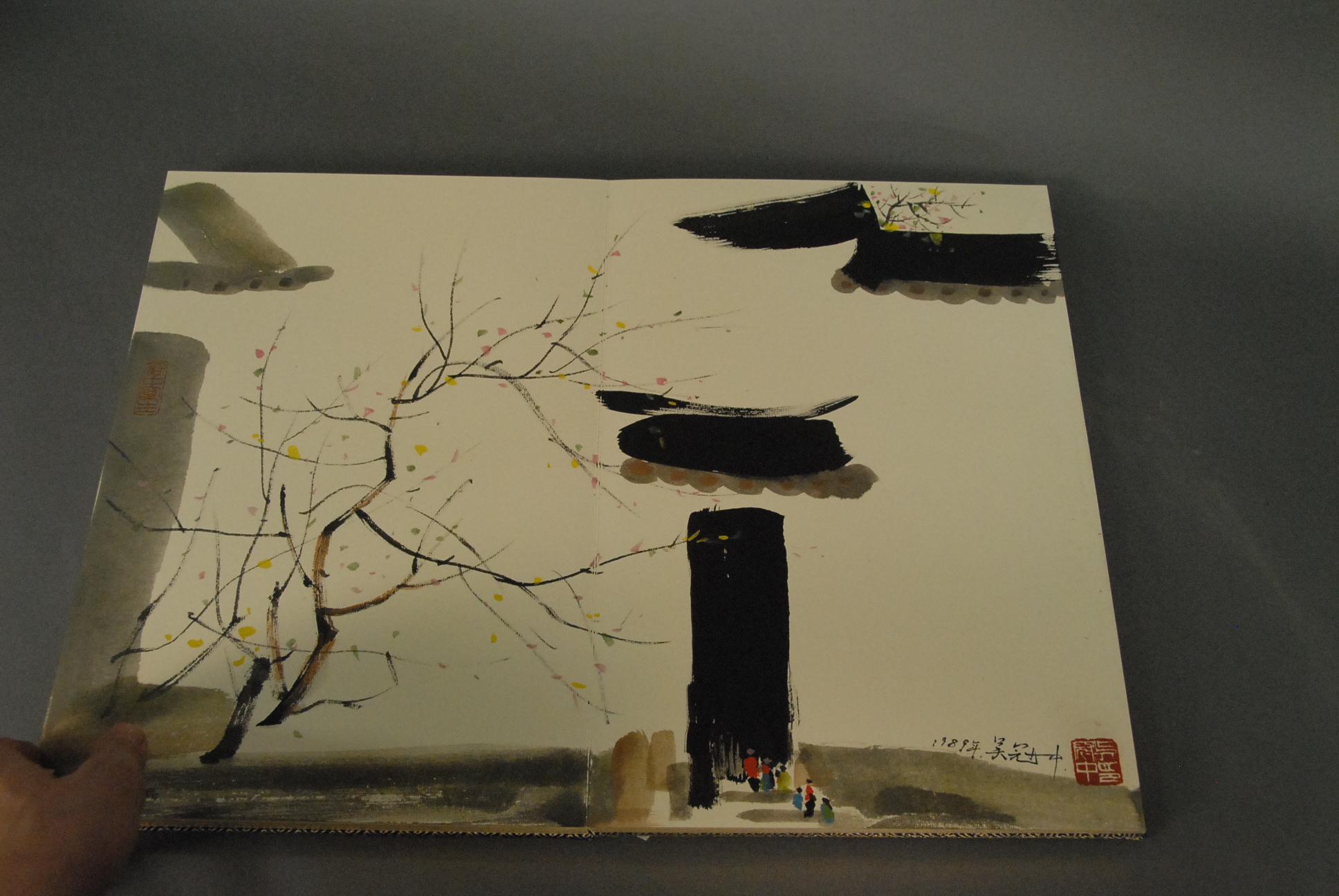 Lot 103: Three Oriental items two Oriental books 11 x 3 1/2 with ten paintings and 15 x 10 1/2 with twelve paintings, and a fan.