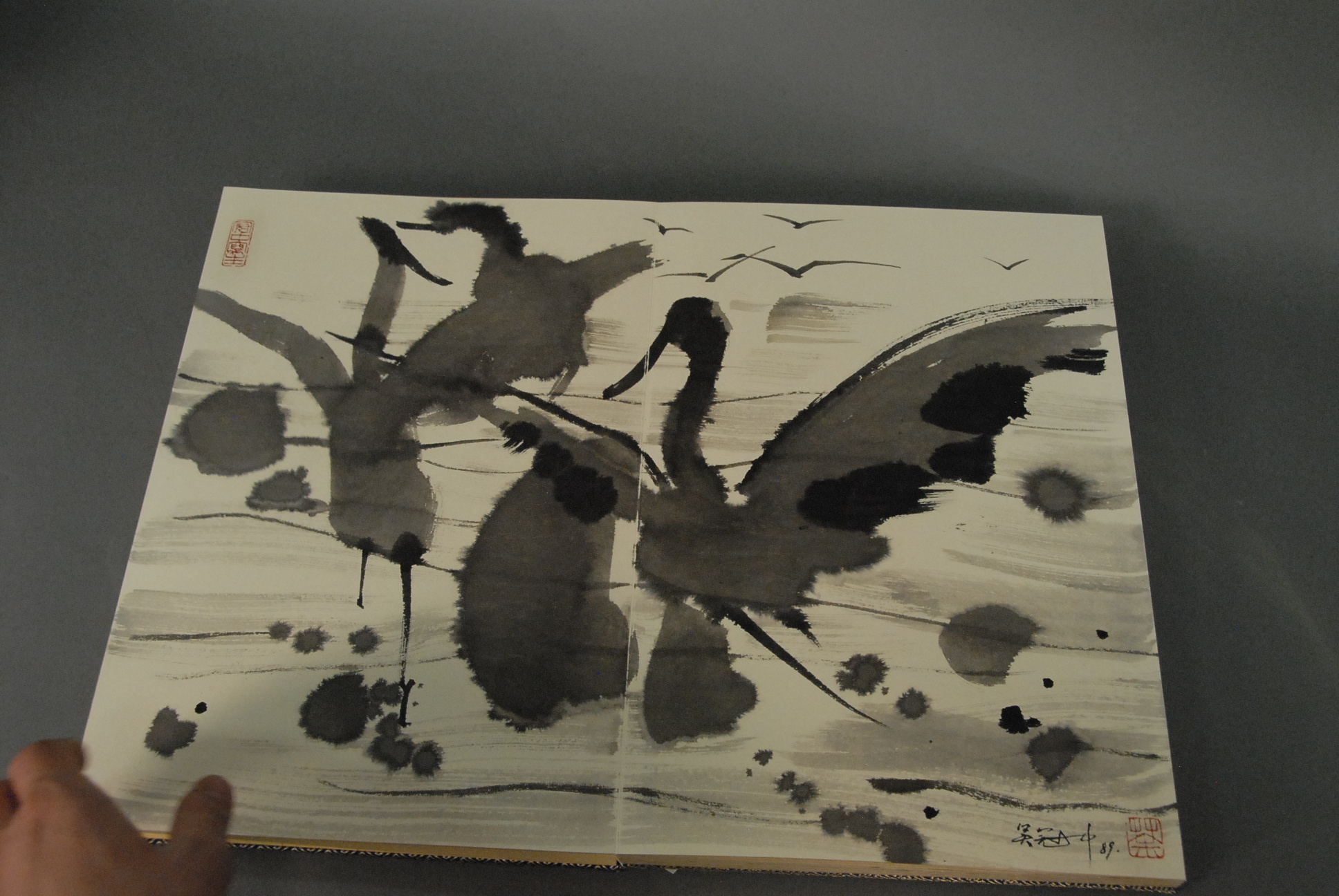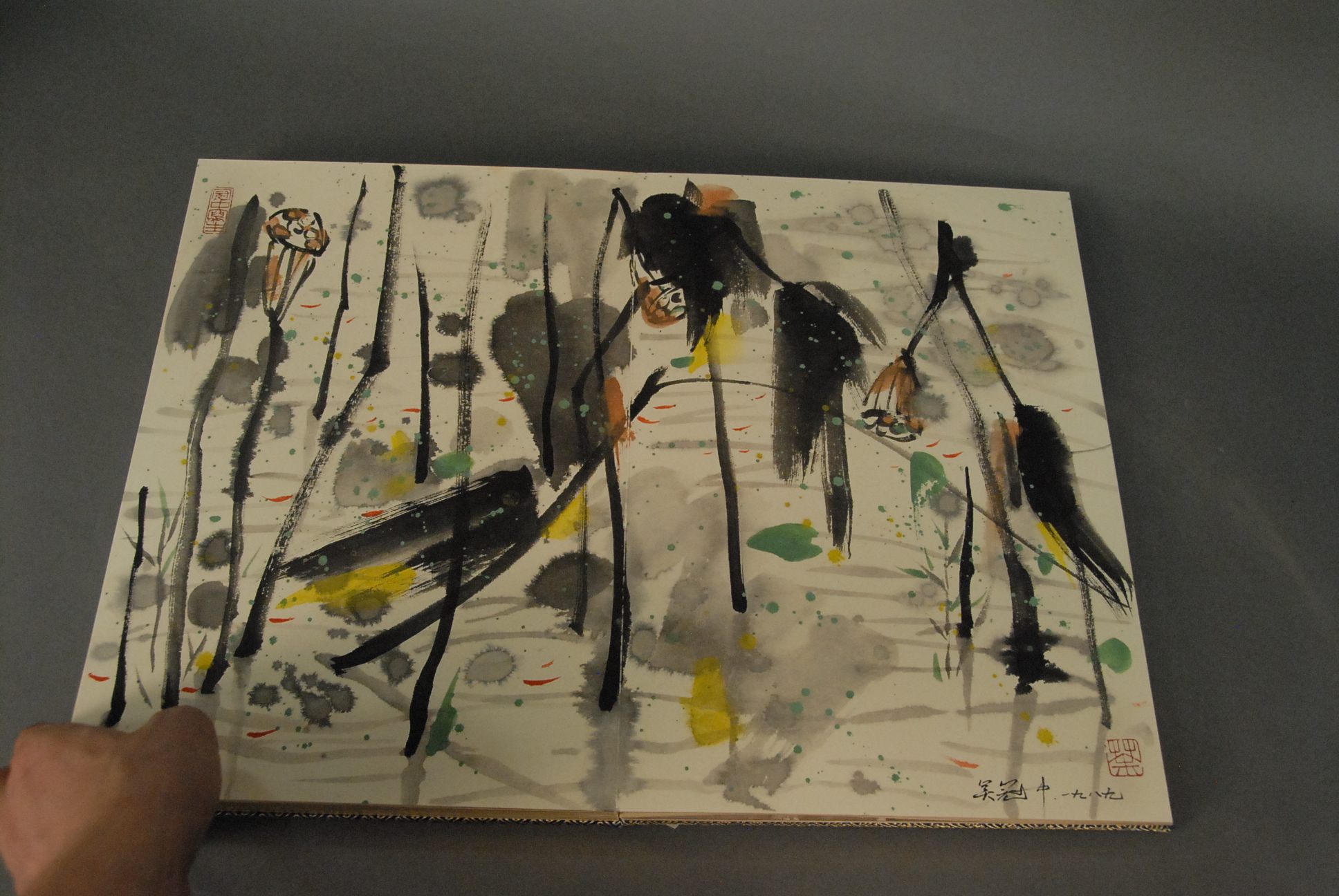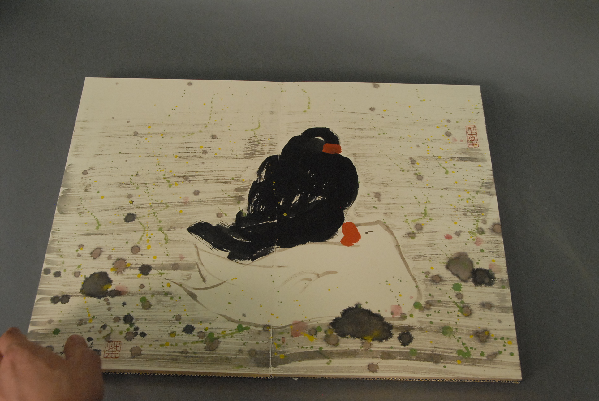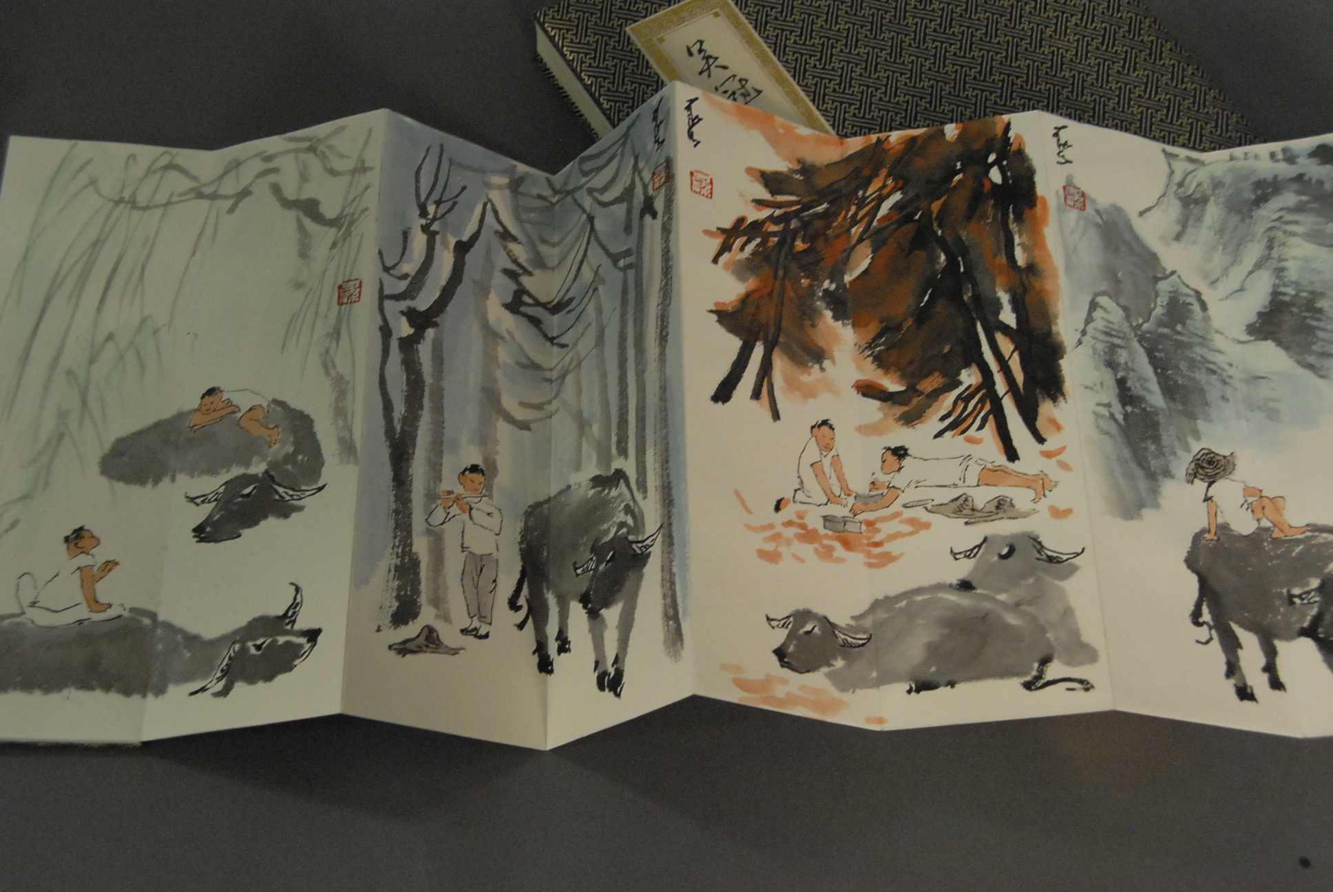 Lot 103: Three Oriental items two Oriental books 11 x 3 1/2 with ten paintings and 15 x 10 1/2 with twelve paintings, and a fan.