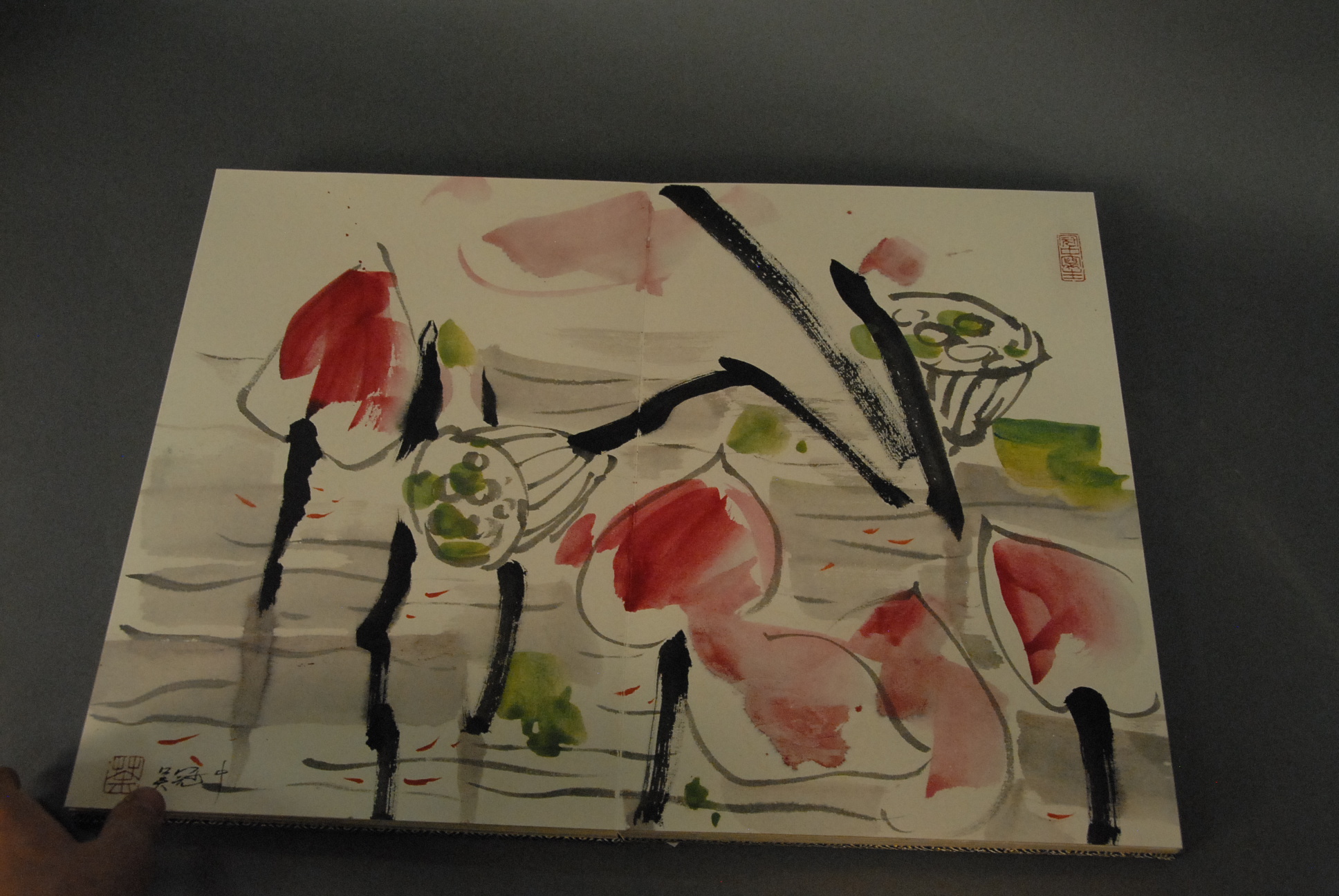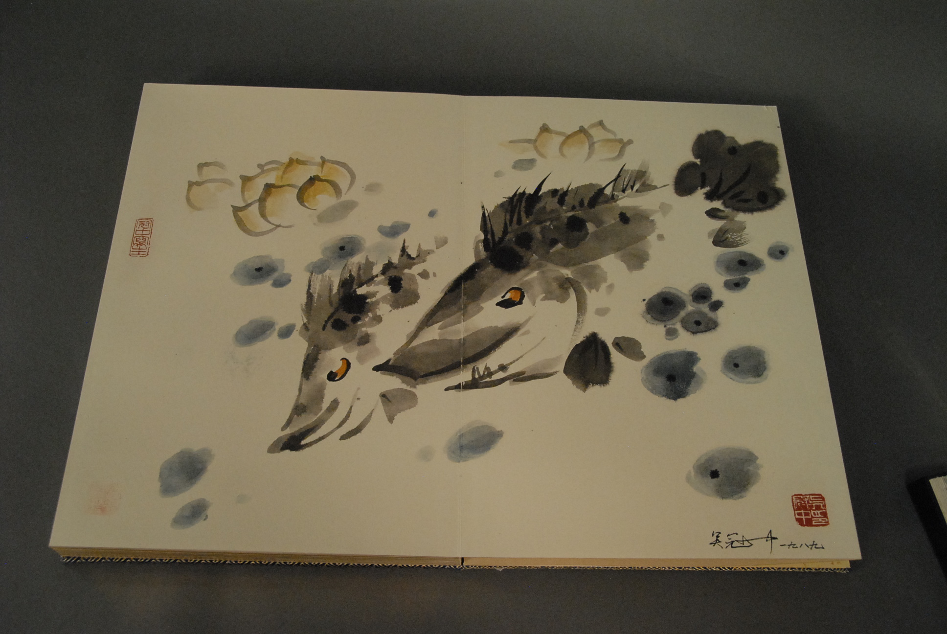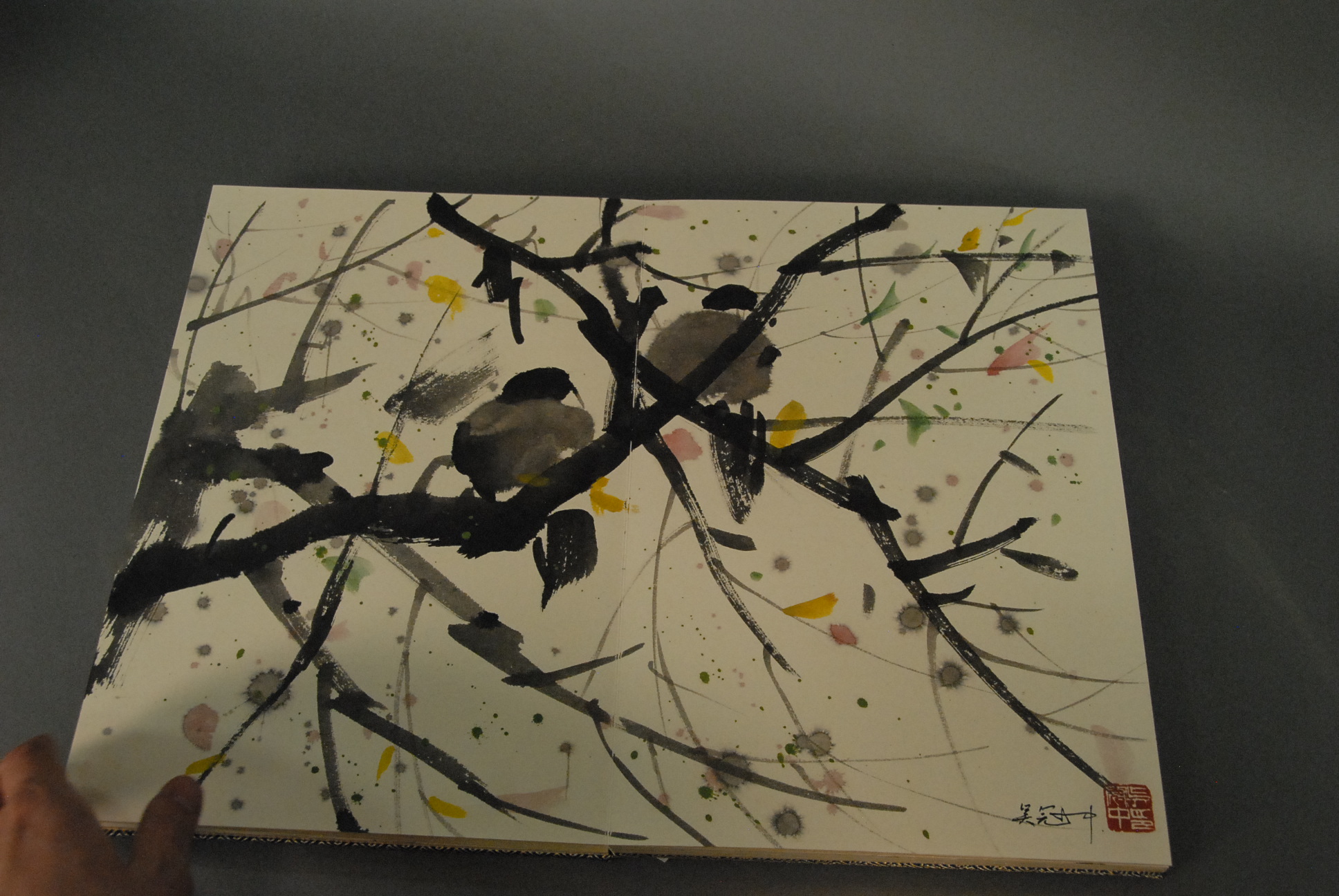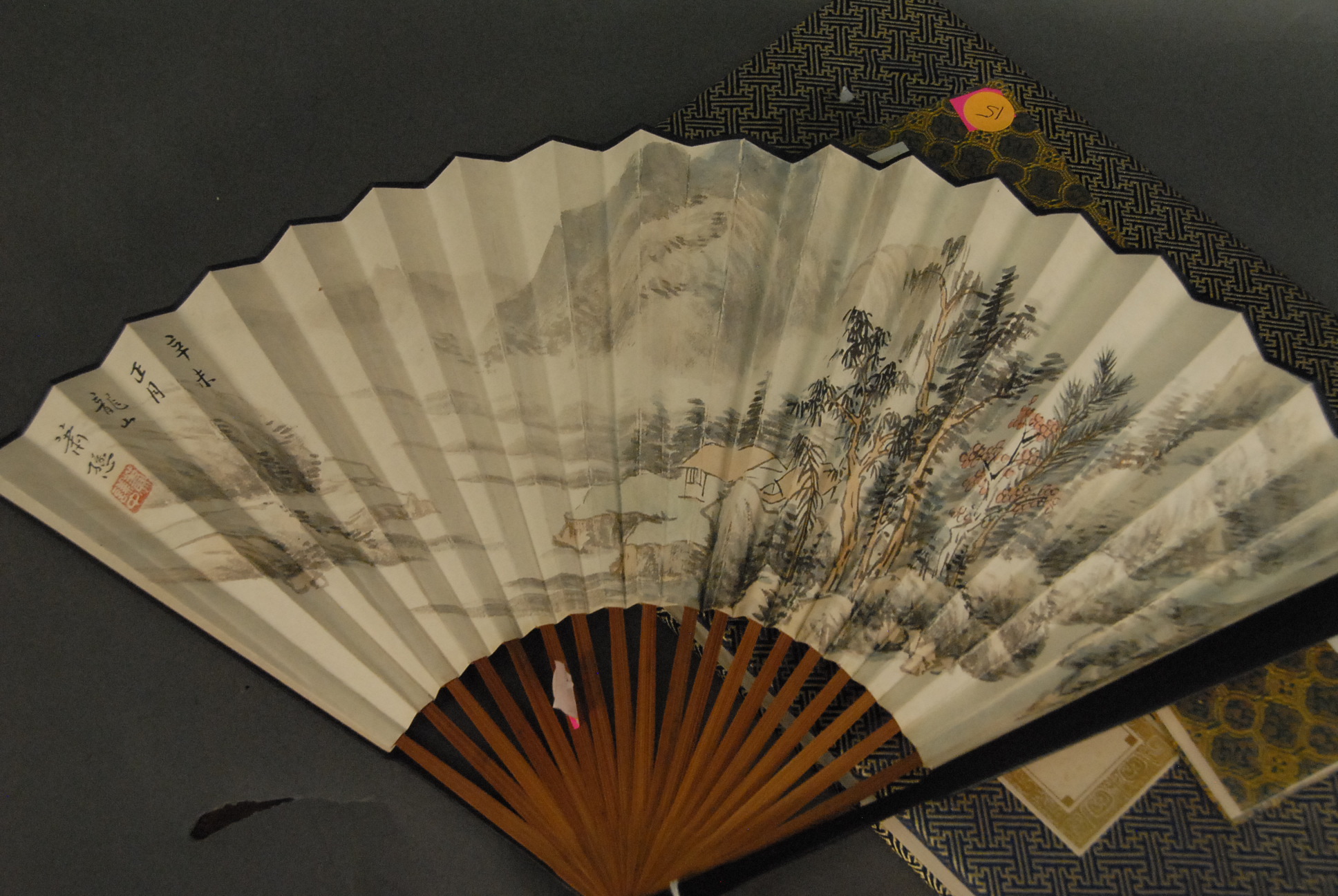 Three Oriental items two Oriental books 11 x 3 1/2 with ten paintings and 15 x 10 1/2 with twelve paintings, and a fan.