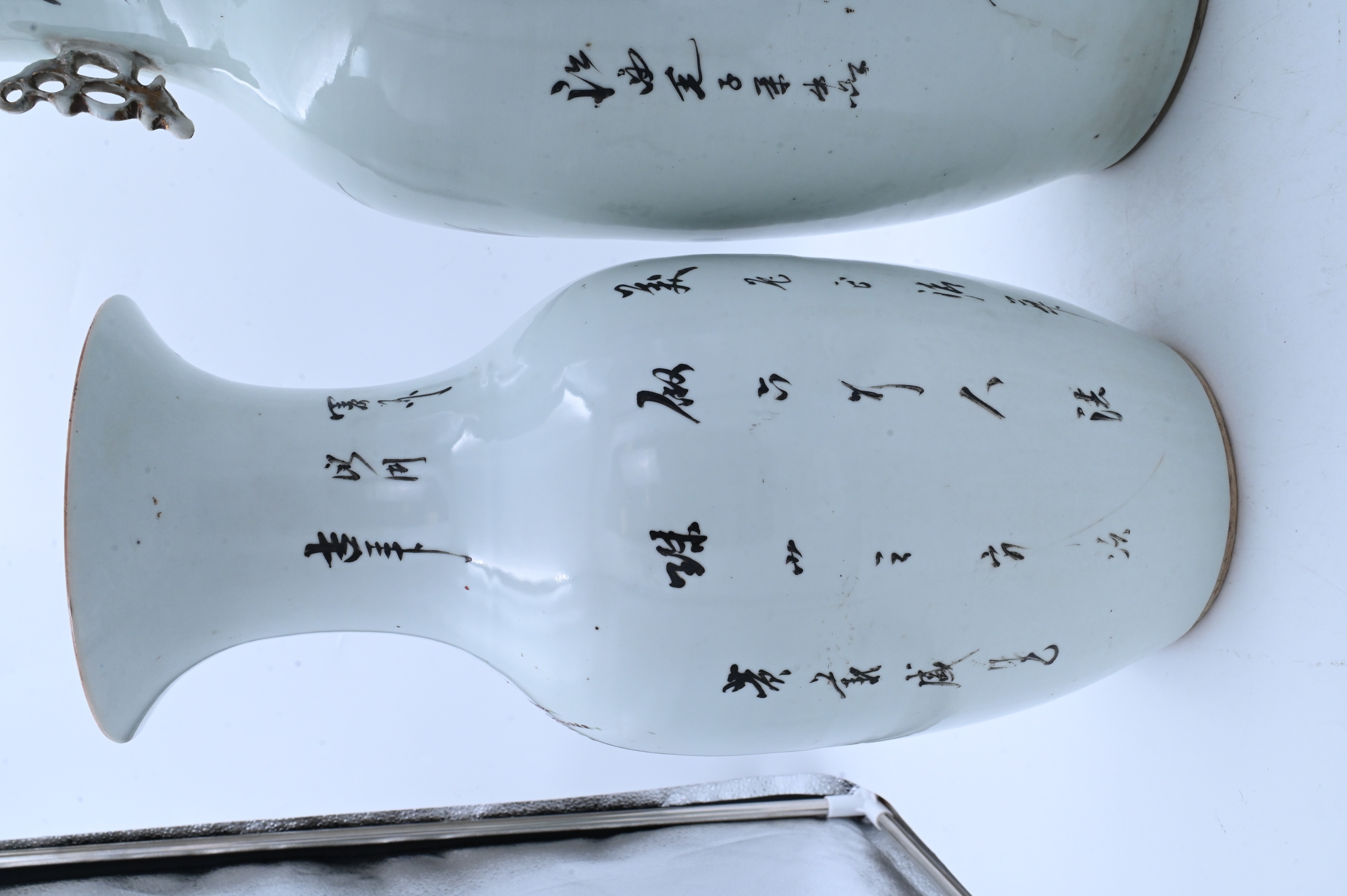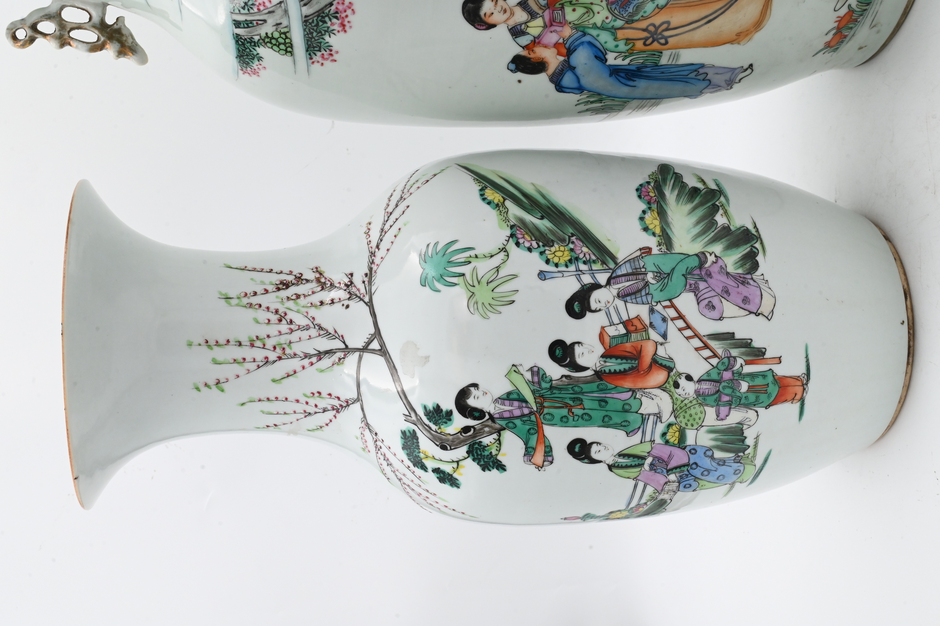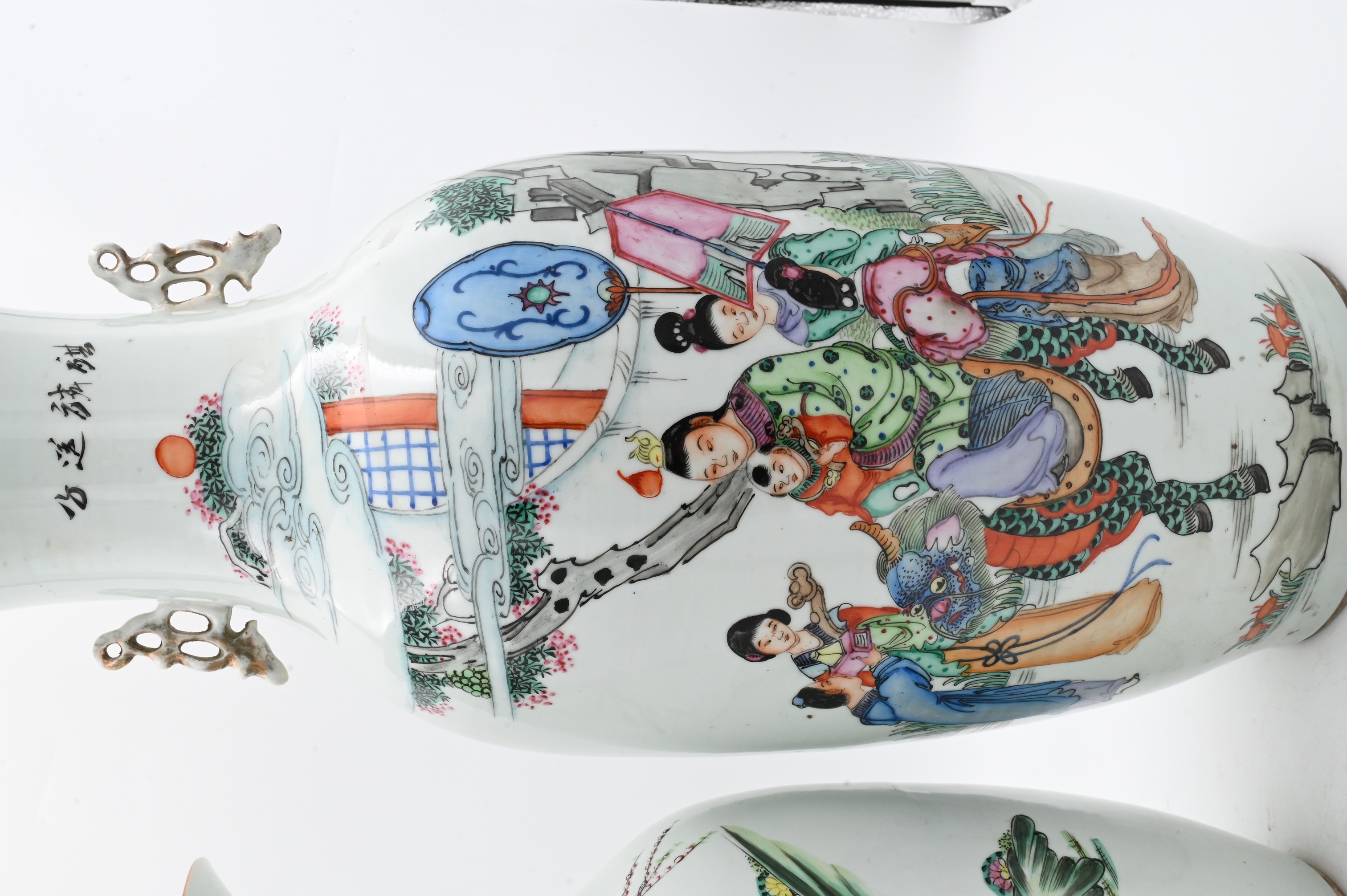 to include one vase with enamel motif of gashas in a garden, the other vase having double dragon handles featuring a processional scene with queen and prince riding a mythical creature