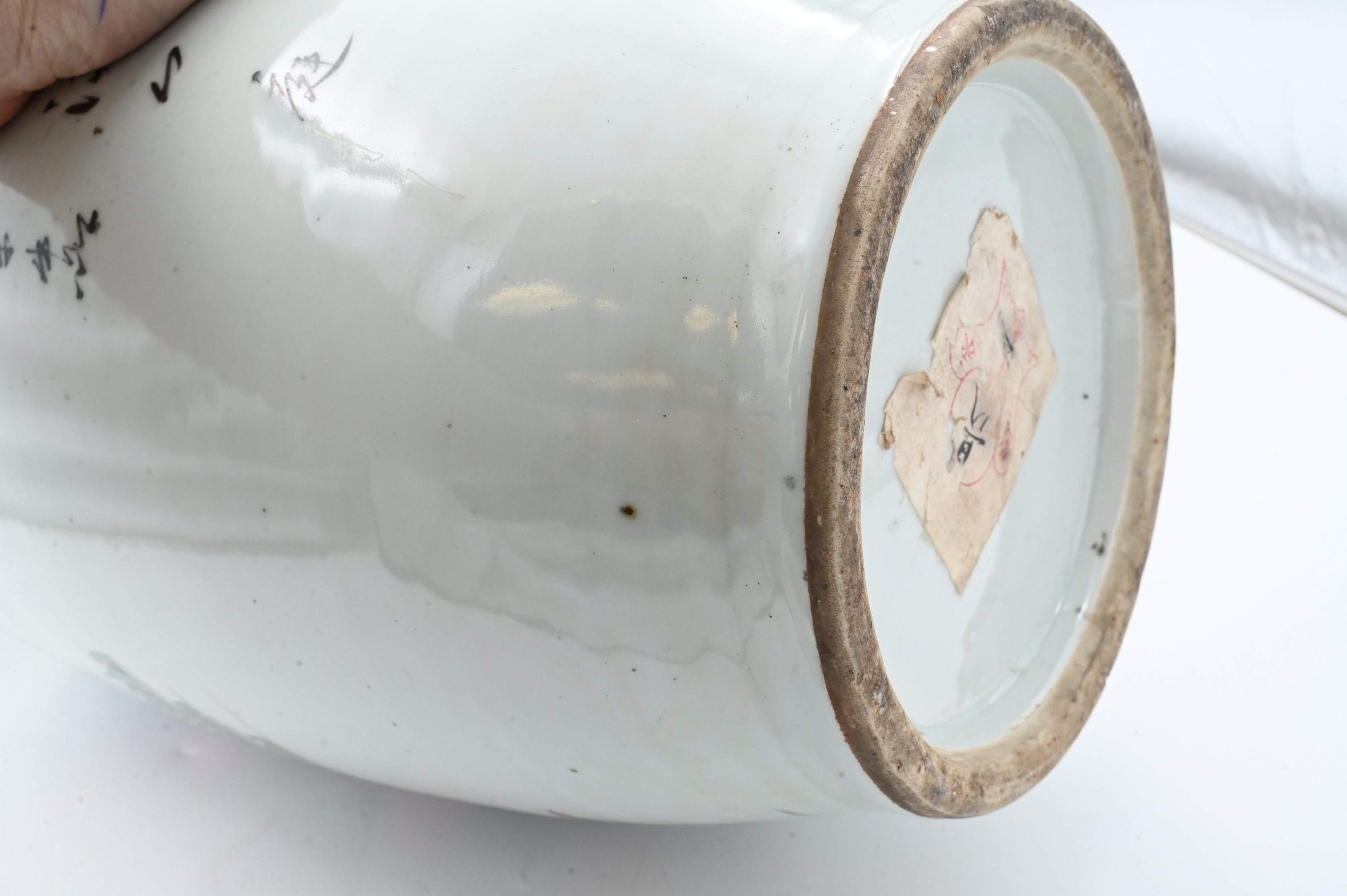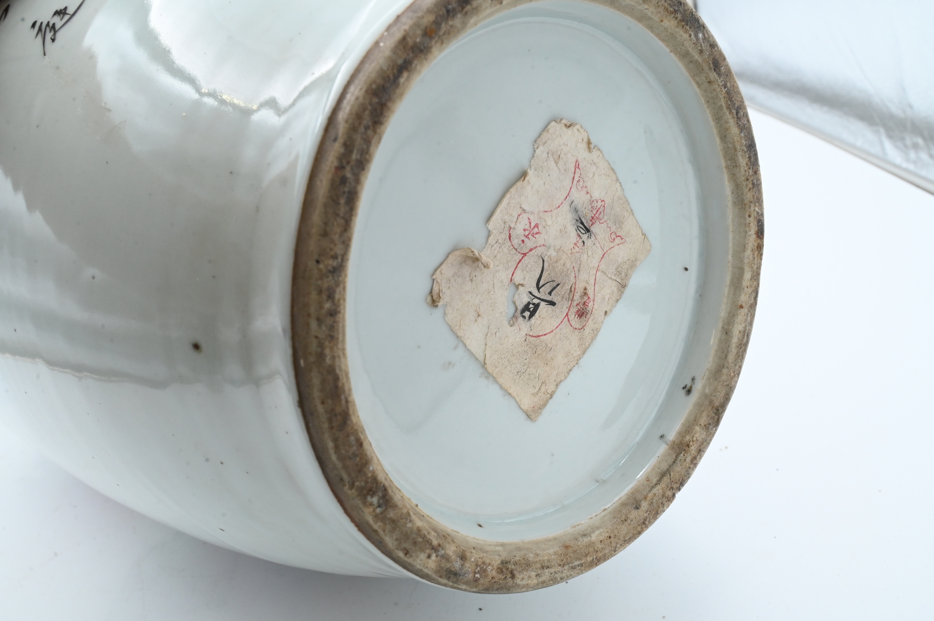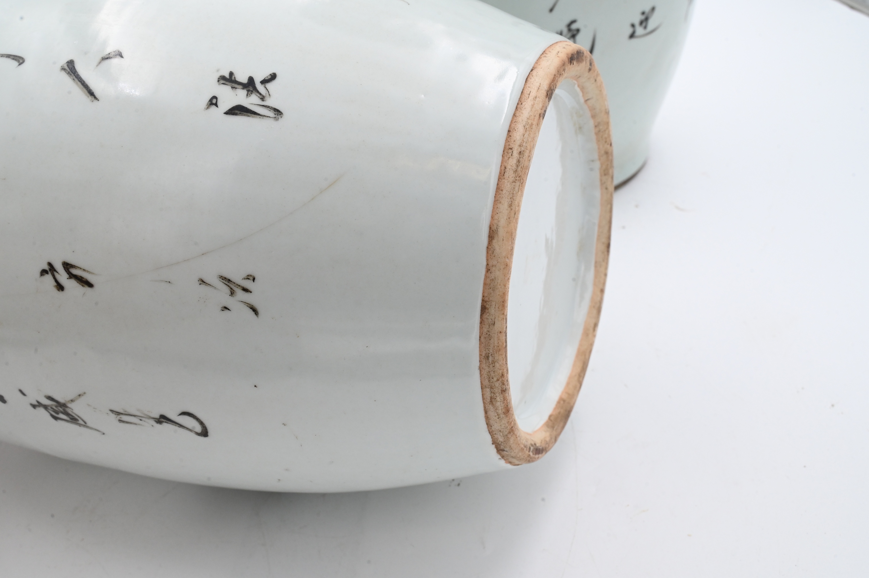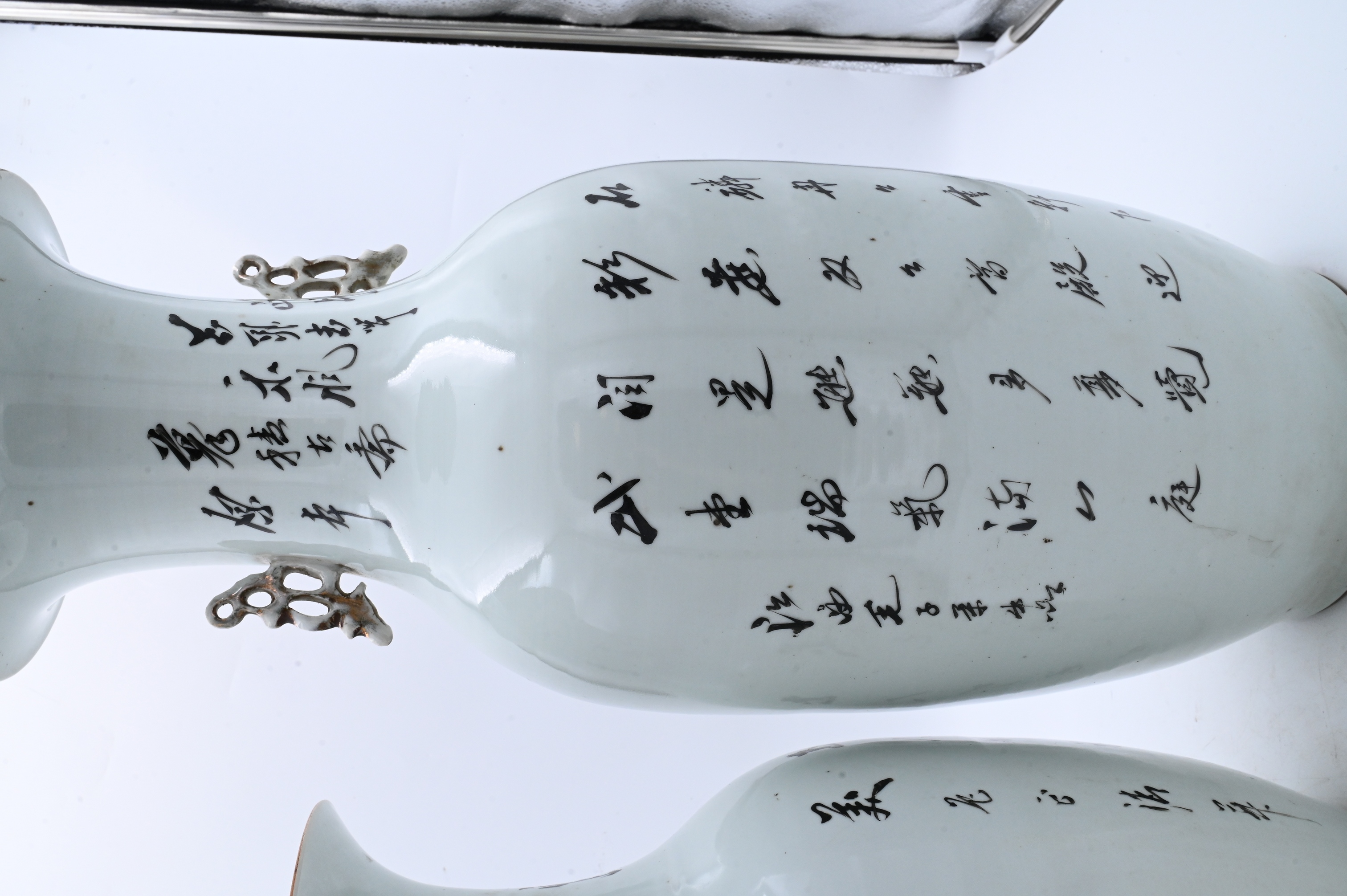 to include one vase with enamel motif of gashas in a garden, the other vase having double dragon handles featuring a processional scene with queen and prince riding a mythical creature