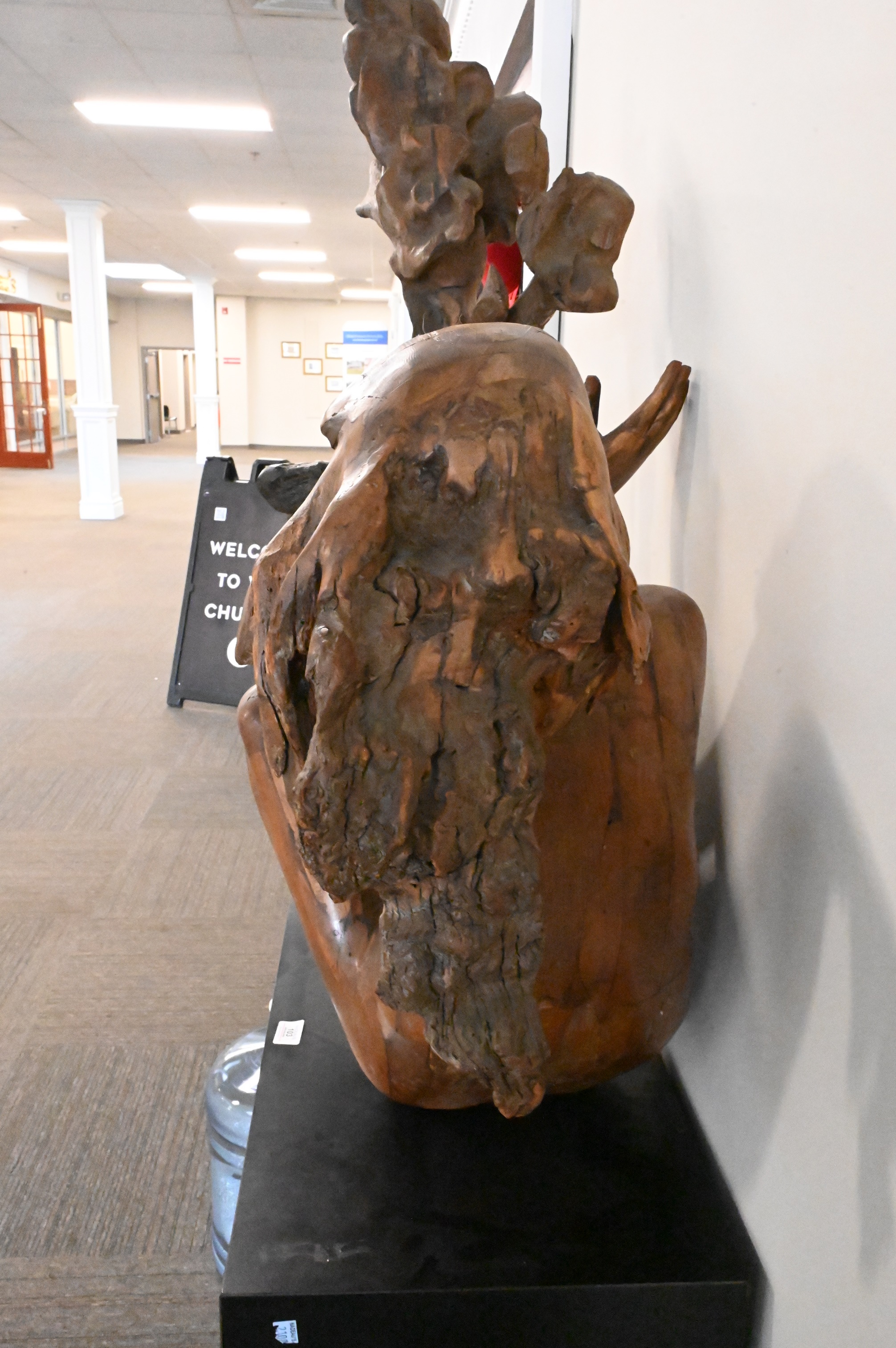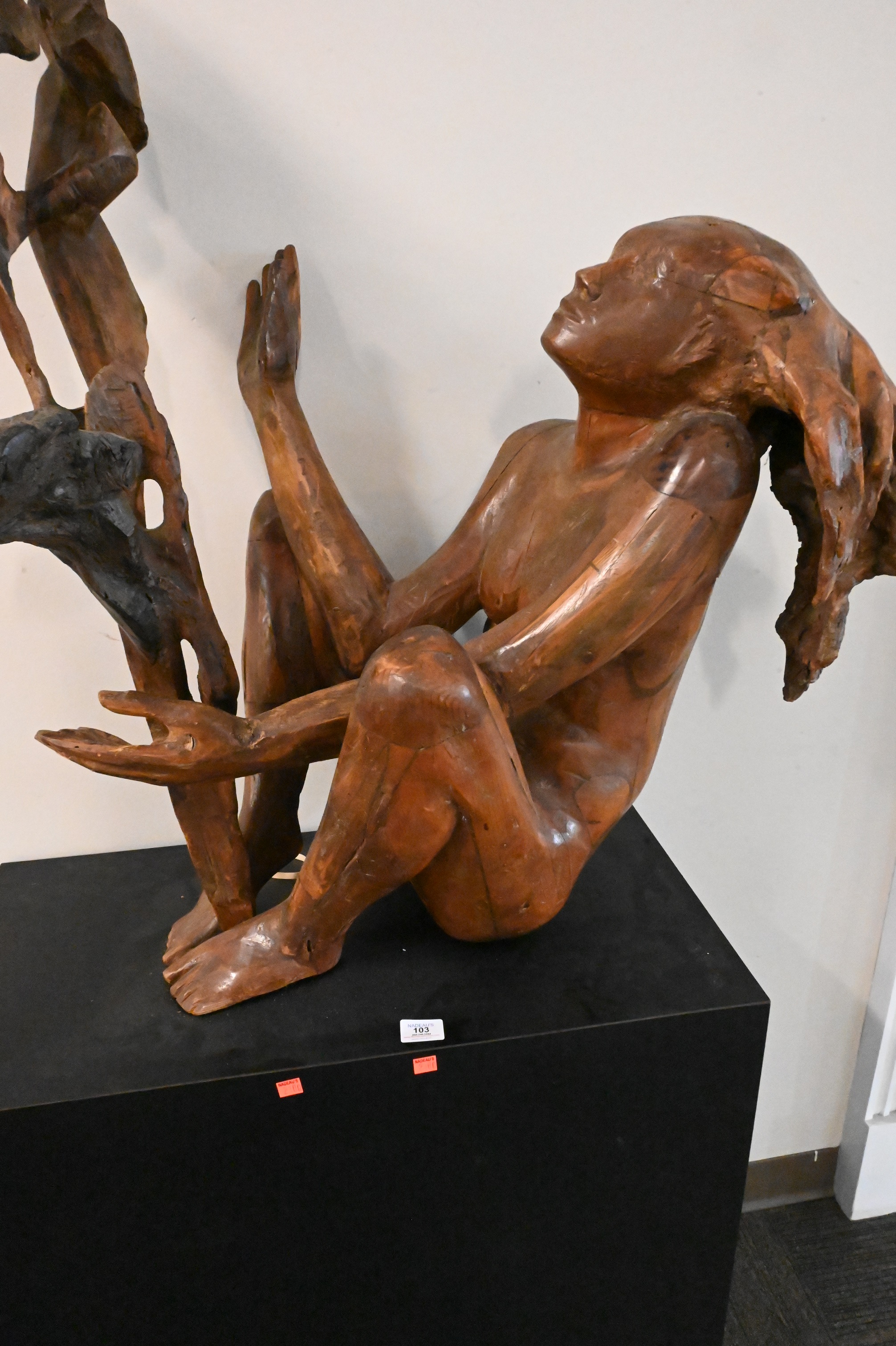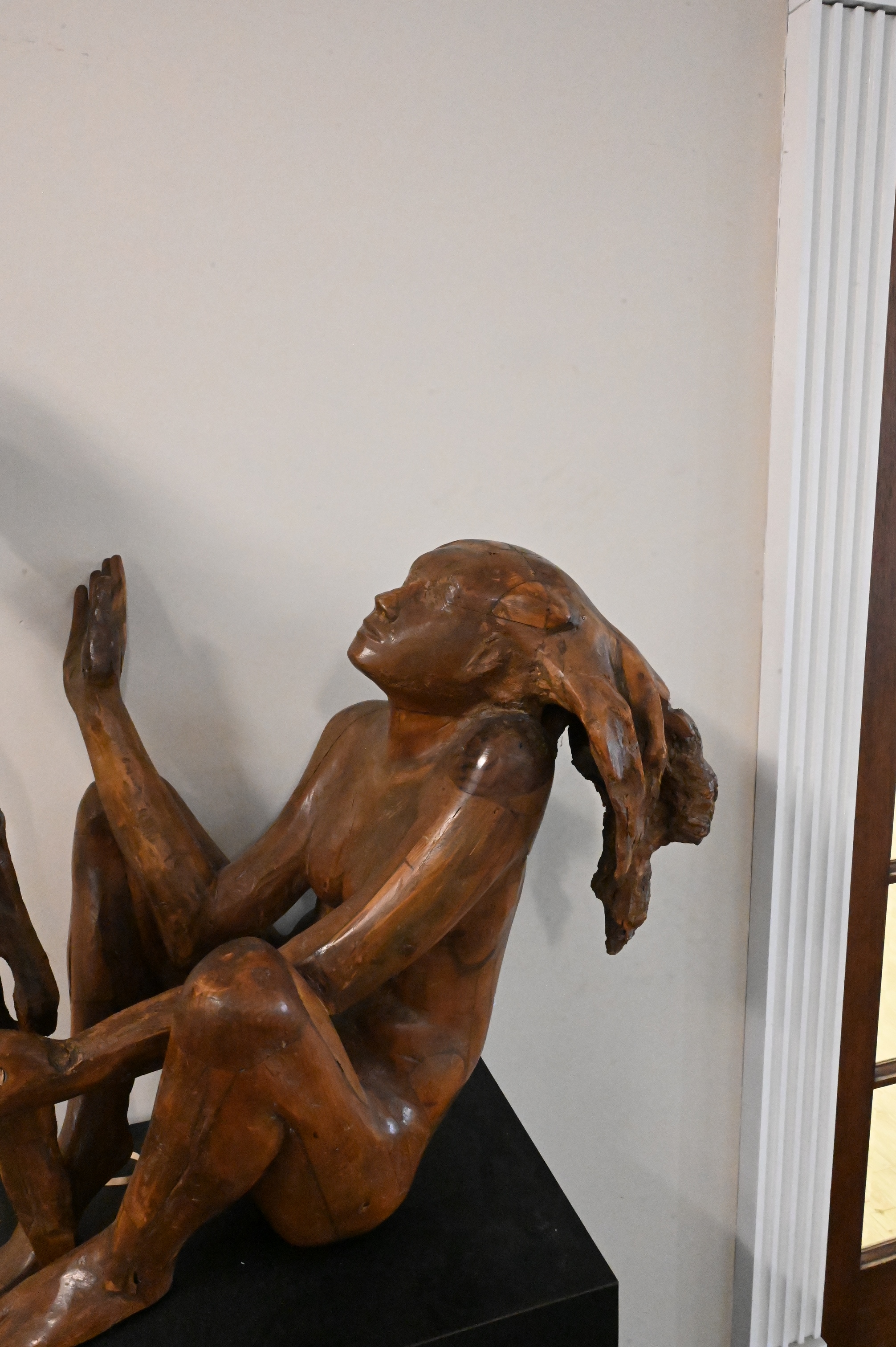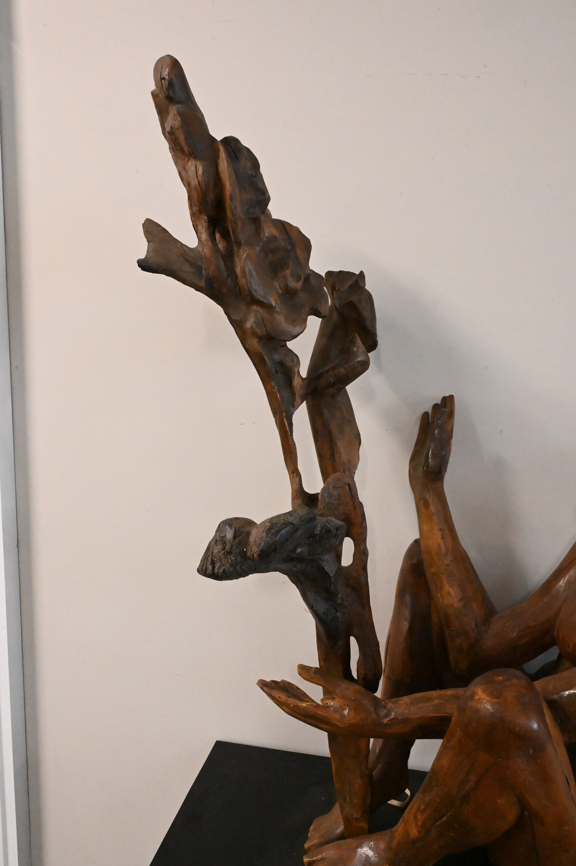 Mixed media wood sculpture on pedestal