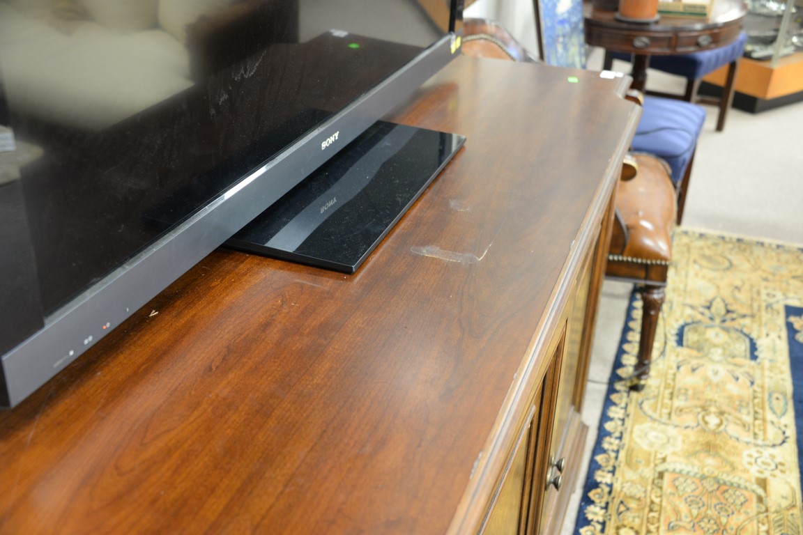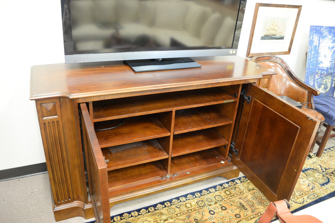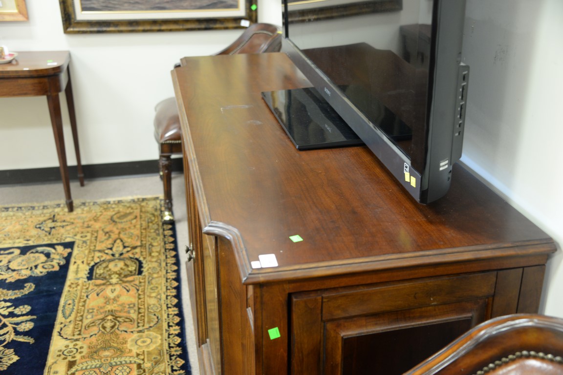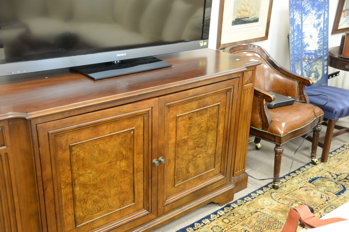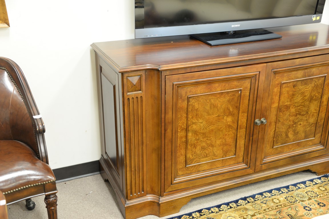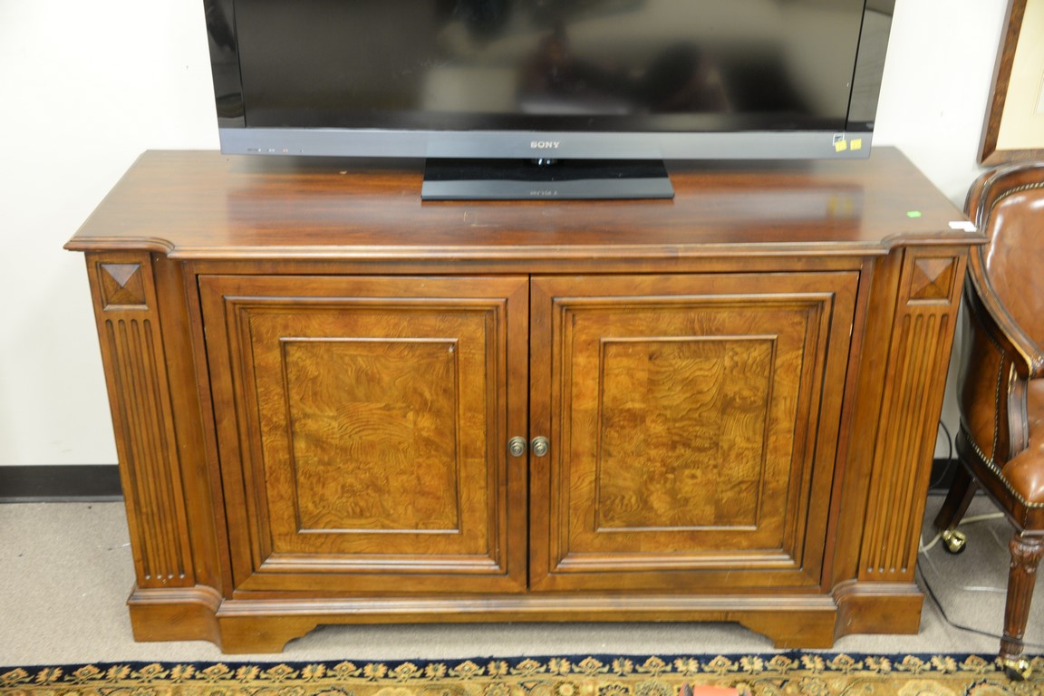 Cherry and burlwood two door cabinet. ht. 36in., top: 23 x 65