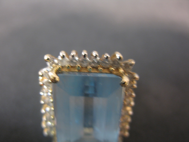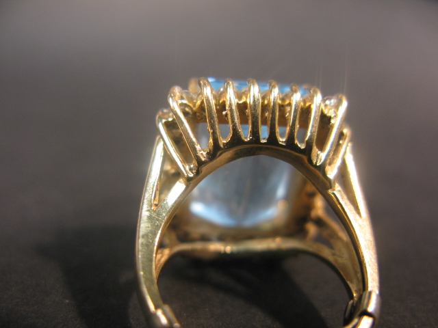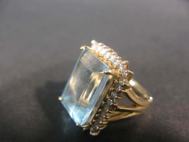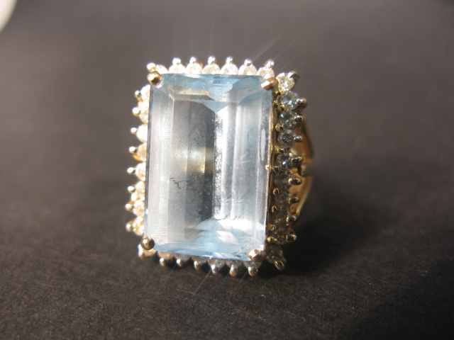 14K gold ring set with a large aquamarine surrounded by diamonds.