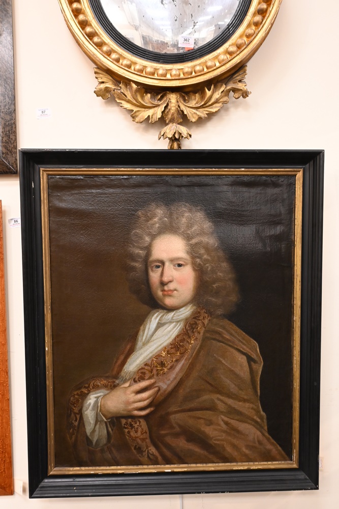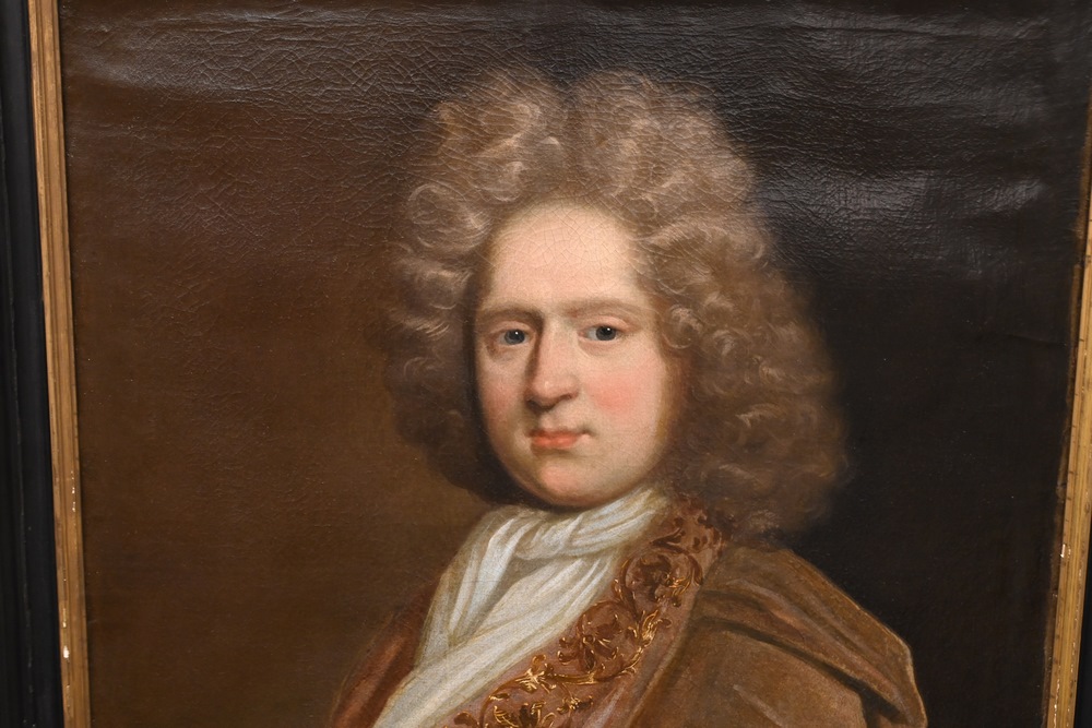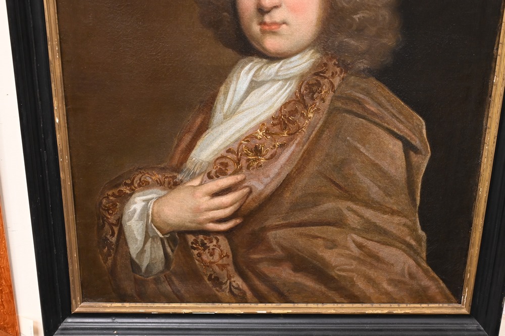 Lot 104: British School 17th/18th century portrait of a nobleman in a beige robe oil on canvas unsigned having a partial paper label adhered to the reverse 30 1/2 x 25 1/2 inches