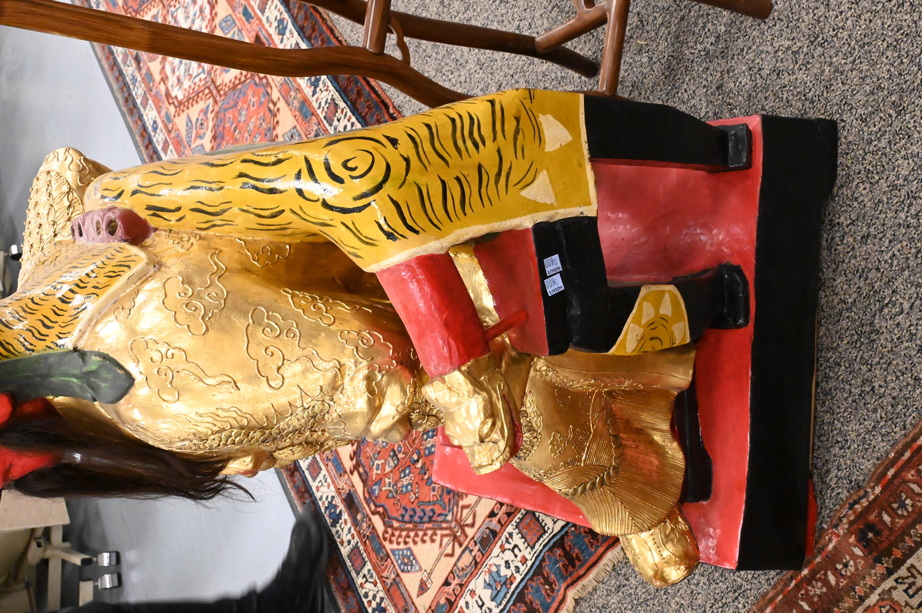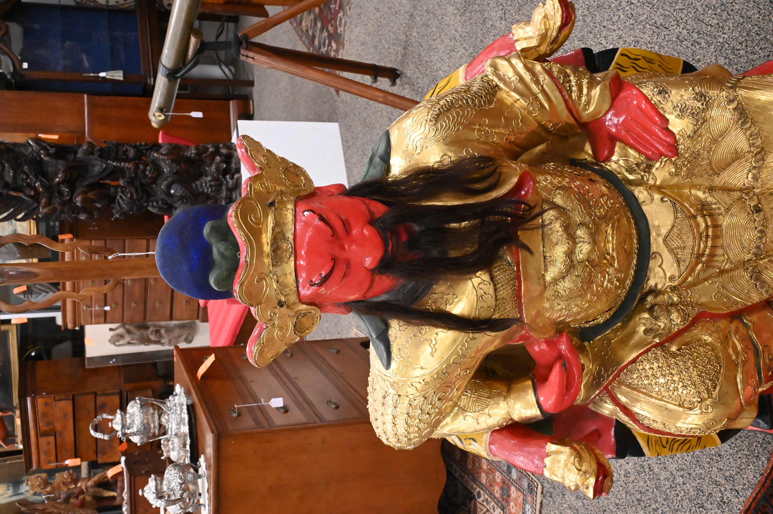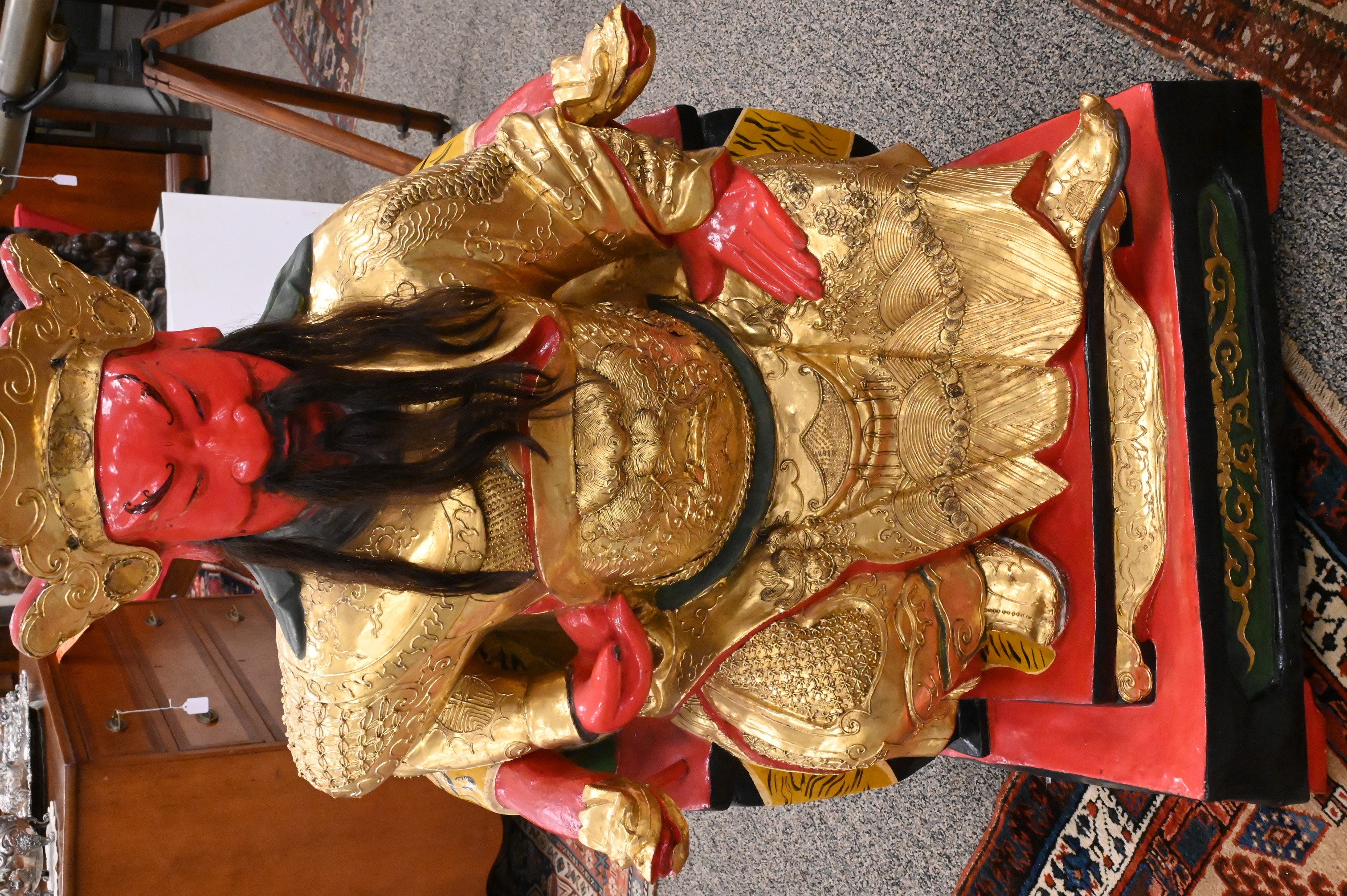 featuring the red painted figure sitting on a polychrome throne with dragon handle accents, lacquered leather horse hair beard, and detailed gilted garb, early 19th century