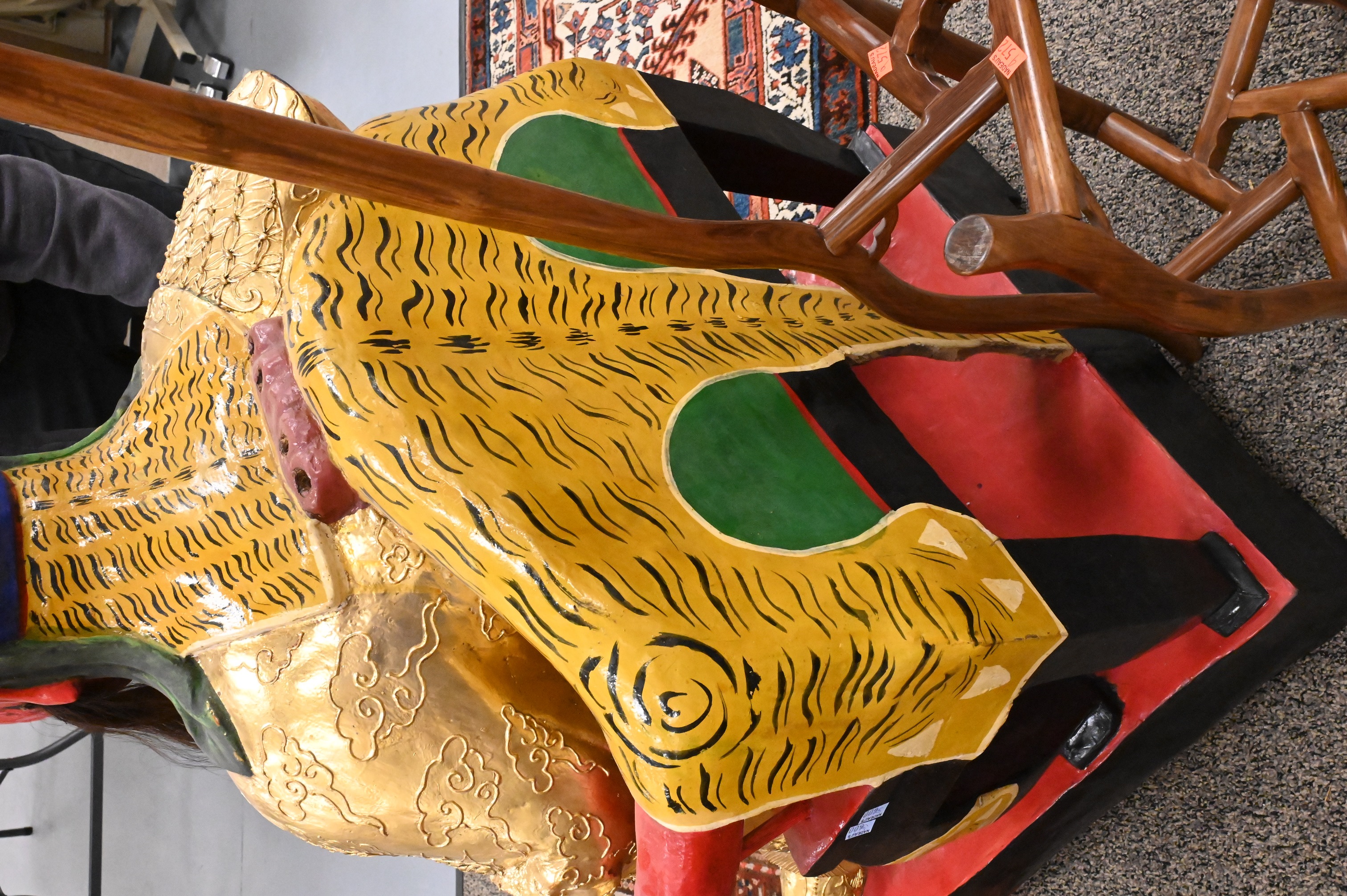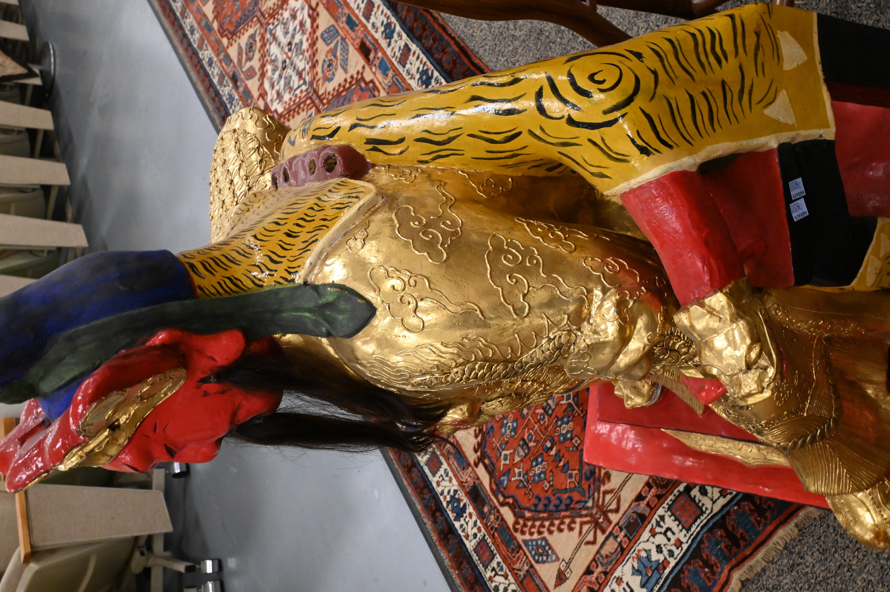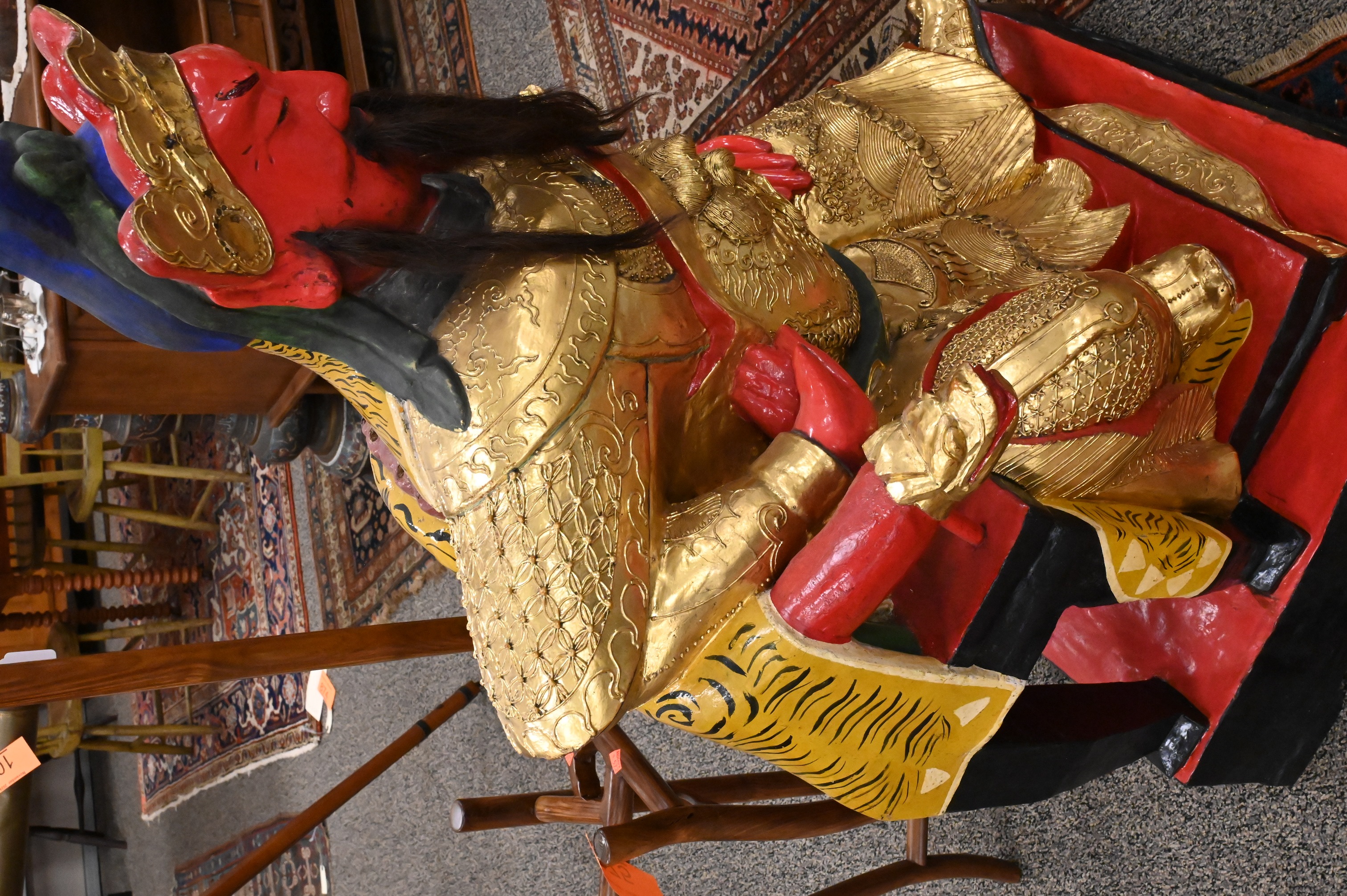 featuring the red painted figure sitting on a polychrome throne with dragon handle accents, lacquered leather horse hair beard, and detailed gilted garb, early 19th century