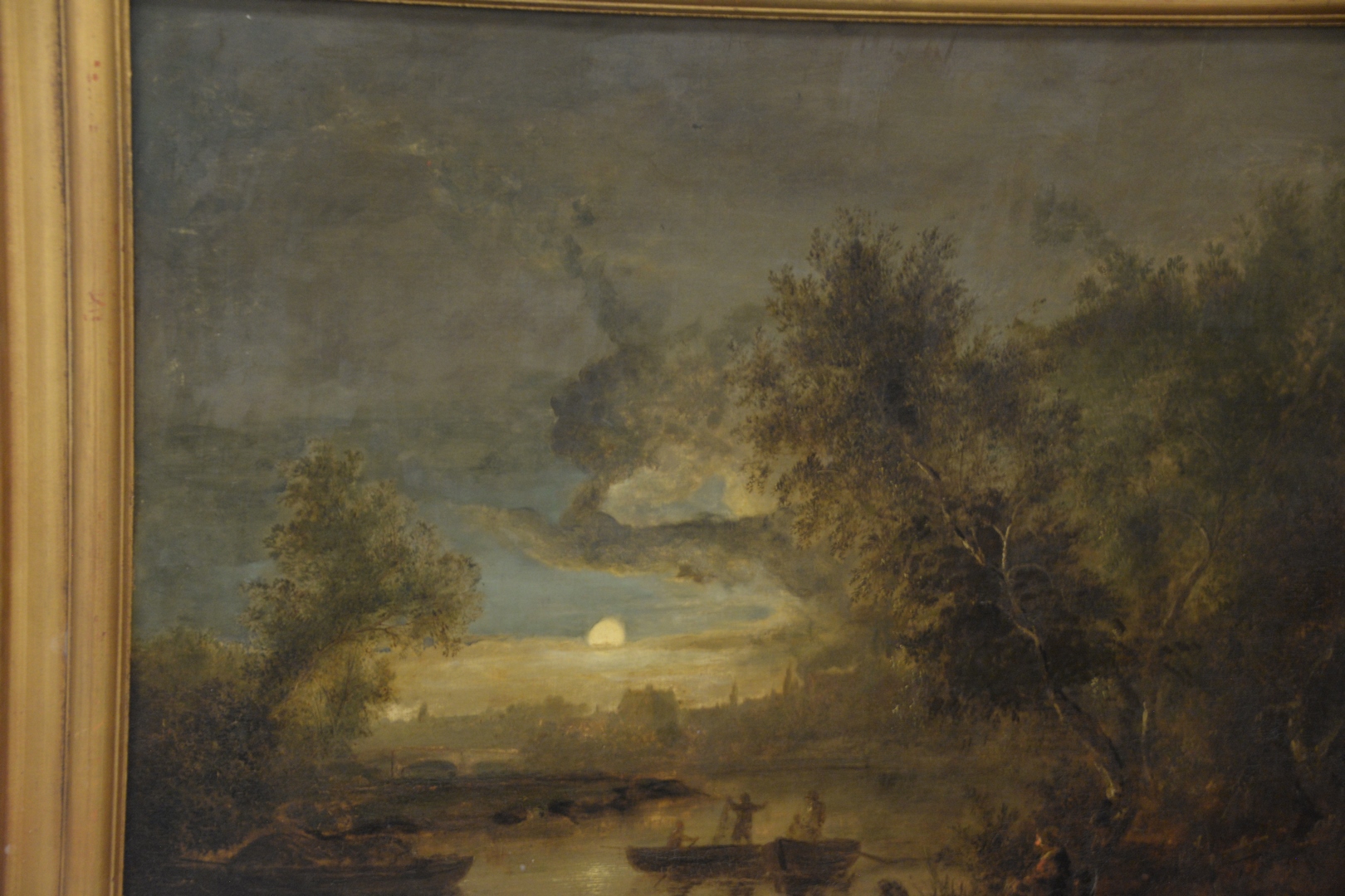 Lot 104: Continental School (19th century), Moonlight Sail, oil on canvas, signed indistinctly lower right, 25″ x 30″.