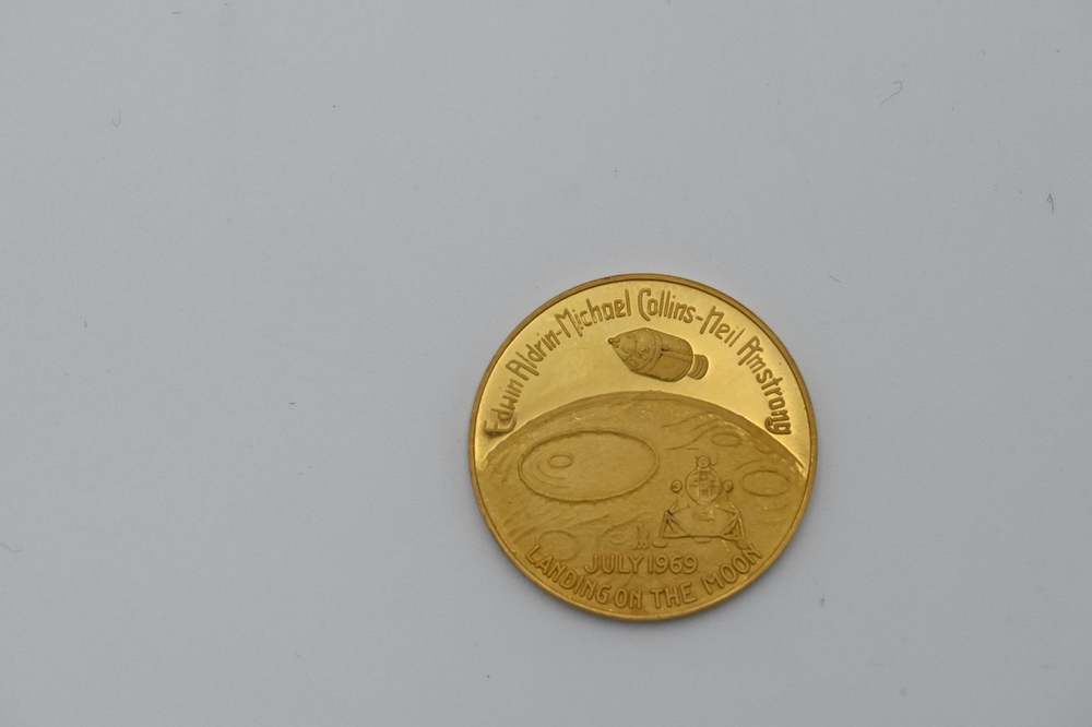 Lot 104: Crew Apollo 11 Gold Medallion, set with 11 sapphires, 12 1/2 grams, 28 millimeters, 21.6 karats. Provenance: Collection of Anton Pee…