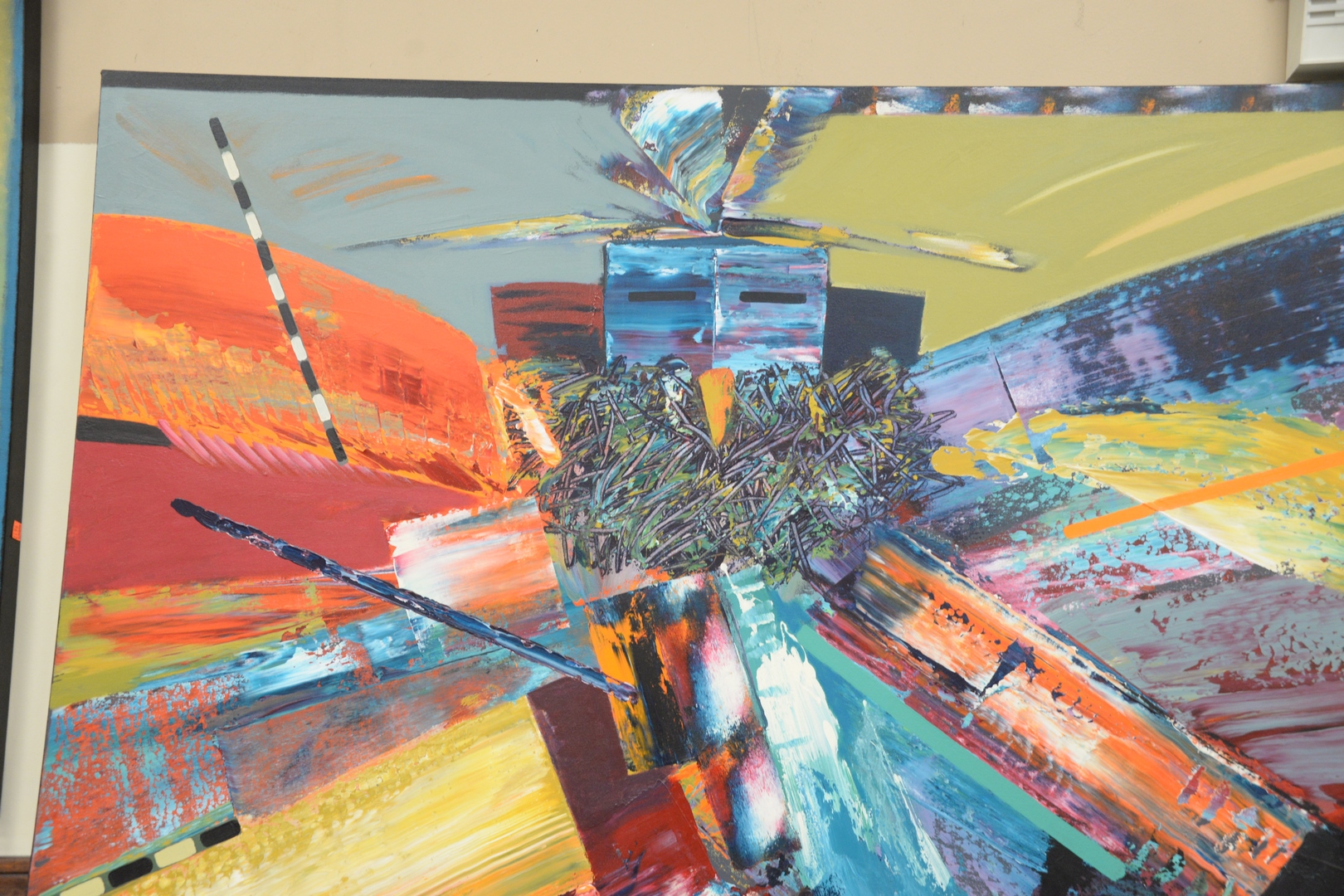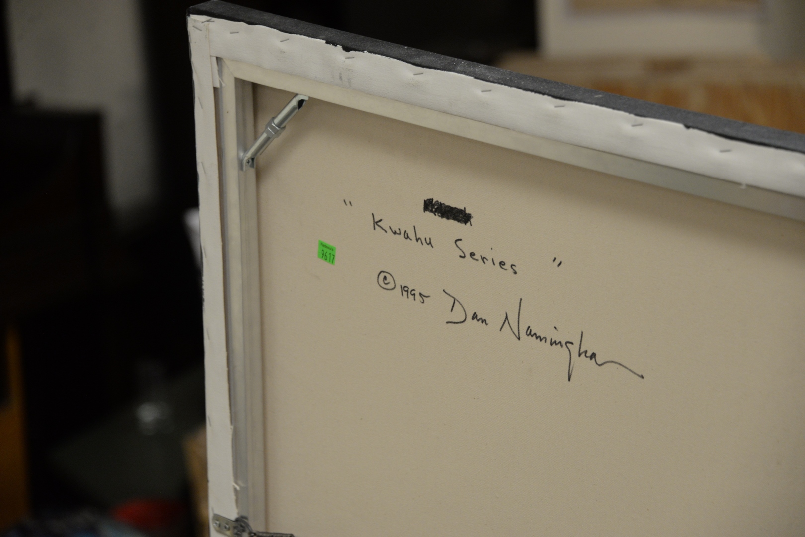 Lot 104: Dan Namingha (American, b. 1950), Kwahu Series, 1995, acrylic on canvas, signed lower left “Namingha”, signed, titled, and dated on the reverse, 60″ x 60″. Susan Duval Gallery label adhered to stretcher bar. Provenance: From the Marjorie & Howard Drubner Collection, Middlebury, Connecticut.