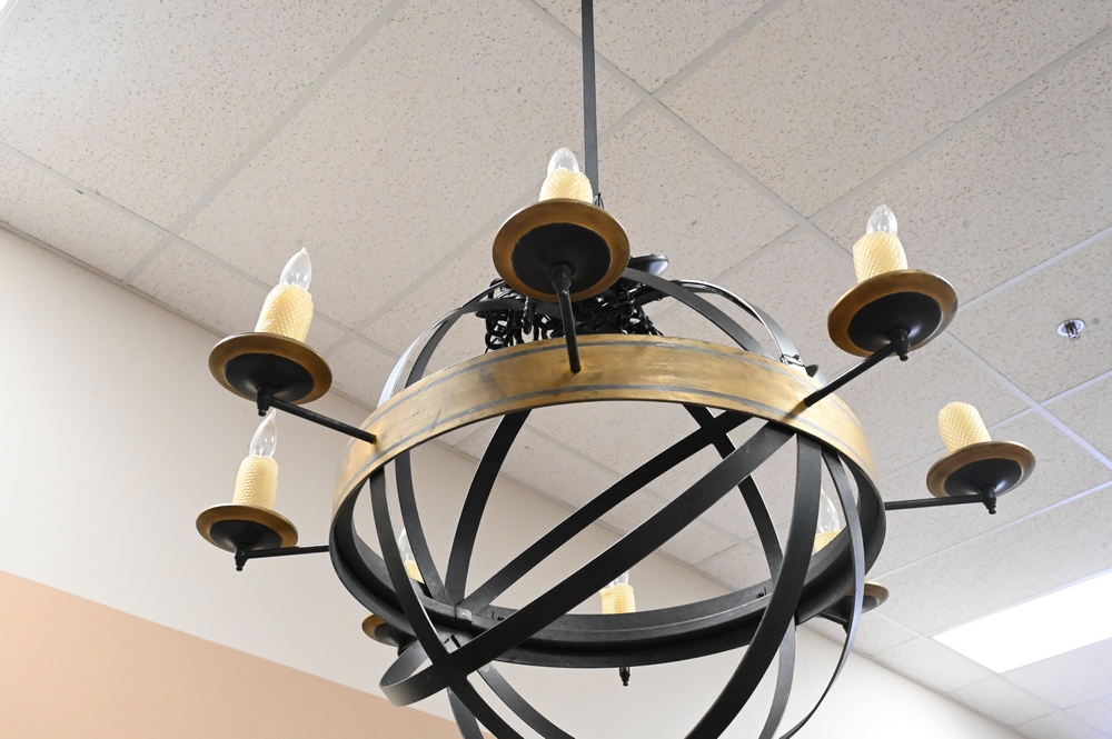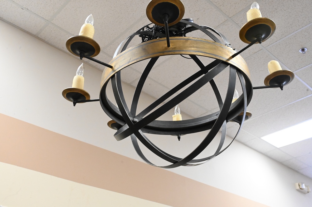 Eight Light Brass and Iron Chandelier, in the form of a sphere (electrified), approximate height 27 inches, approximate diameter 38 inches.