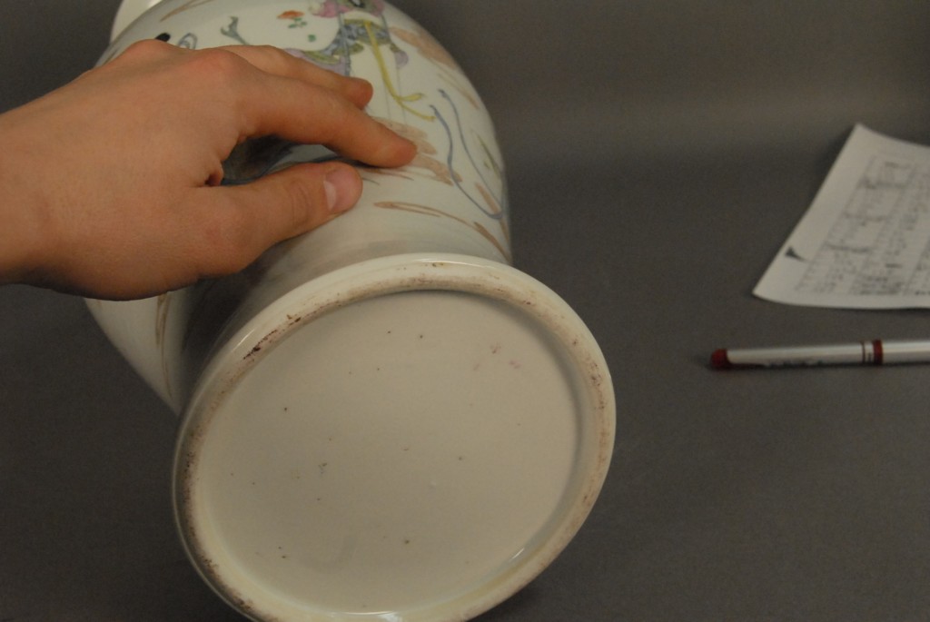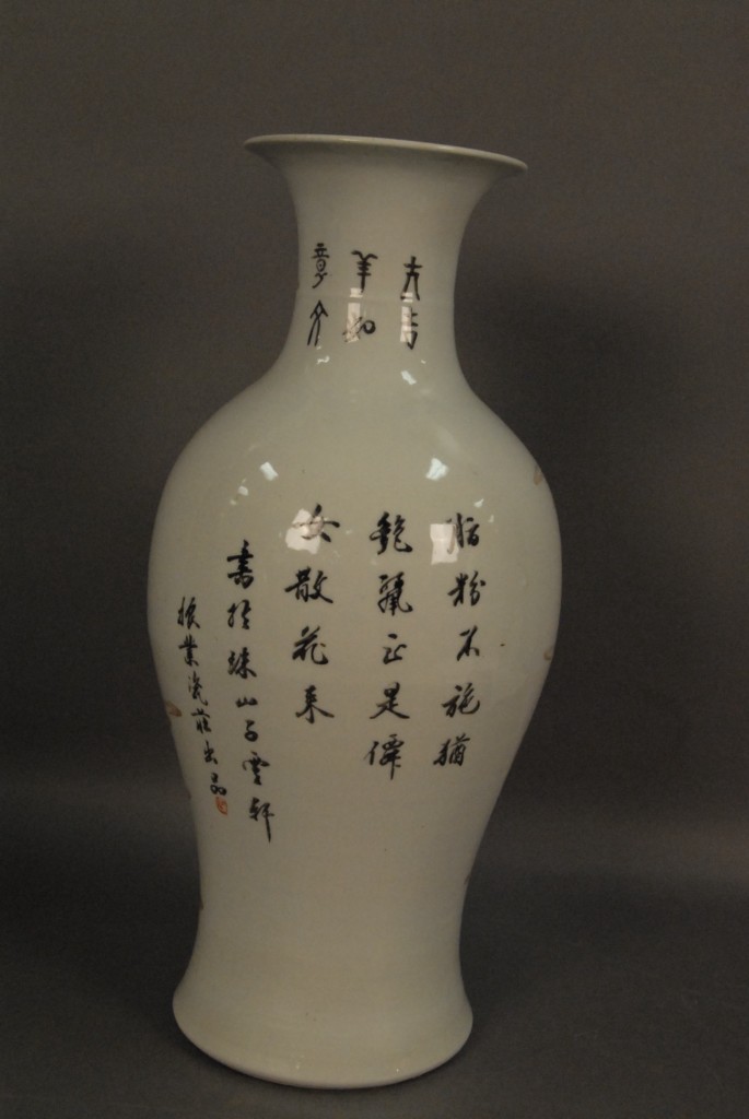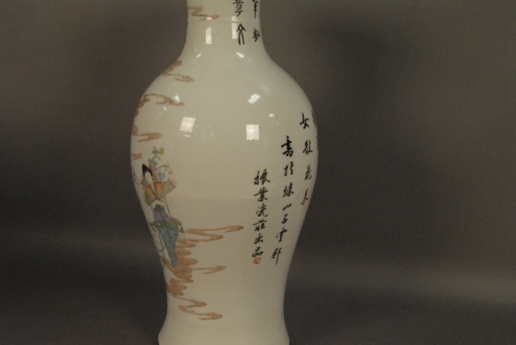 Famille Rose baluster form vase painted with guanyin and swirling clouds, ht 18.